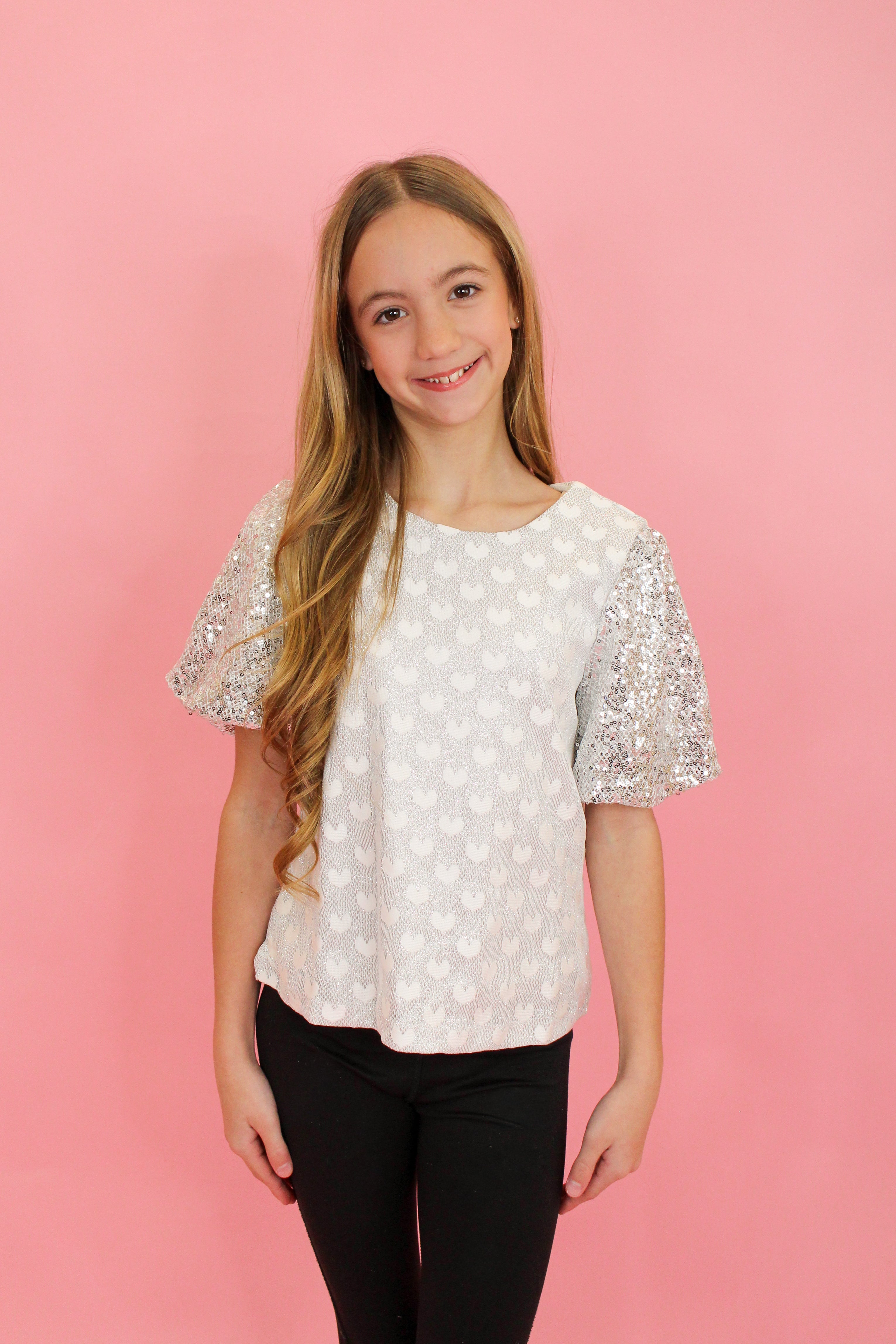 This sweet and sparkly top is perfect for your little fashionista! Designed with a soft white base and subtle heart detailing, this top features eye-catching sequin puff sleeves that add just the right amount of shine. It’s comfortable, lightweight, and perfect for dressing up or styling casually for everyday wear.
