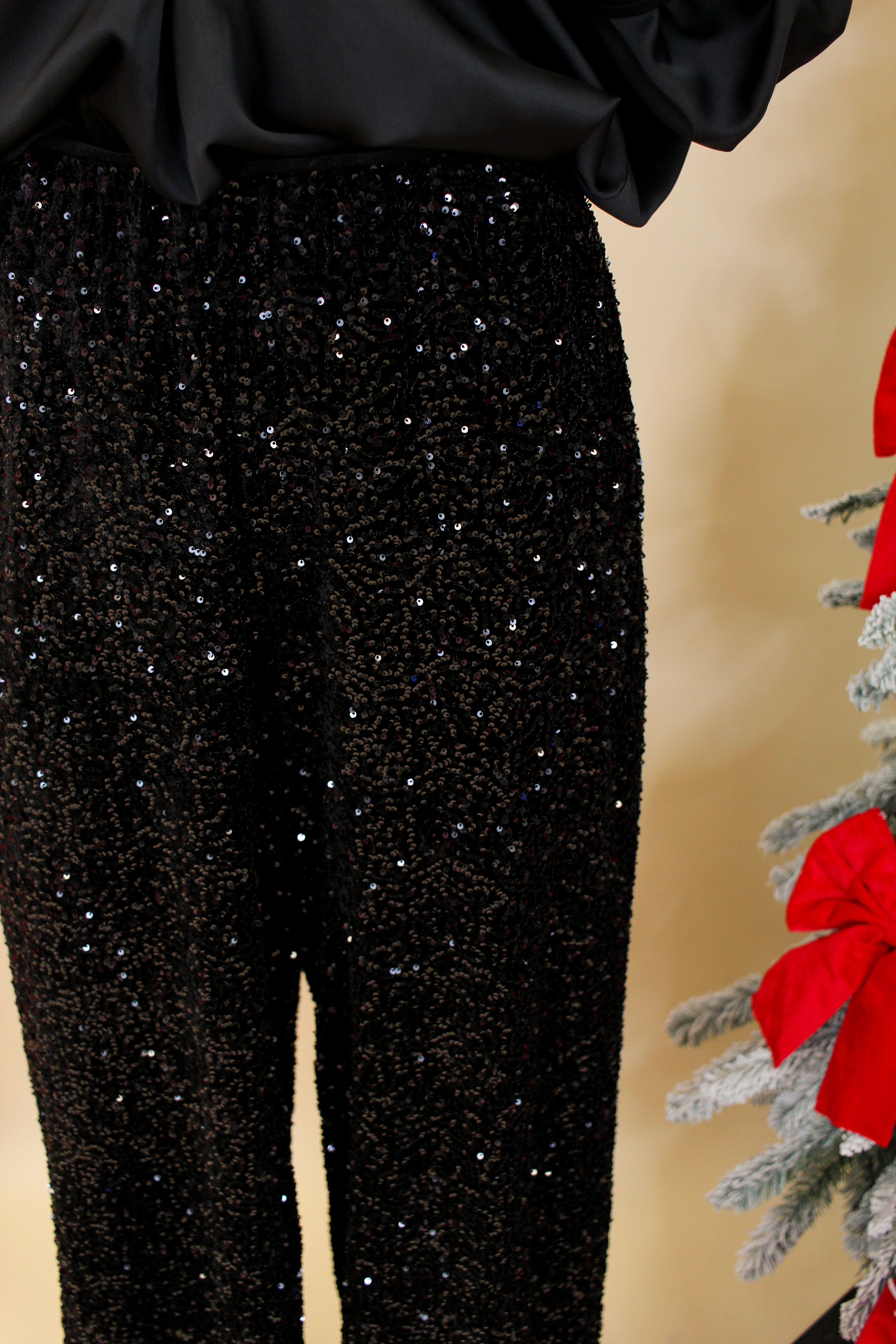 Shine your way through every holiday party, girls' night out, or New Year celebration in these stunning black sequin pants! Fully embellished in shimmering sequins, this pair brings effortless glamour while keeping you comfortable thanks to a soft, stretchy lining and relaxed wide-leg silhouette.