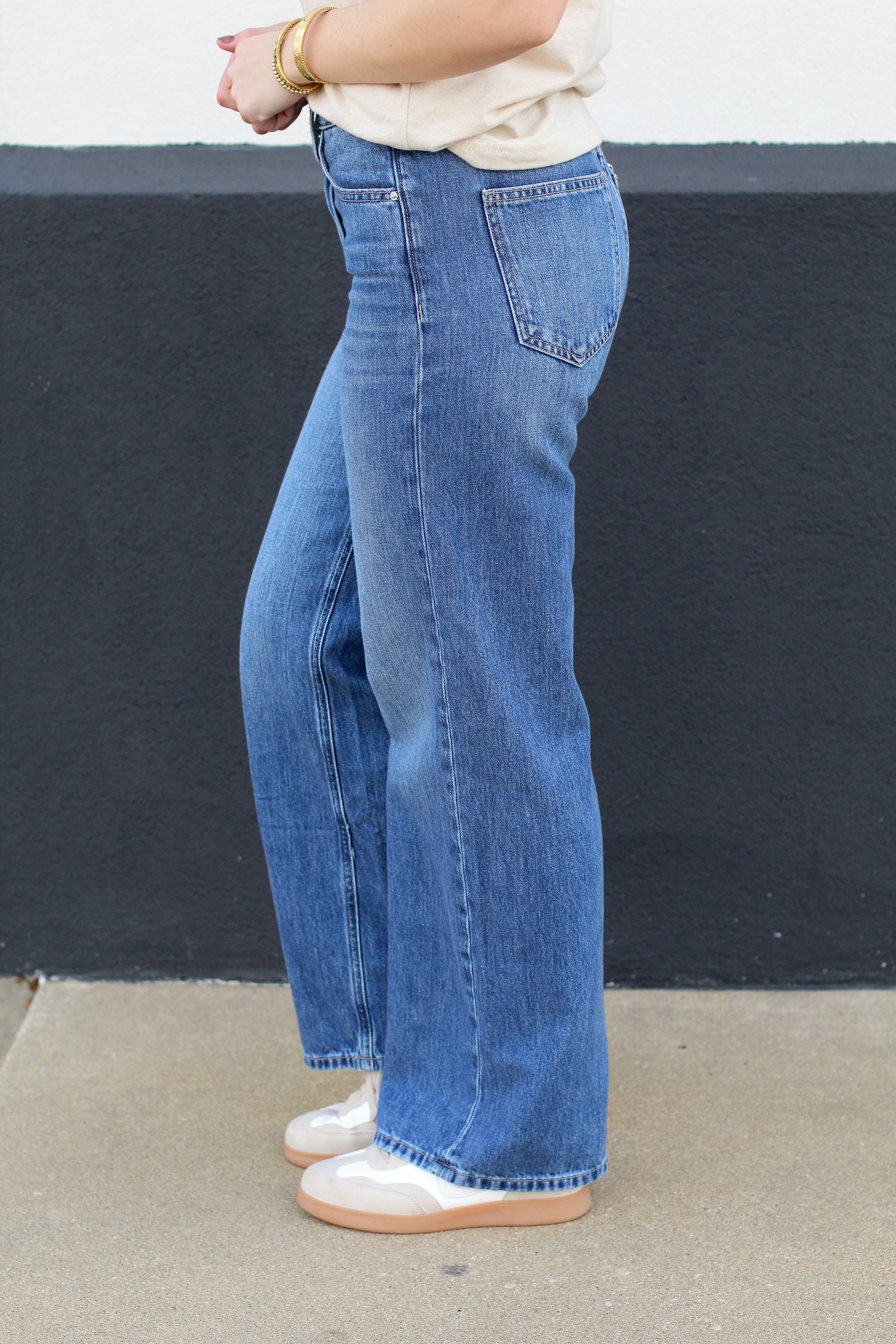 These vintage-inspired wide leg jeans are a must-have for effortless, everyday style. Featuring a flattering high-rise waist and a relaxed wide leg silhouette, they give you that perfectly broken-in denim look with a structured feel. Easy to dress up or down, these jeans pair seamlessly with everything from fitted tanks to cozy sweaters.