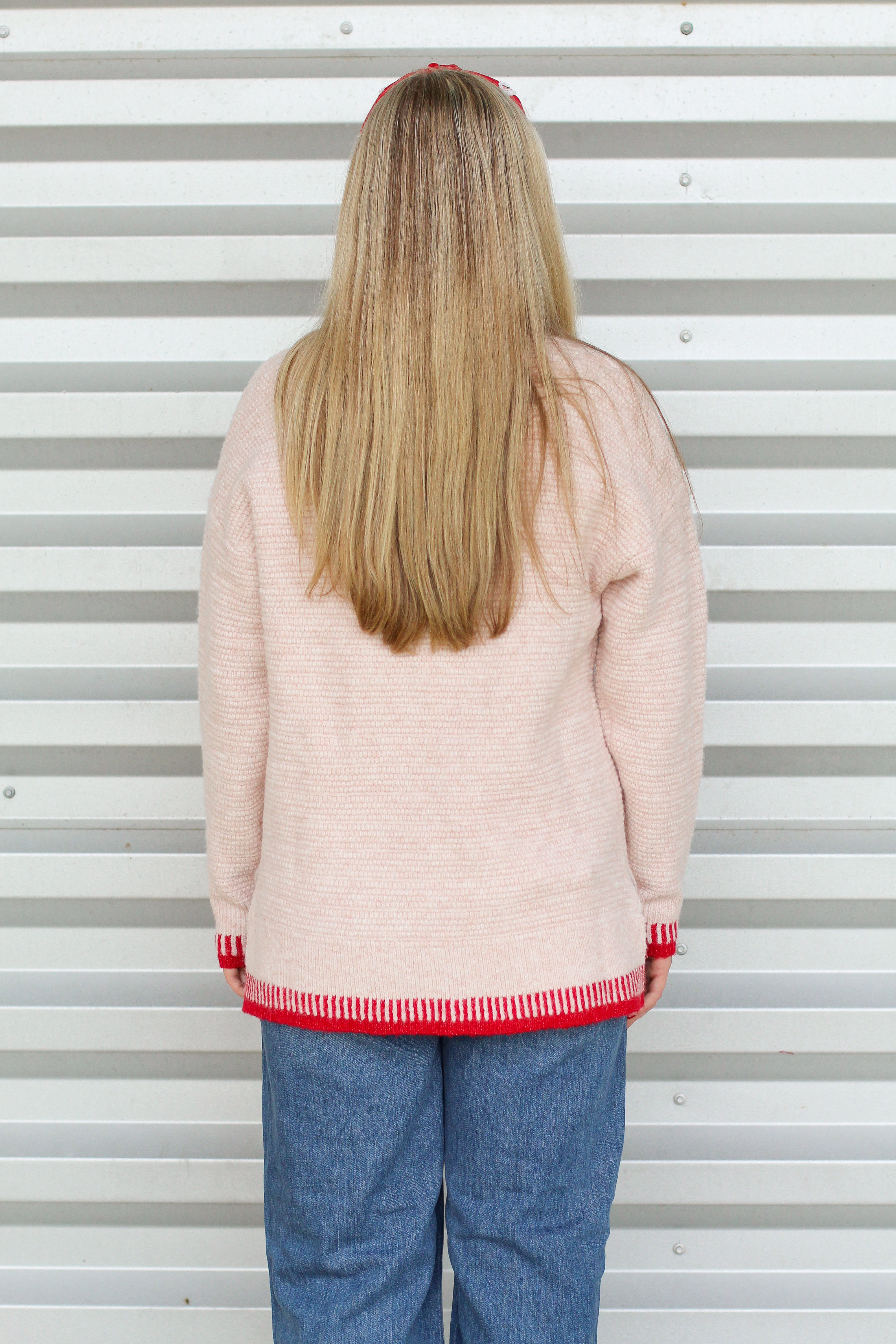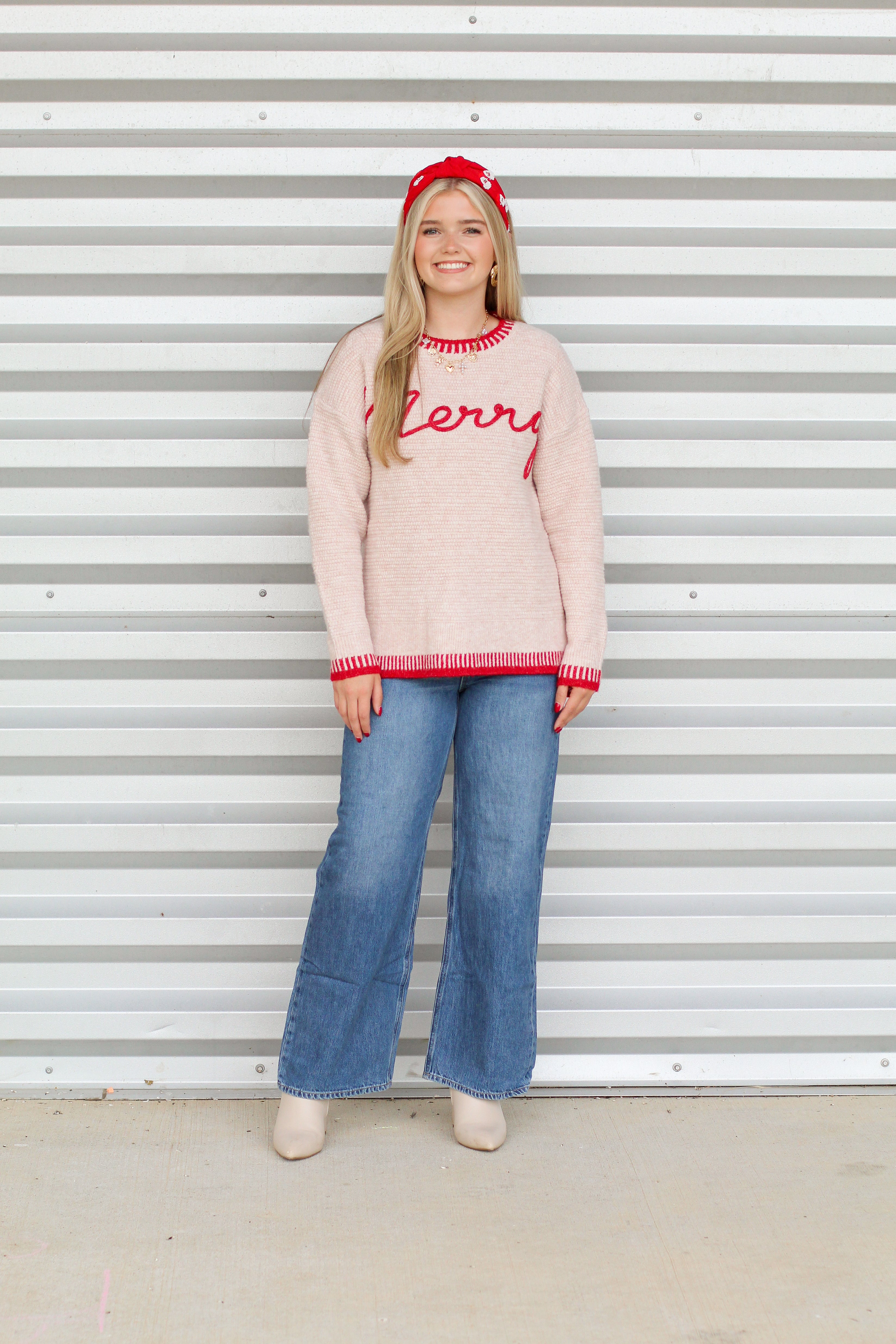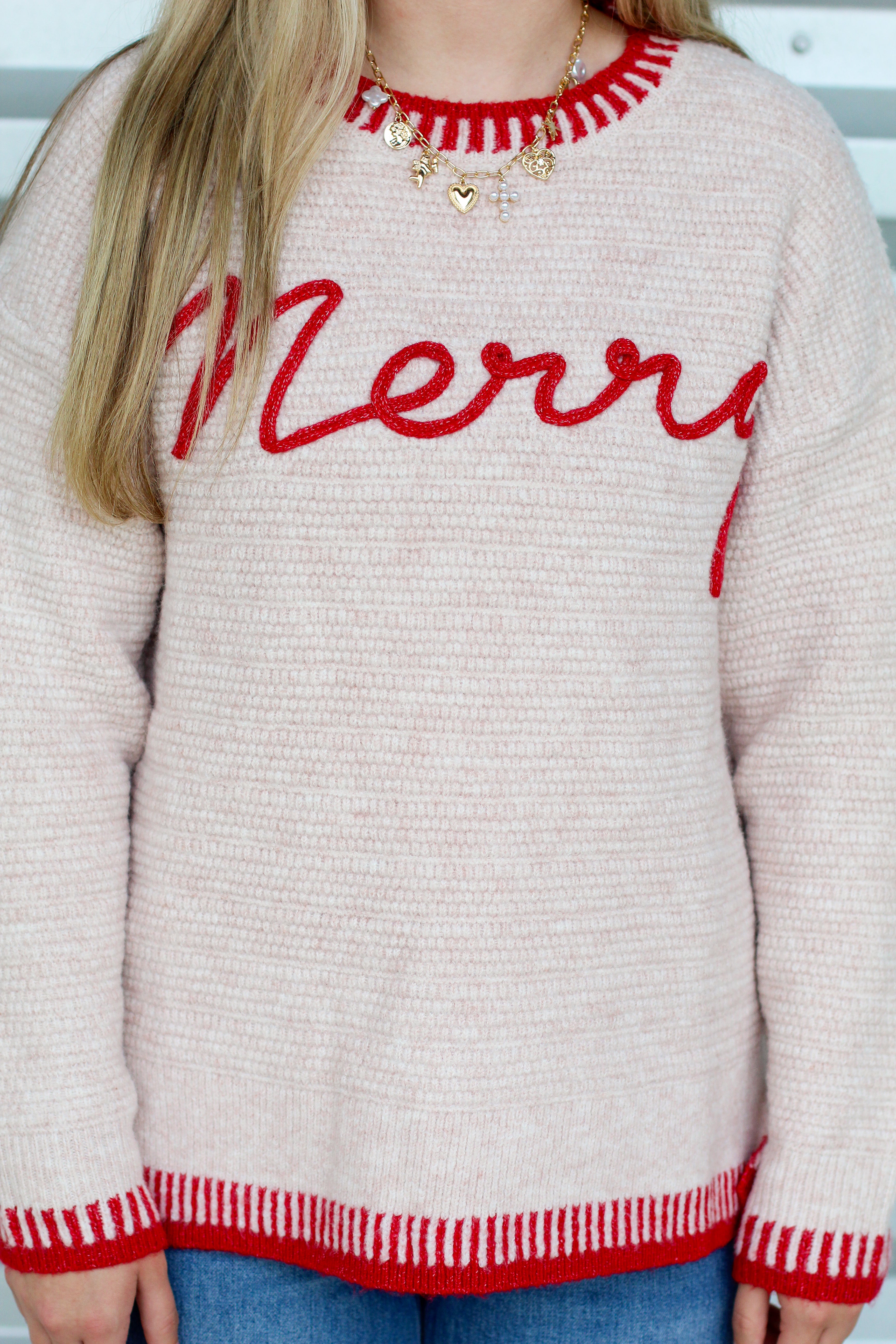 Get in the holiday spirit with our Merry Sweater! This soft, cozy knit features a blush base with bold red chenille lettering and festive trim detailing. The relaxed fit makes it perfect for pairing with denim, leggings, or holiday skirts — cute, comfy, and merry all season long!