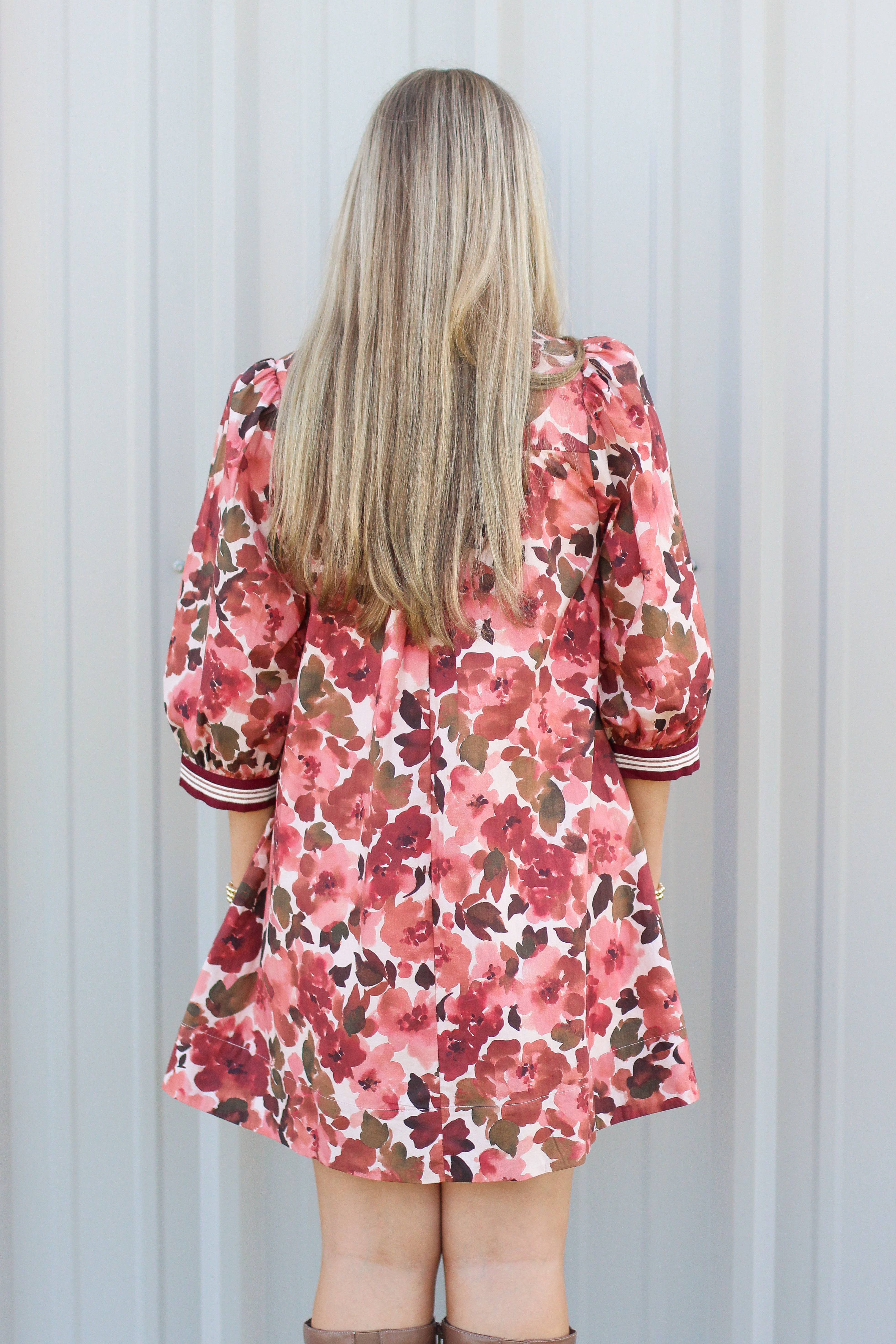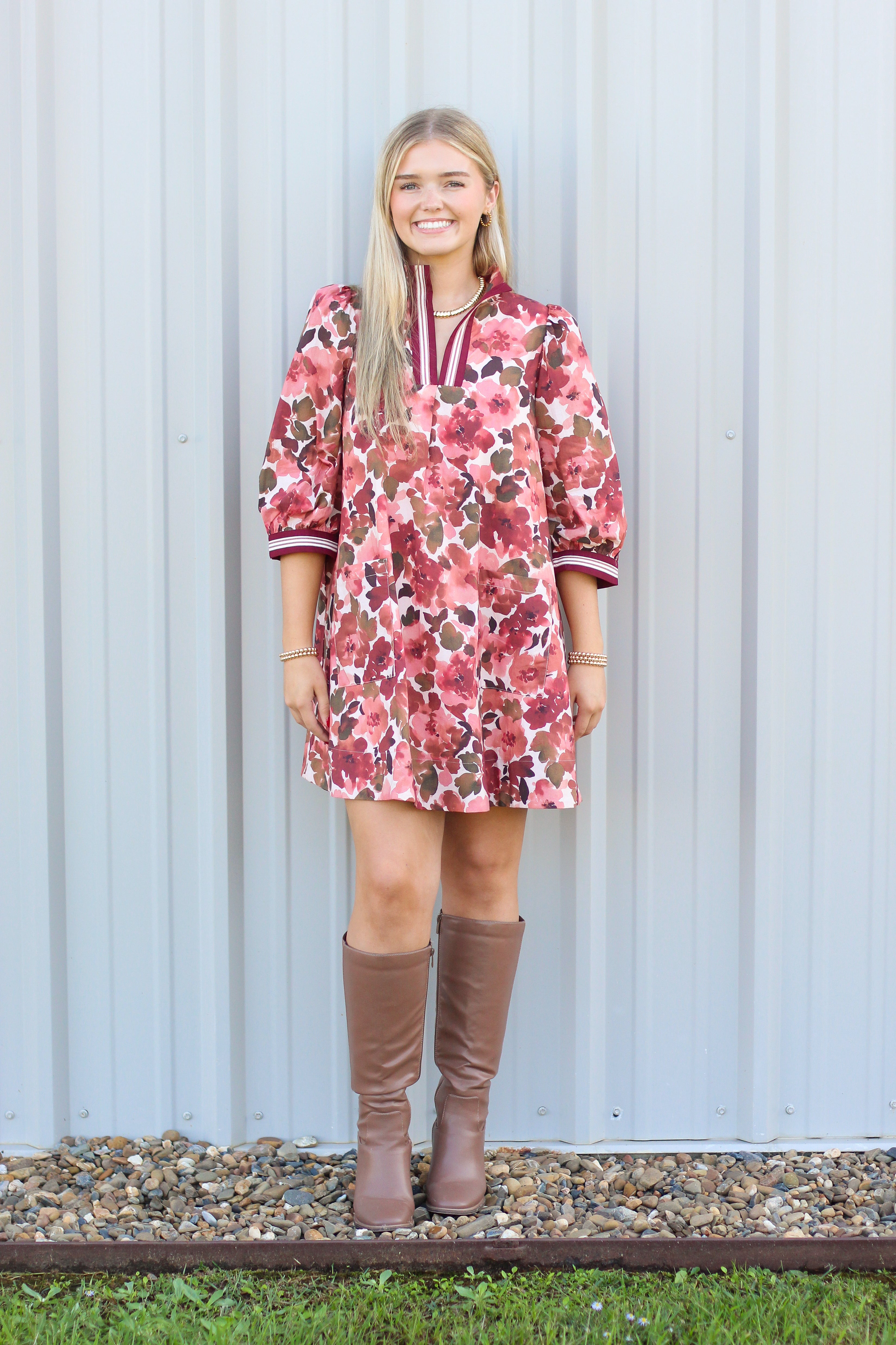 Fresh florals meet effortless charm in our Floral Cotton Collared Dress! Featuring a soft pink and wine floral print, this dress has a relaxed silhouette with front patch pockets, balloon sleeves, and a striped contrast neckline and cuff detail for a touch of sophistication. Its 100% cotton fabric keeps you cool and comfortable — perfect for church, brunch, or a day out.