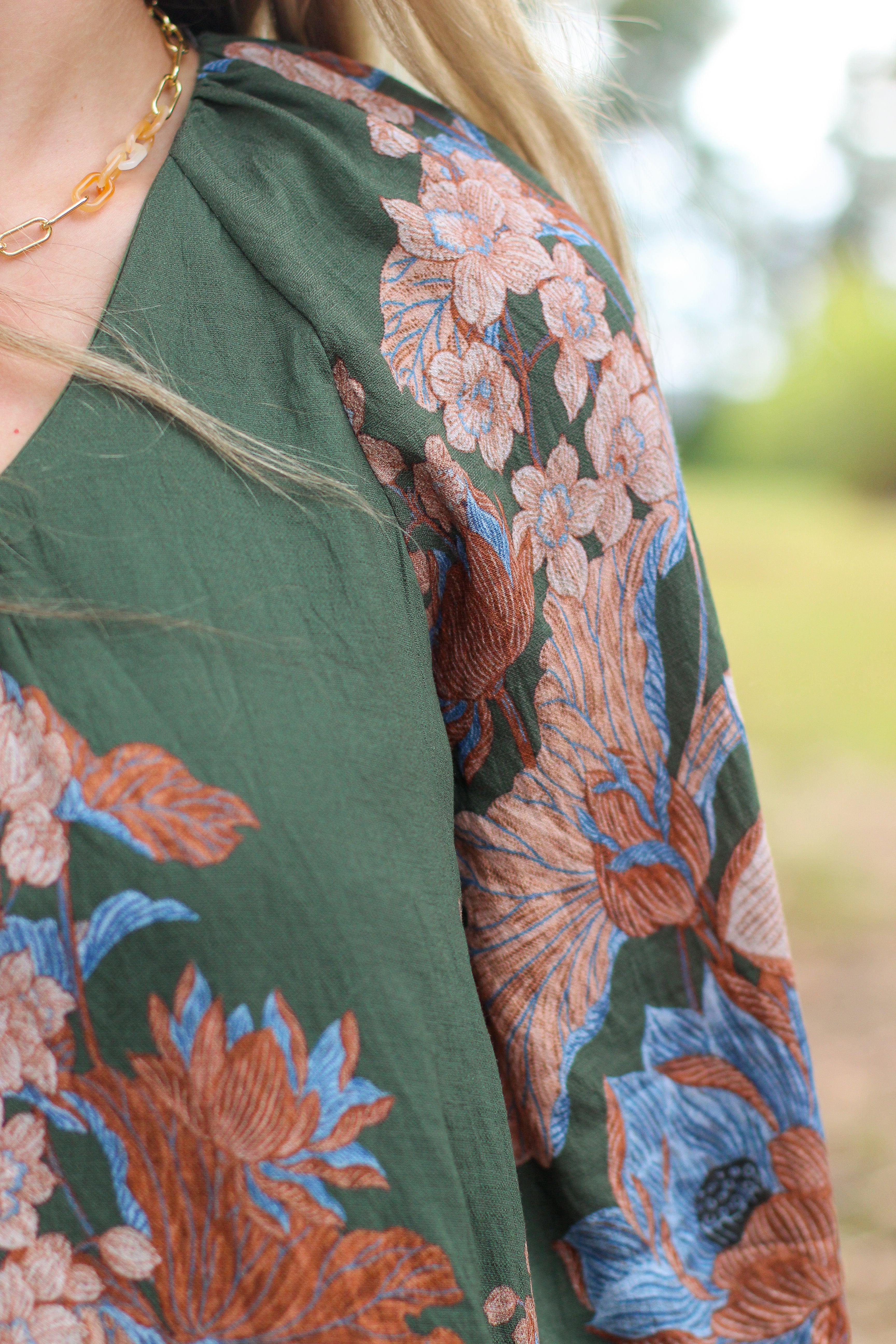 Fall florals done right! Our Olive Floral Long Sleeve Dress features a stunning mix of rust, blue, and blush tones against an olive green background for the perfect autumn statement. Designed with a flowy silhouette, gathered neckline, and tie-cuff sleeves for a soft, feminine finish — this dress transitions beautifully from brunch to evening events.