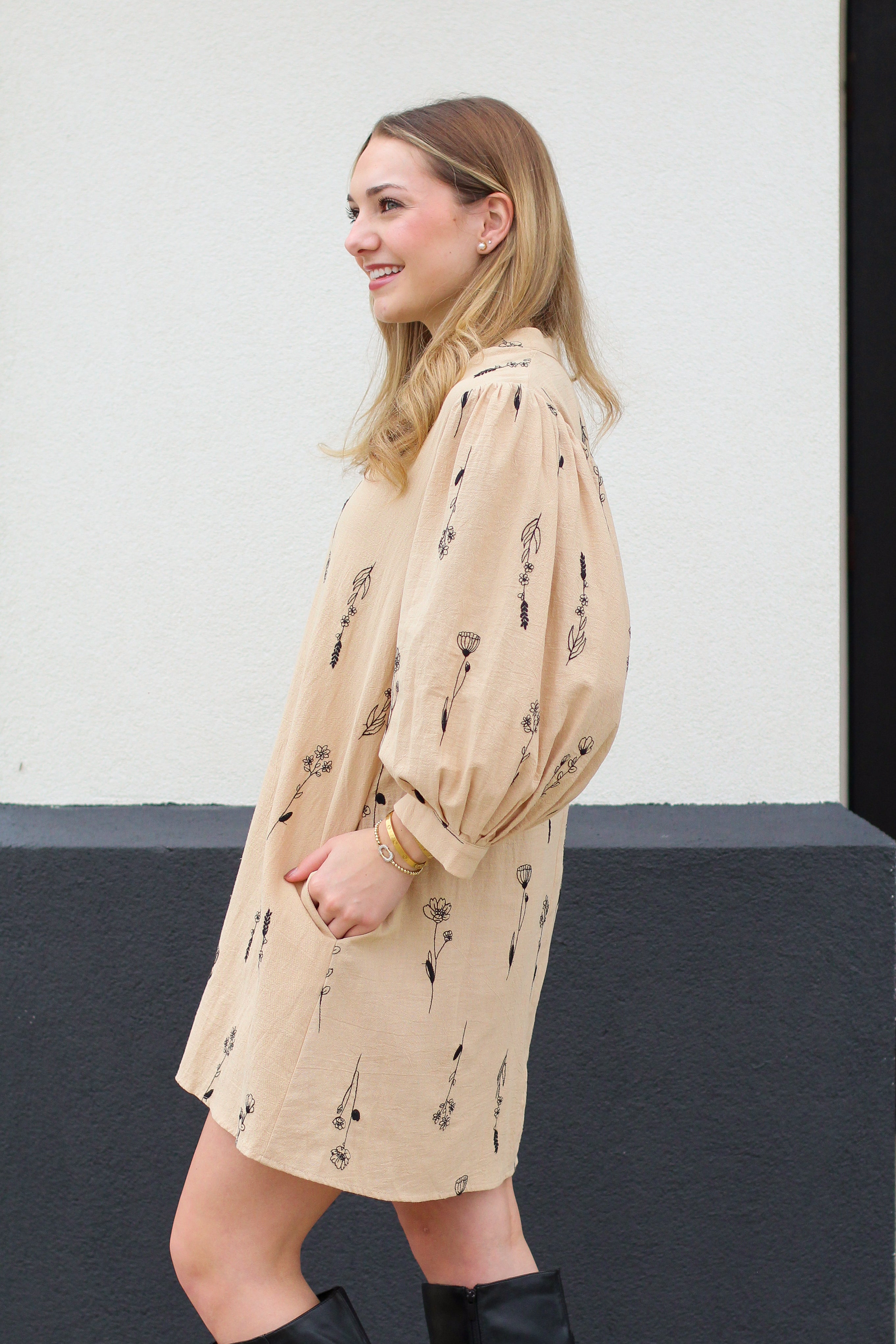 Easy, feminine, and effortlessly chic — this floral puff sleeve dress is the perfect throw-on-and-go piece for any season. Featuring a soft neutral base with delicate floral detailing, this dress has a relaxed silhouette that flatters while keeping you comfortable all day long. The puff sleeves add just the right amount of charm, making it easy to dress up with boots or keep casual with flats.