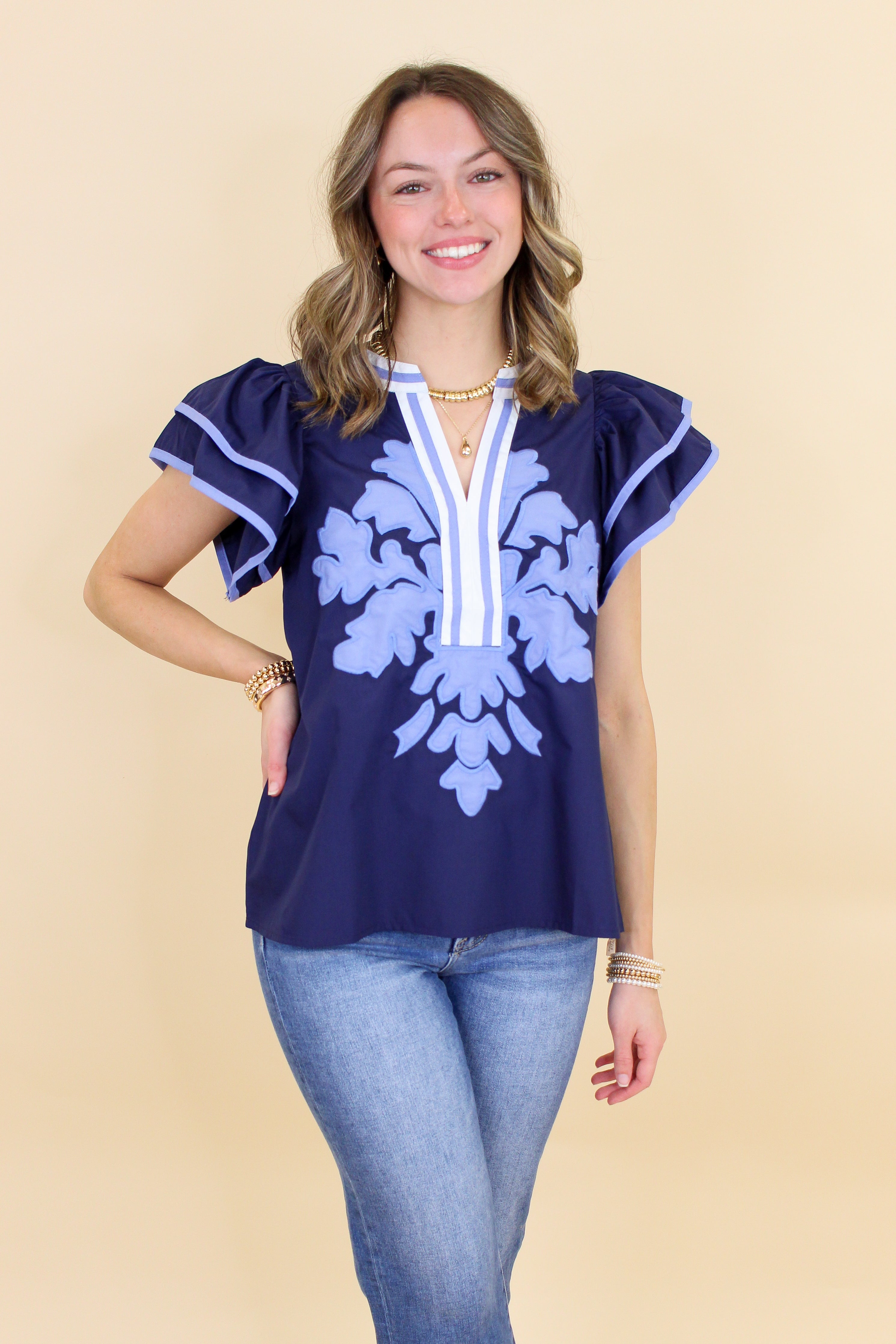This navy embroidered top is the perfect mix of timeless and bold! Featuring a stunning two-tone embroidered design across the front, a structured V-neckline with contrast trim, and flutter sleeves for a feminine touch — this top brings effortless style to any outfit. The soft yet durable fabric blend ensures all-day comfort with a polished look.