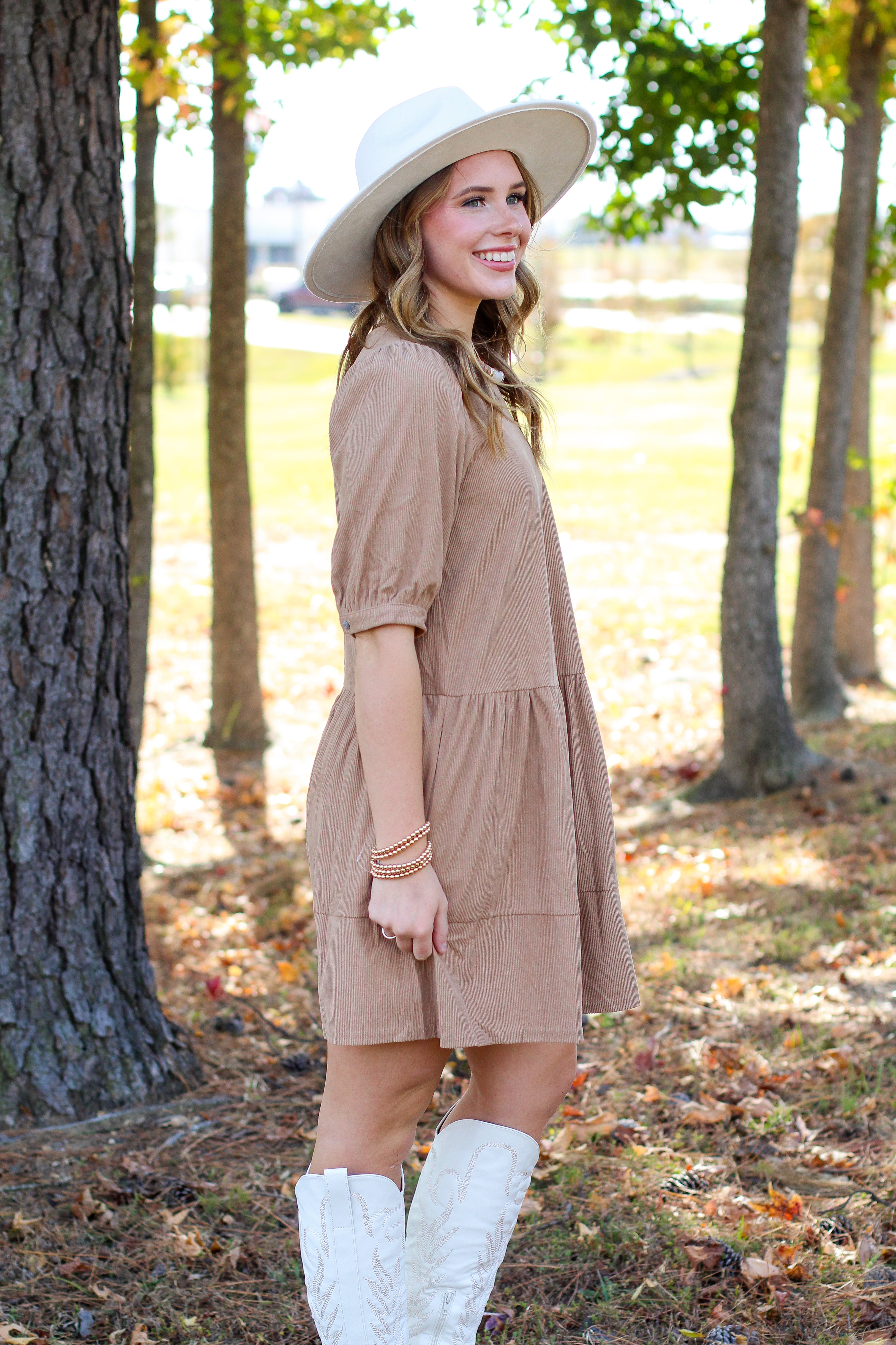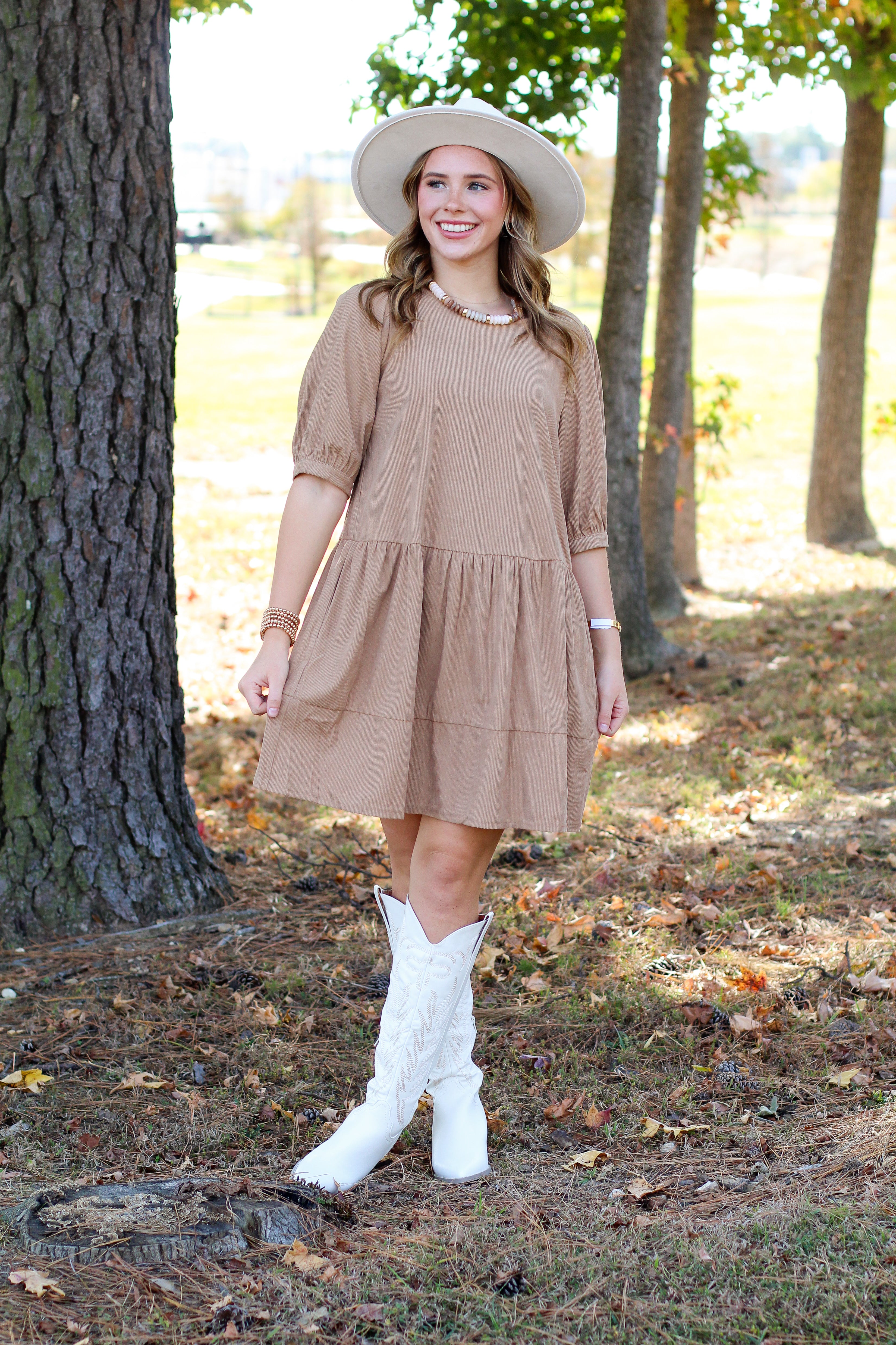 Effortlessly chic and cozy for fall, this tiered corduroy dress is a timeless favorite! With its soft texture and easy silhouette, it’s perfect for everything from Sunday brunch to fall photoshoots. Pair it with boots and a hat for the ultimate autumn look.