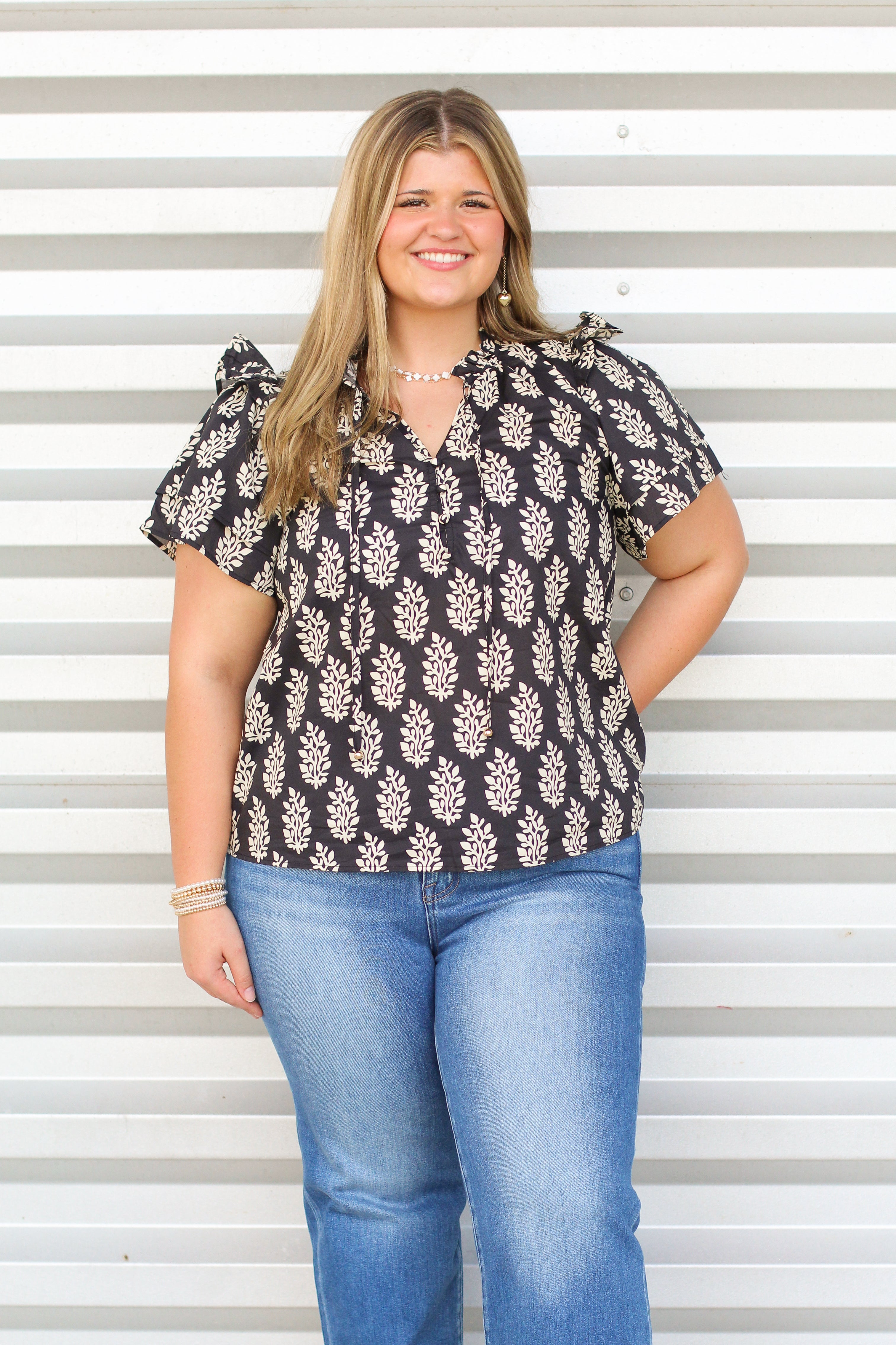 This printed puff sleeve top adds a feminine and elevated touch to your everyday style. Featuring a relaxed fit, short flutter sleeves, and a tie neckline with subtle ruffle detailing, it’s both comfortable and chic. The lightweight cotton fabric makes it breathable and perfect for wearing year-round — whether you’re dressing it up for work or keeping it casual for the weekend.