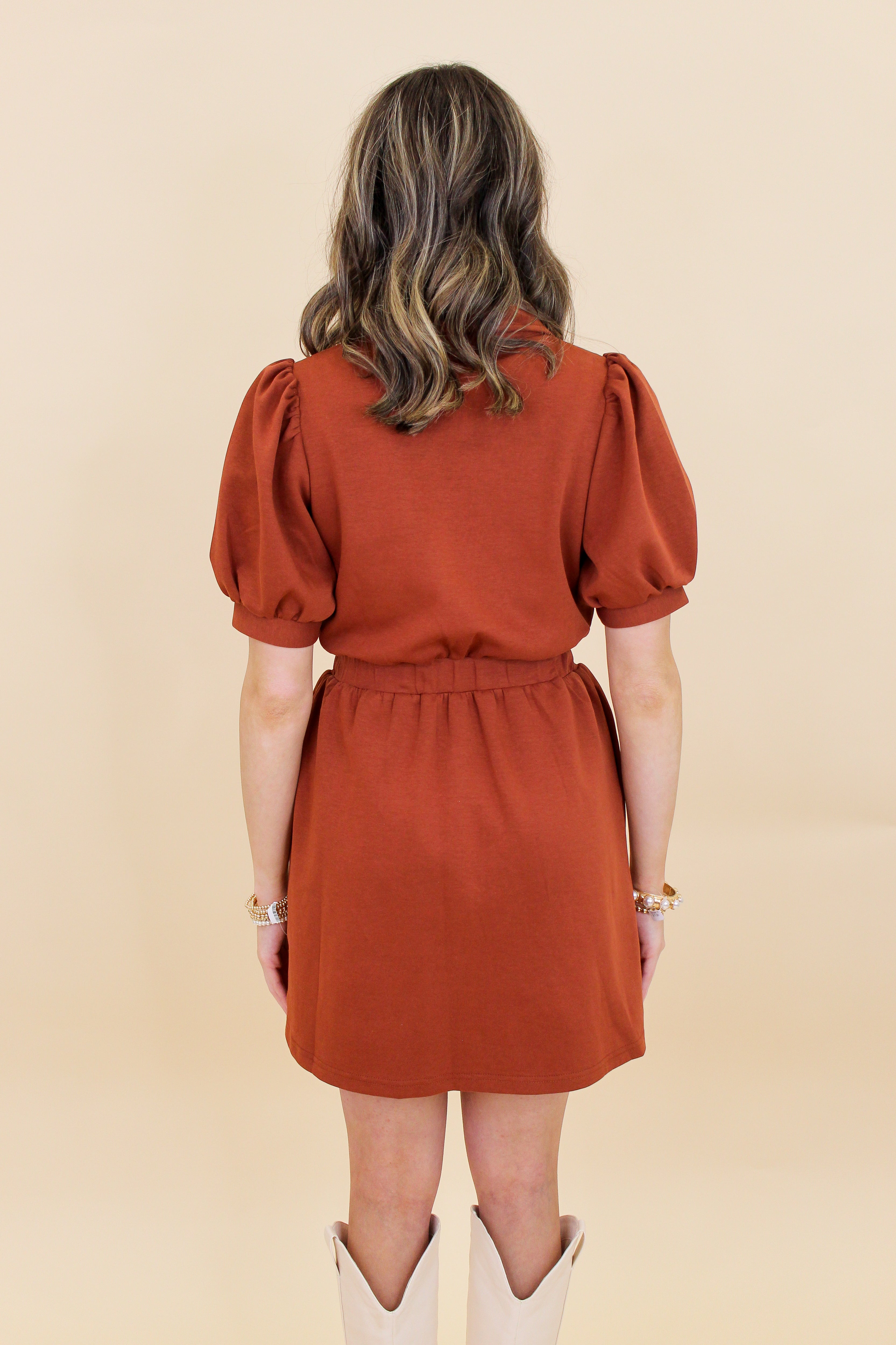 This rust dress is the definition of chic meets casual! Featuring puff sleeves, a flattering elastic waistline, and a full zip-front detail, this piece gives a sporty yet polished vibe. The soft, stretchy fabric blend offers the perfect mix of comfort and structure—making it your new go-to for fall outings or weekend events.