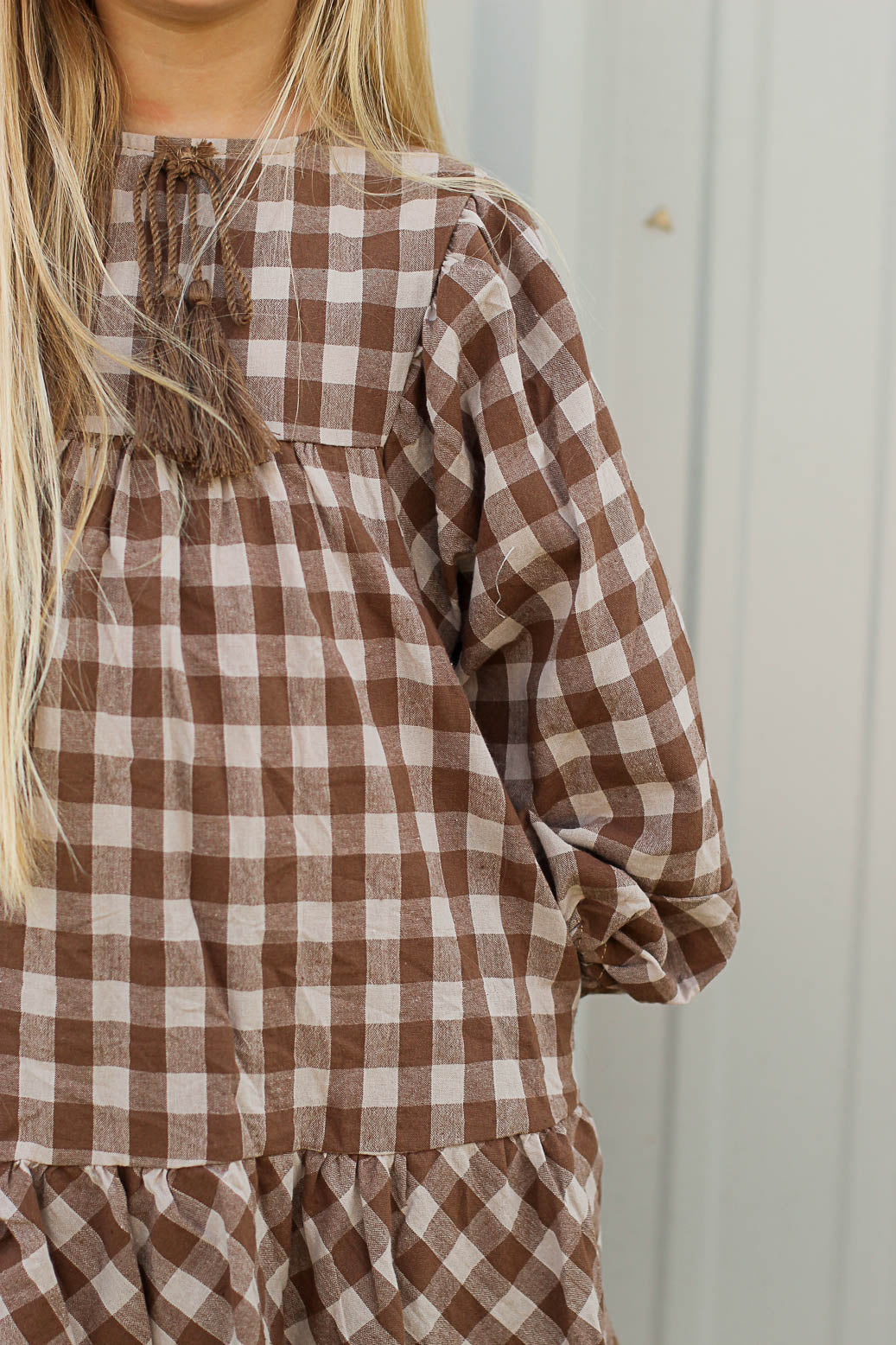 A classic fall favorite with timeless Southern charm! Our Sweet Gingham Tiered Dress features a soft brown-and-cream checkered print, long sleeves, and a flowy tiered skirt for the perfect twirl factor. The lightweight cotton fabric keeps it comfy for all-day wear — whether she’s at a family gathering, school event, or Sunday brunch.