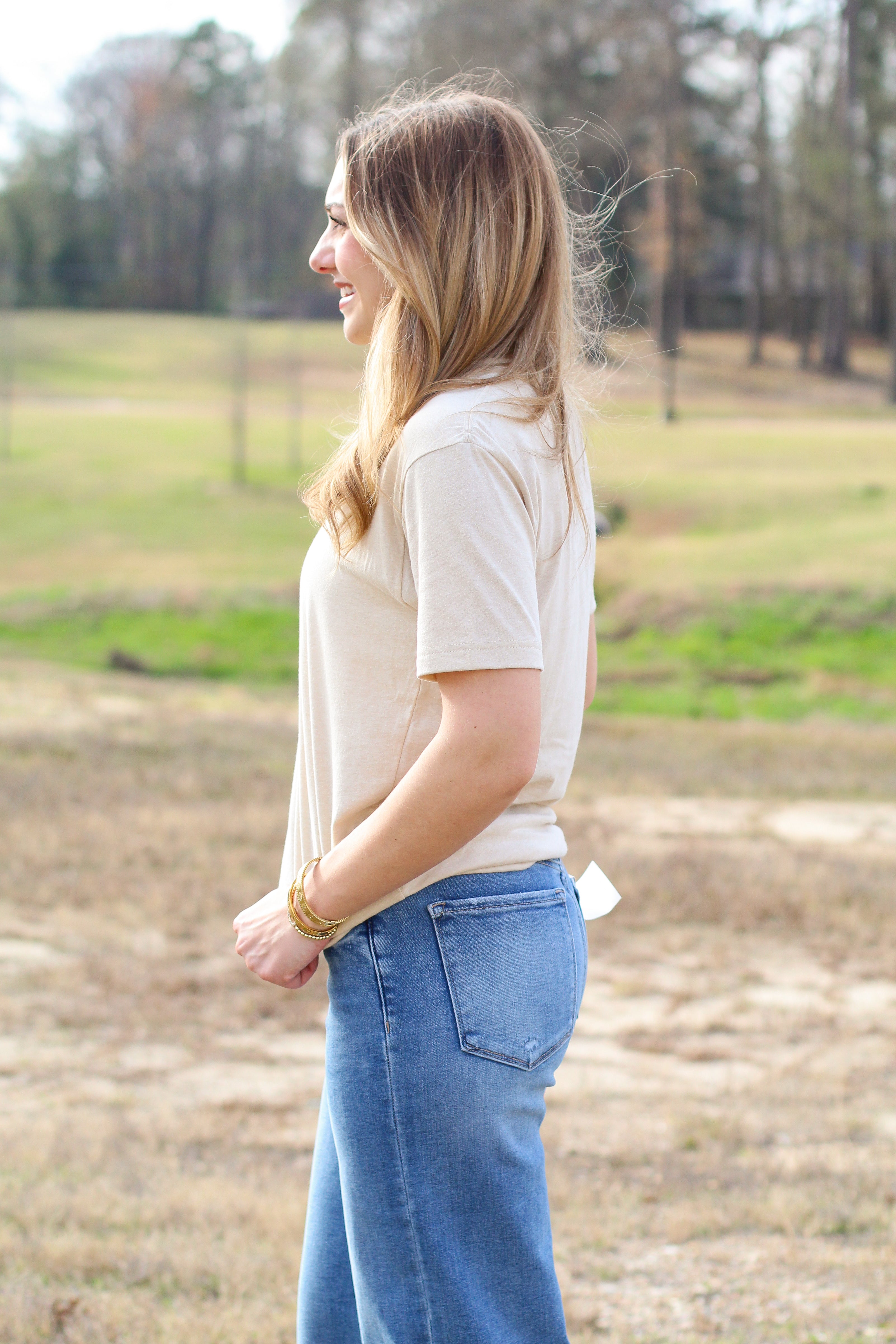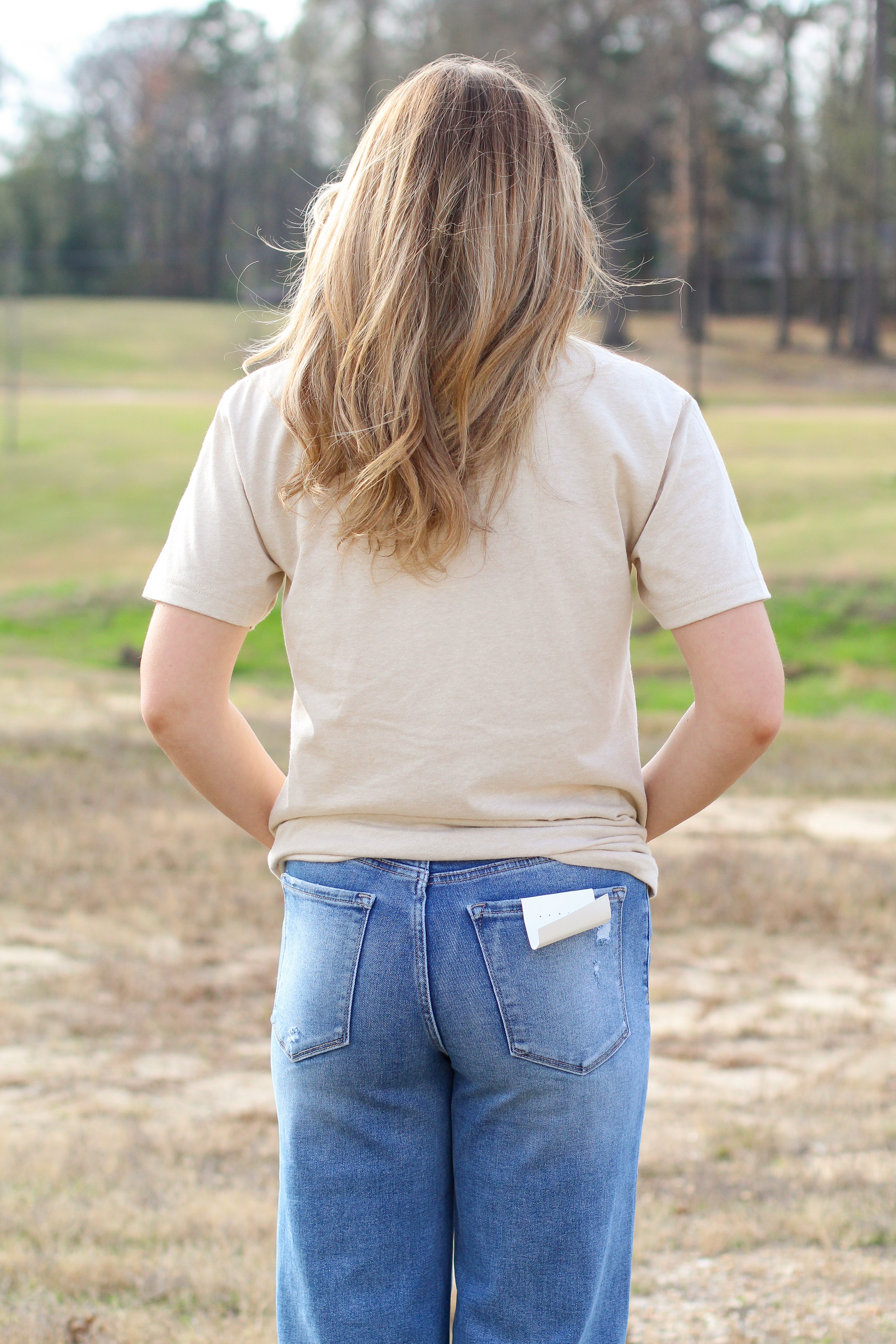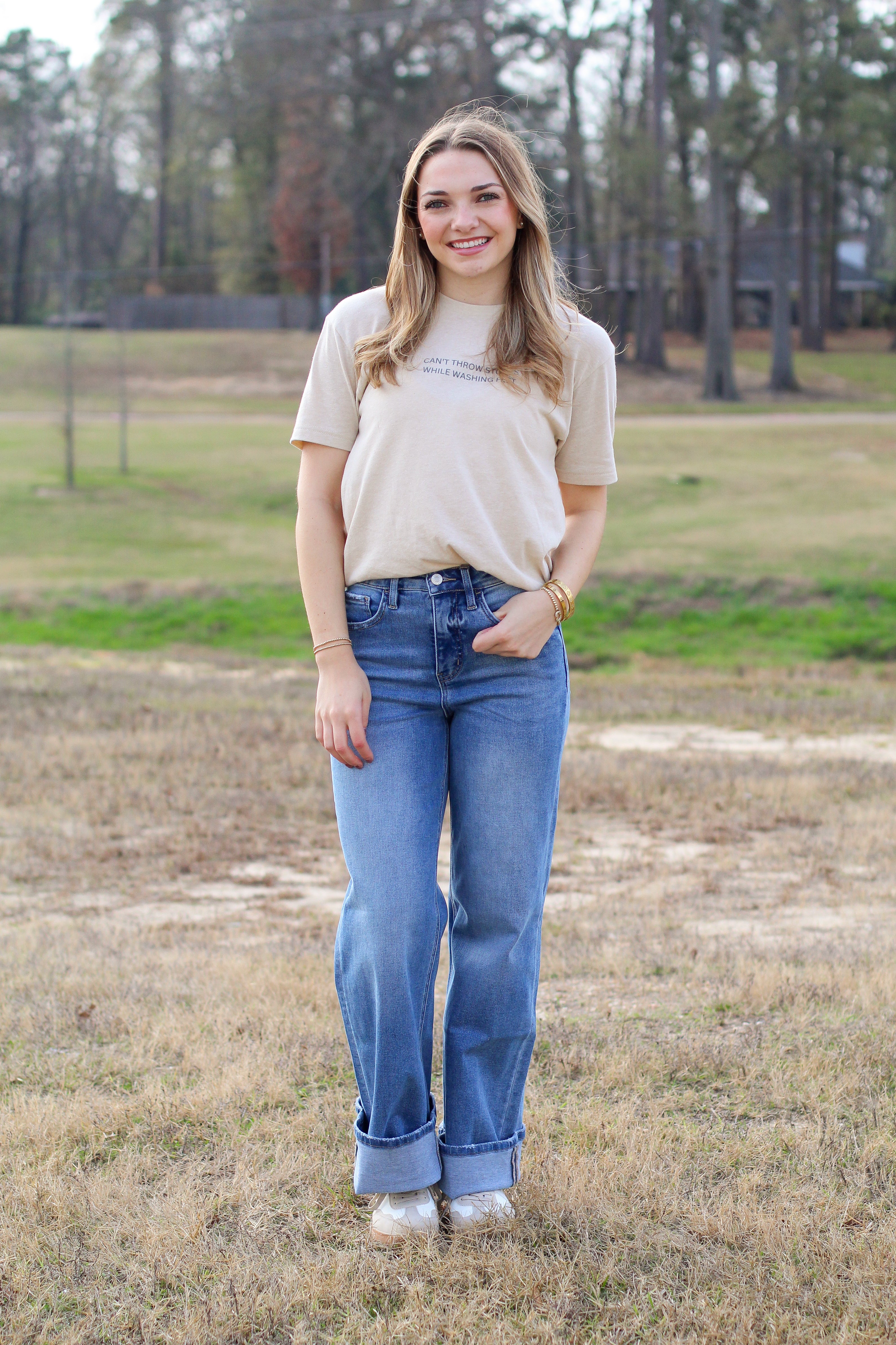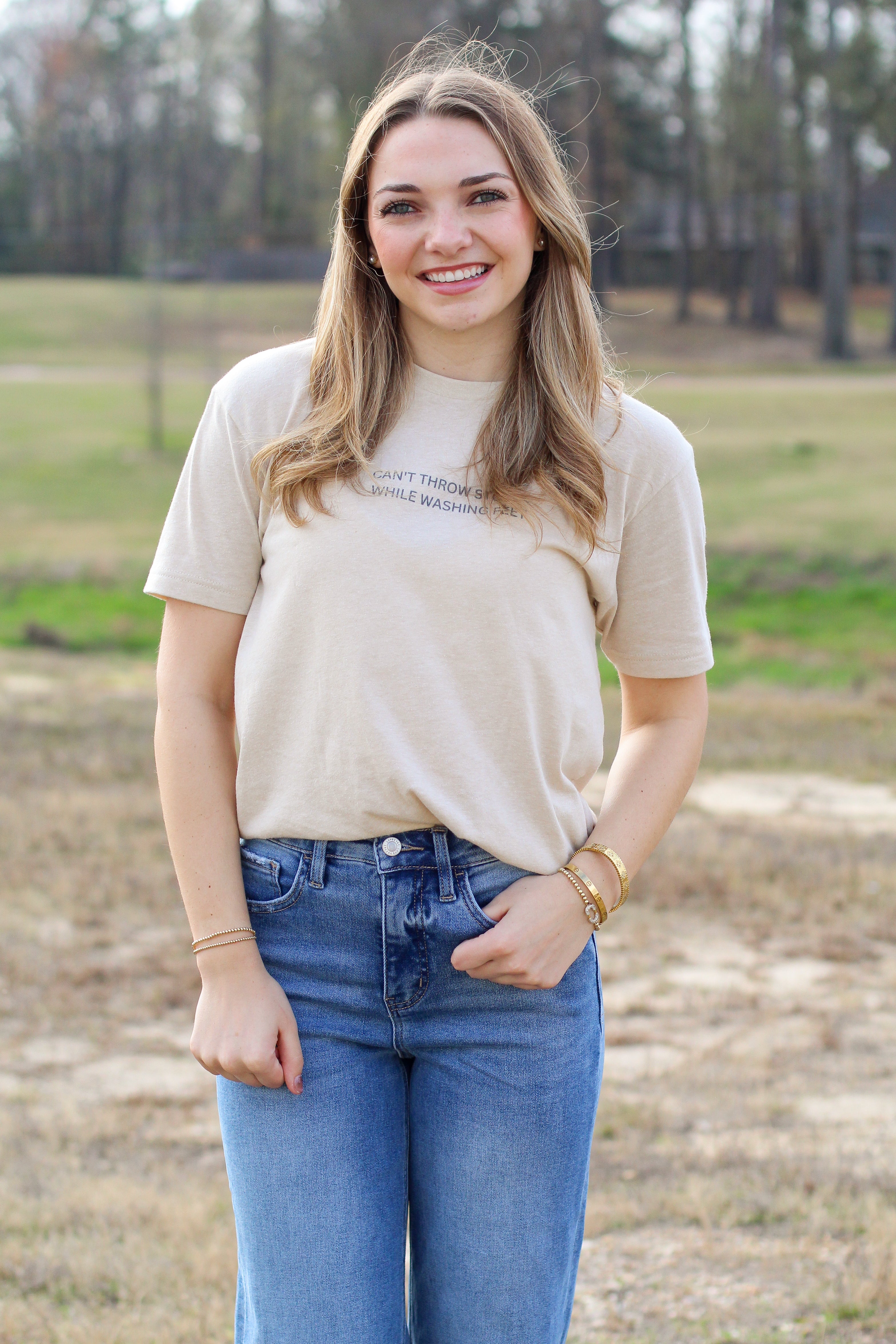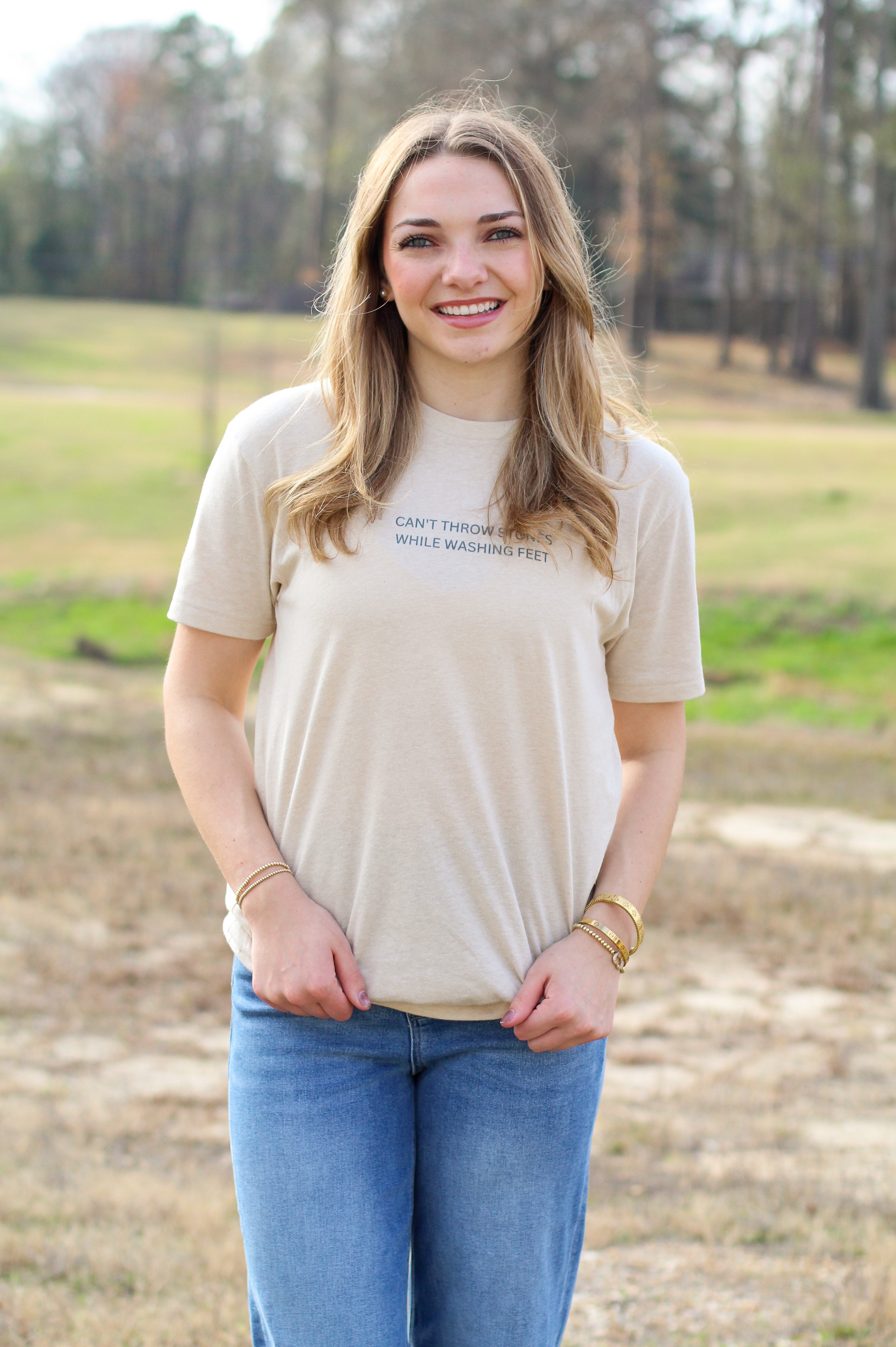 A simple statement with a powerful reminder This soft, neutral tee features the phrase “Can’t Throw Stones While Washing Feet” printed across the chest for an effortless, faith-inspired look. Designed with a classic crew neckline and an easy, relaxed fit, this tee is perfect for everyday wear—whether you’re running errands, heading to church, or styling it with denim for a casual day out. Easy to dress up or down, it’s one you’ll reach for again and again.