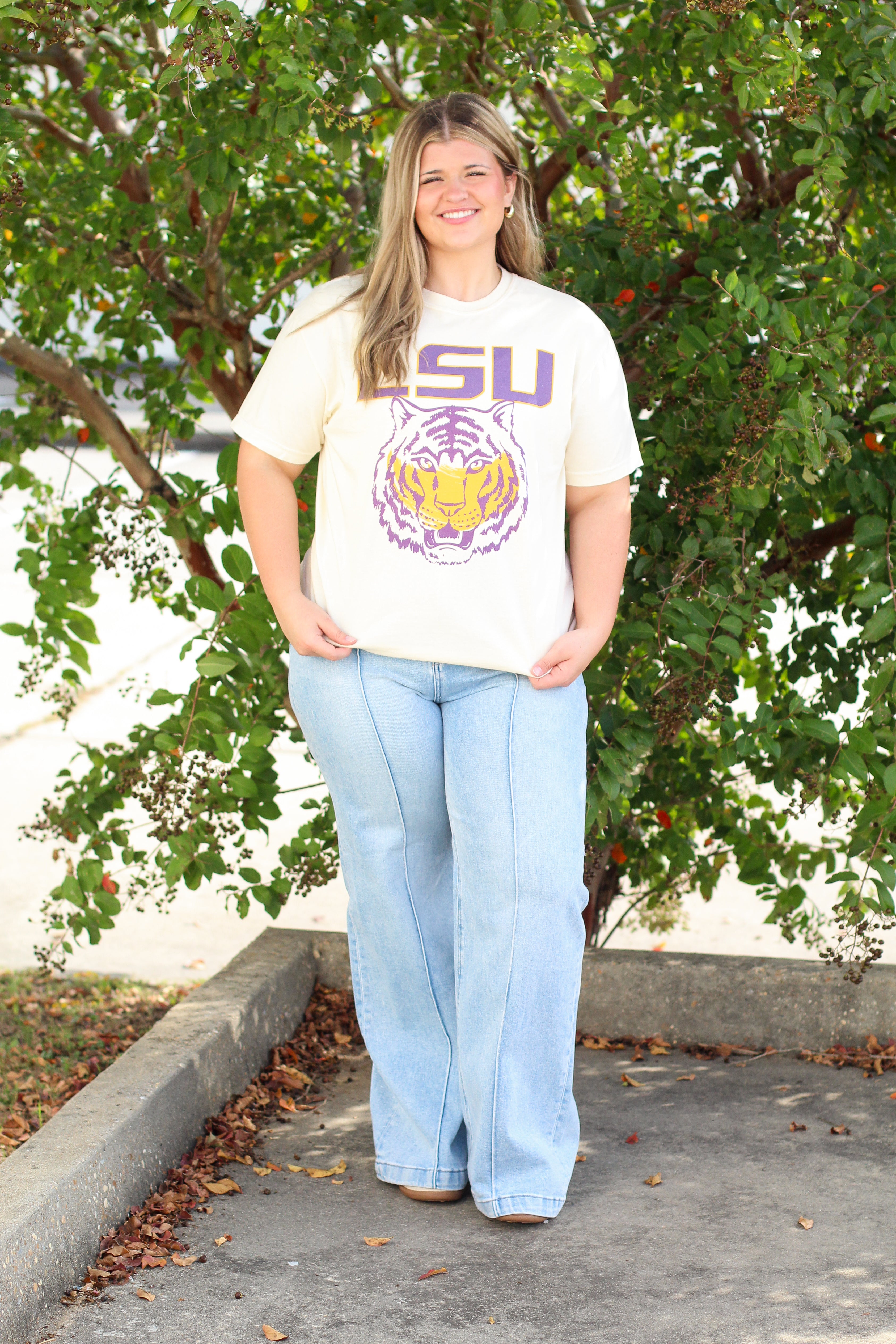 Show off your Tiger pride in comfort and style with this classic LSU tee! Featuring a bold LSU logo and fierce tiger graphic in purple and gold, this tee is perfect for game days, tailgates, or cozy weekends at home. The soft cotton-blend fabric is a favorite for every fan.
