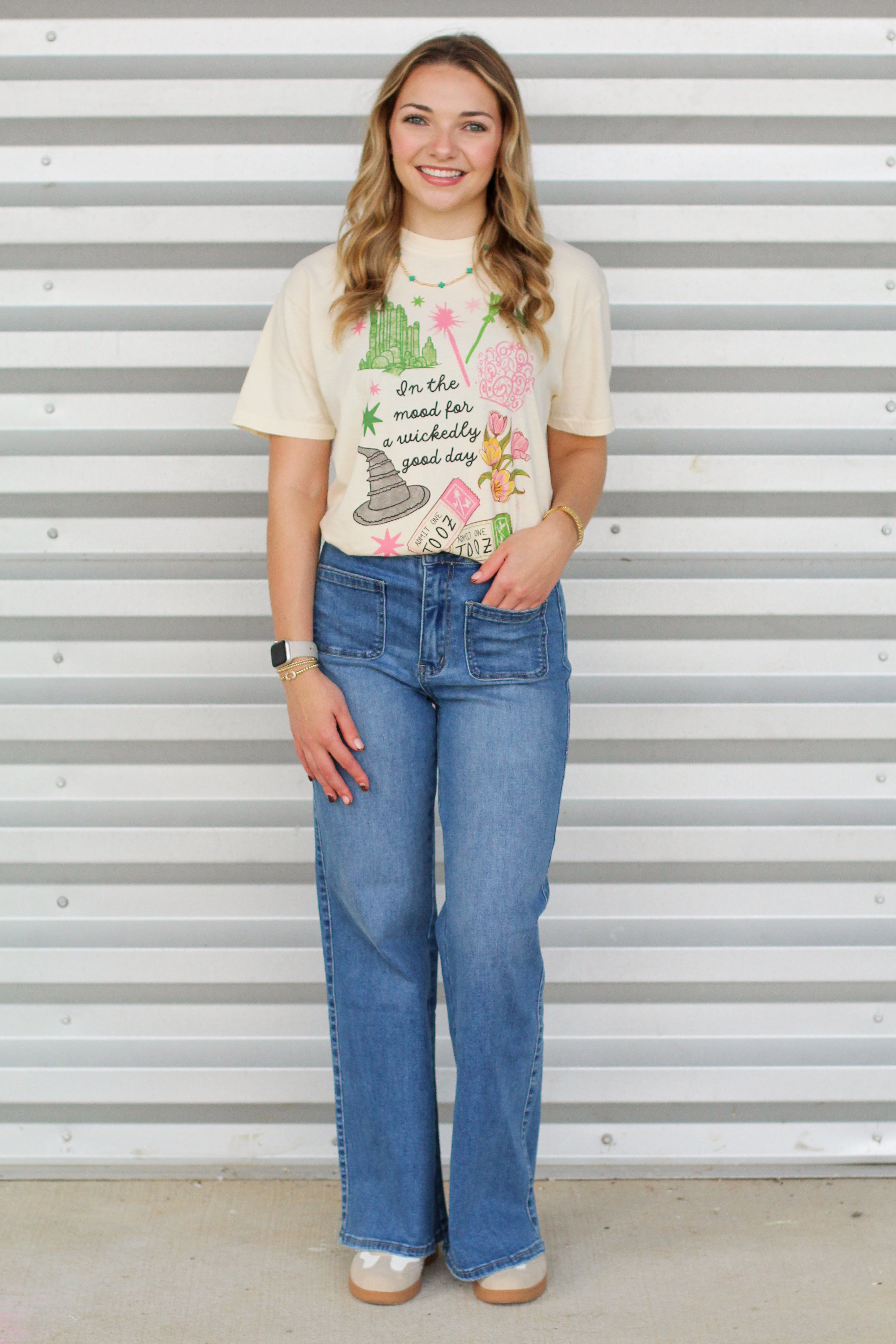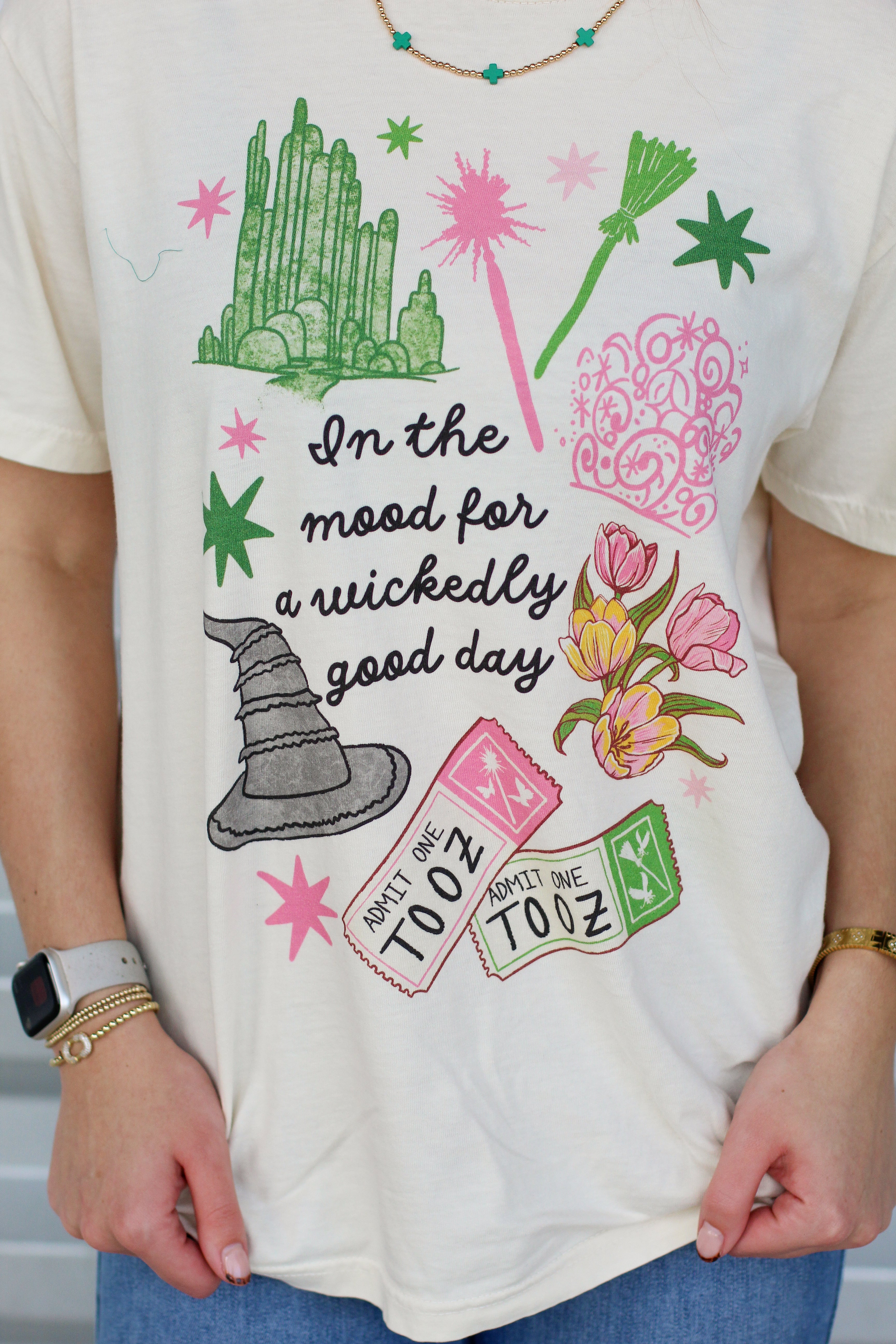 A fun, whimsical graphic tee for anyone who loves a wickedly good day! This cream-colored shirt features vibrant pops of green, pink, and yellow with playful illustrations including tickets, florals, a wizard hat, and more. Easy to style and perfect for casual days, game days, or layering under a jacket or cardigan.