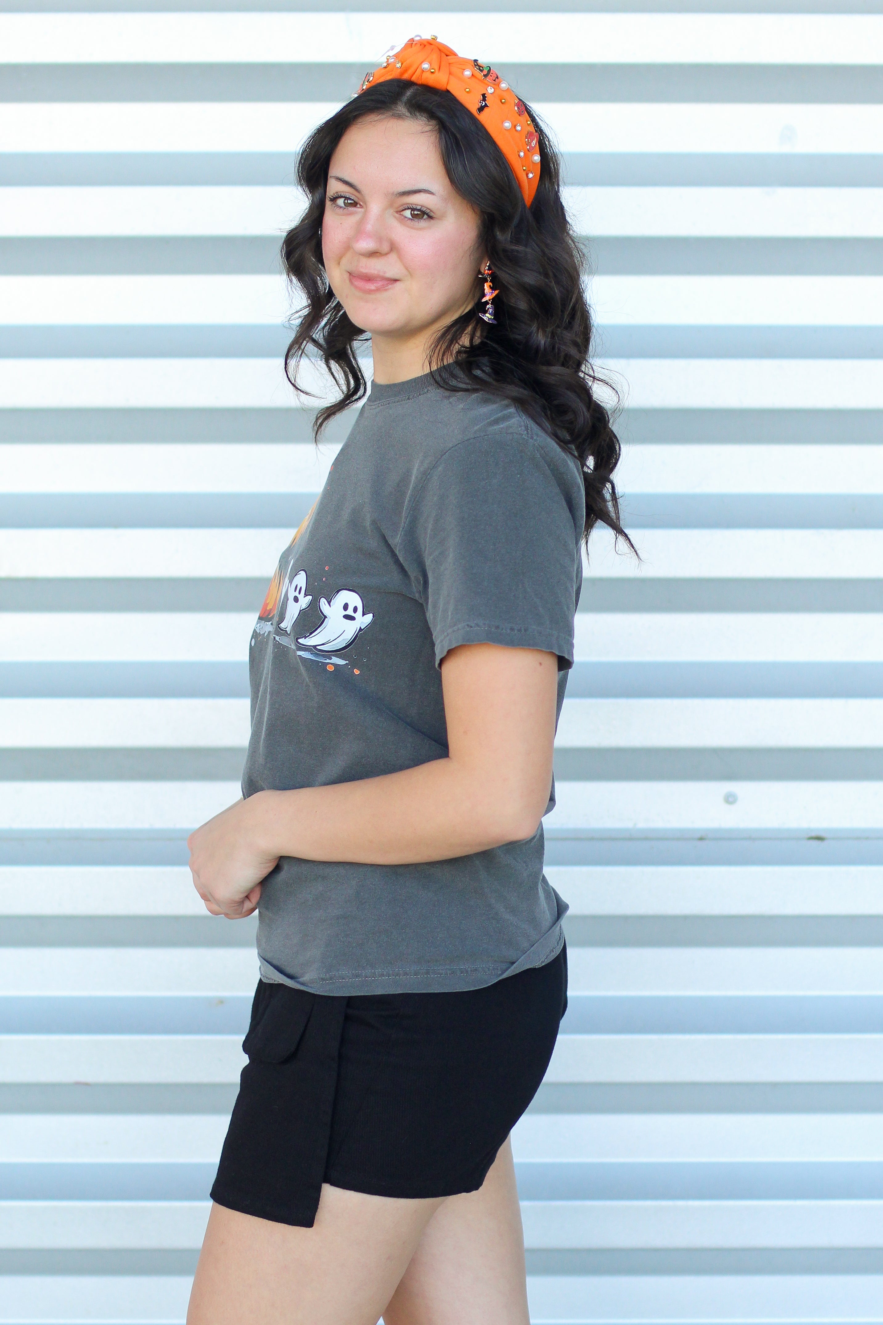 Get in the spooky spirit with our Pumpkin Chase Graphic Tee! This Halloween-inspired top features a playful jack-o’-lantern chasing three adorable ghosts — the perfect mix of cute and creepy. Made from soft, breathable 100% cotton, it offers a relaxed fit that’s comfy for all-day wear. Whether you’re headed to a fall festival or a pumpkin patch, this tee is a total treat!