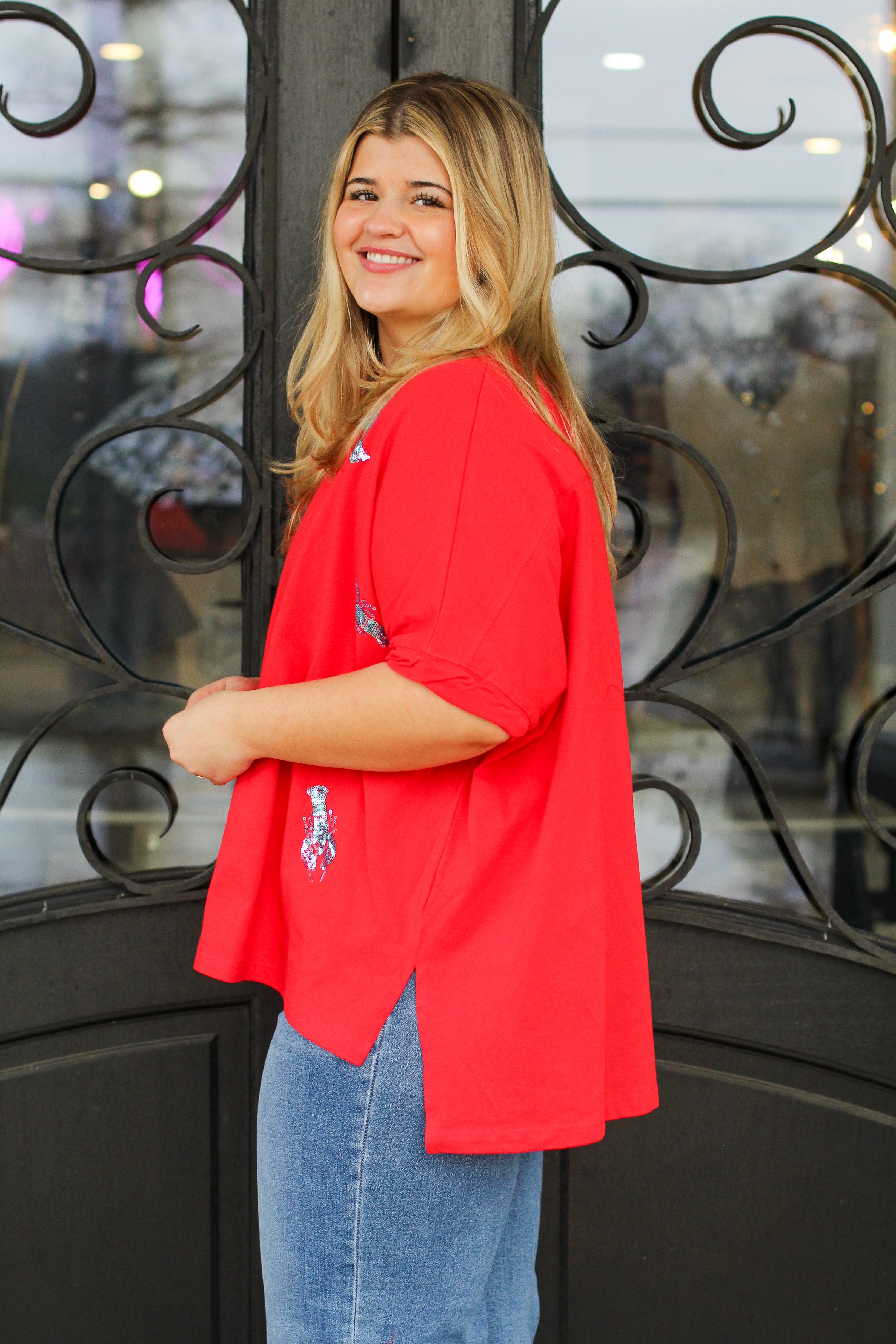 This sequin crawfish graphic tee brings personality and sparkle to an easy everyday silhouette. It’s relaxed, eye-catching, and perfect for casual days when you still want your outfit to stand out.