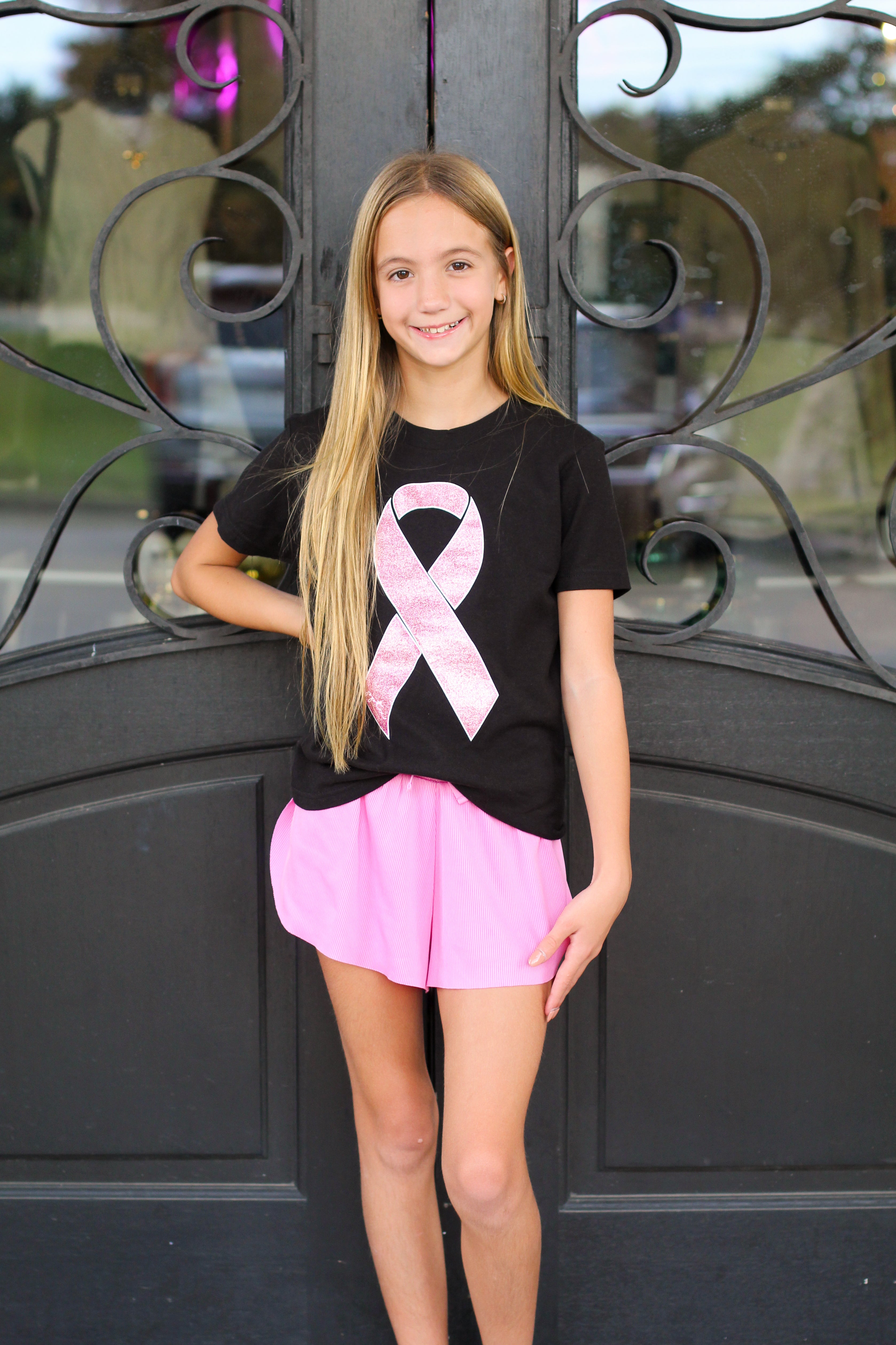 Show support in style with this Pink Ribbon Tee. Featuring a sparkling pink ribbon graphic on a soft black tee, it’s the perfect way for your girl to spread awareness while staying comfortable.Fit & Sizing