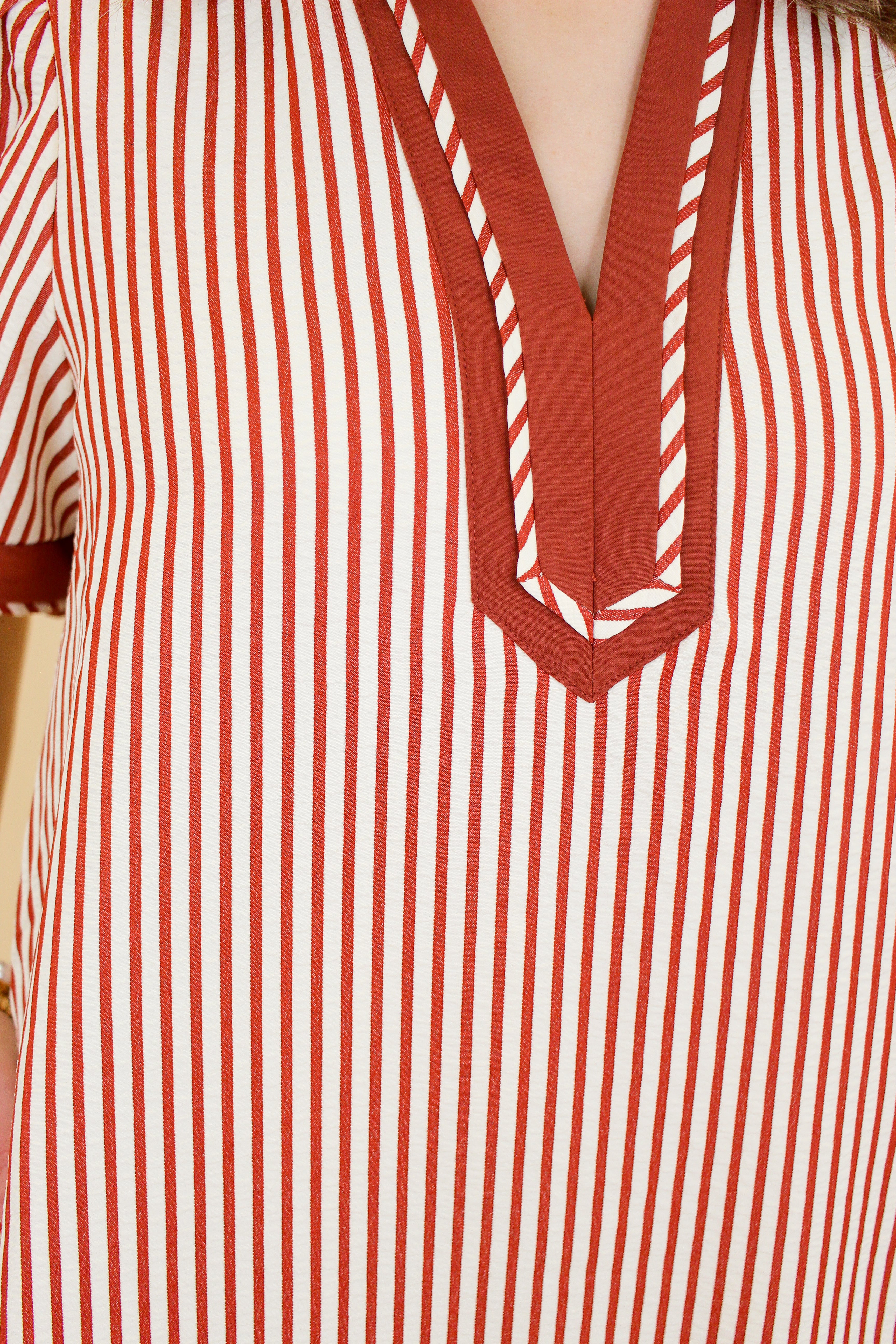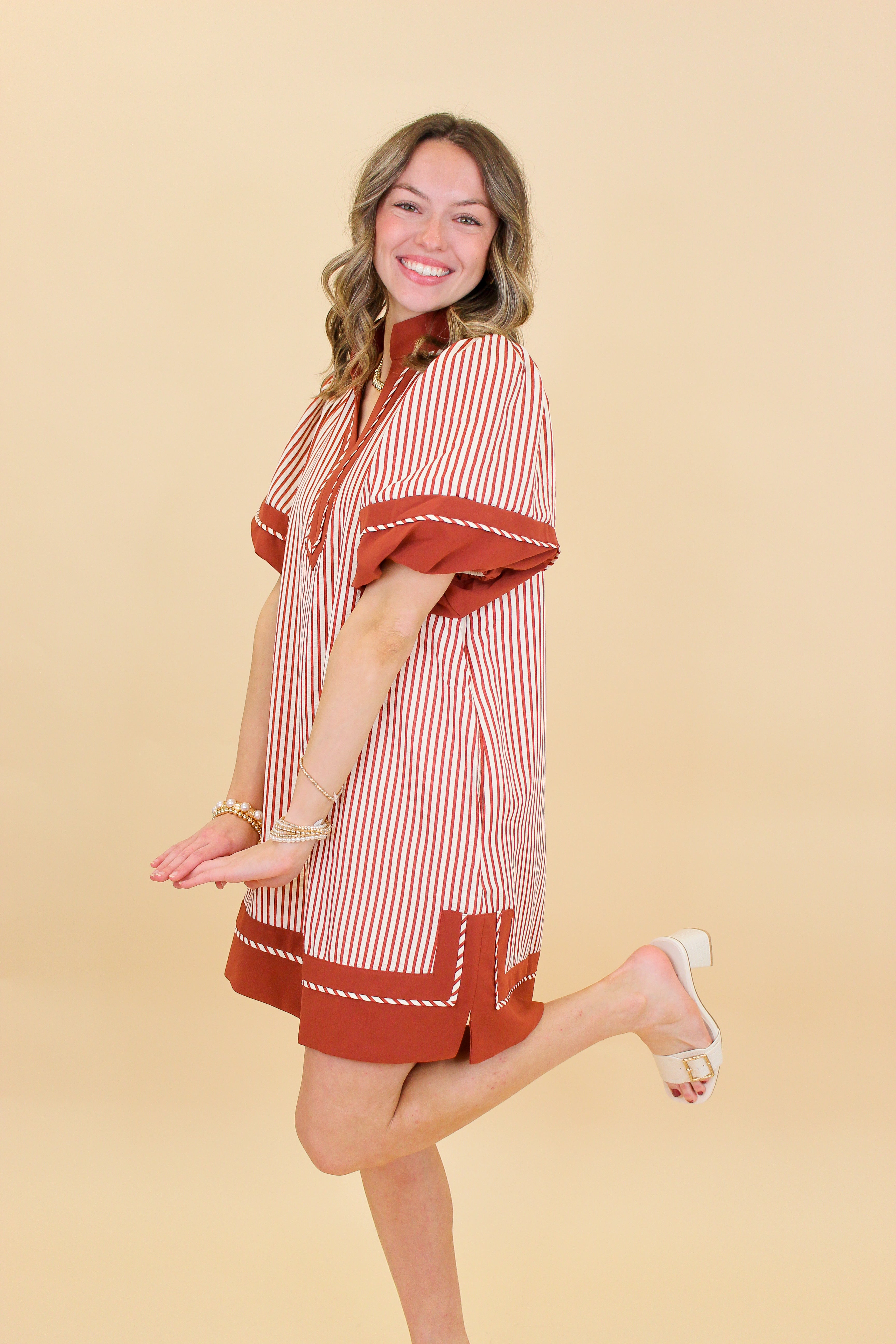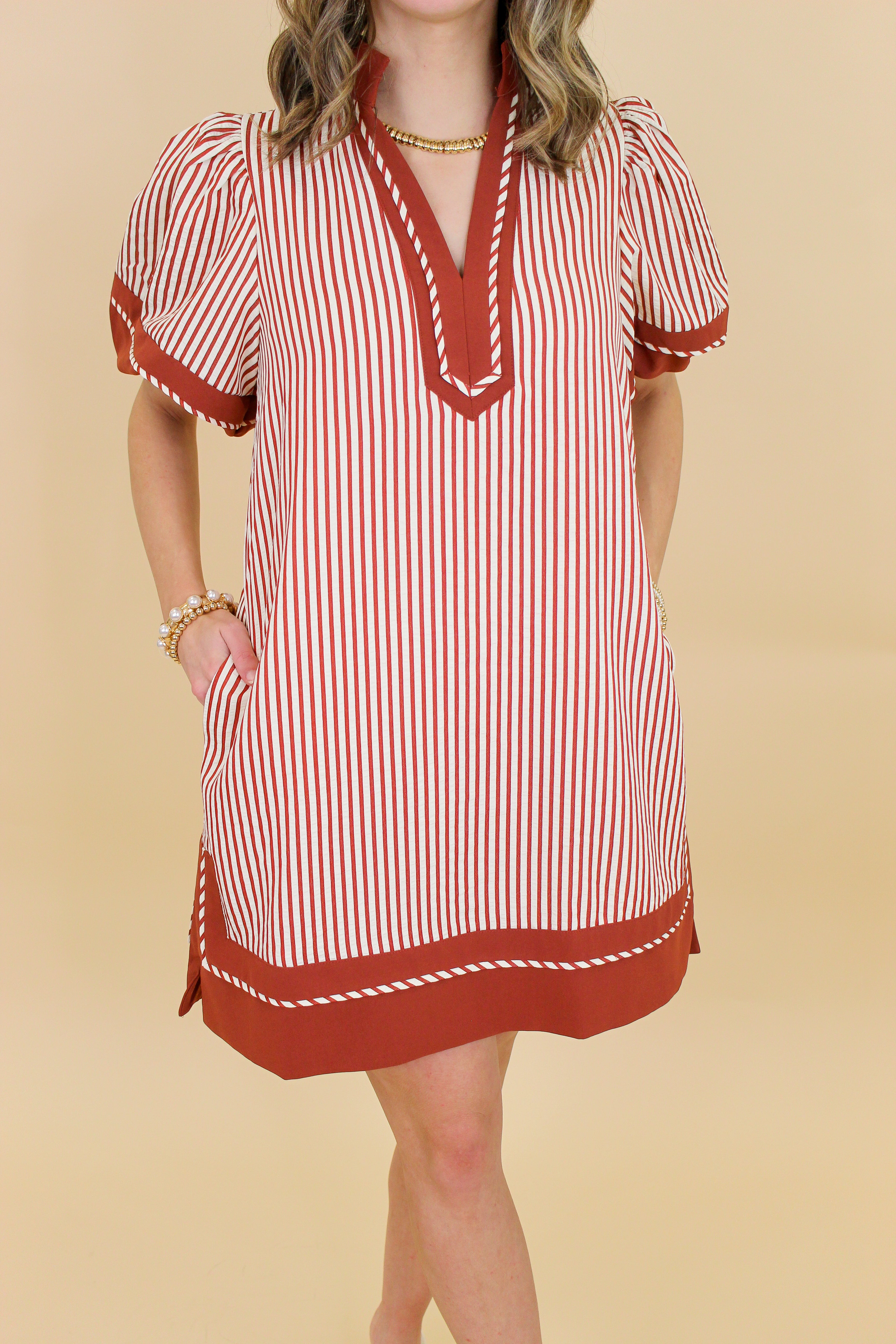 Classic stripes meet effortless charm in this gorgeous rust and cream dress! Featuring puff sleeves and a relaxed silhouette, this piece blends comfort and sophistication. The bold contrast trim and stitched detailing give it that polished boutique touch — perfect for making a statement at work, brunch, or Sunday service.Materials