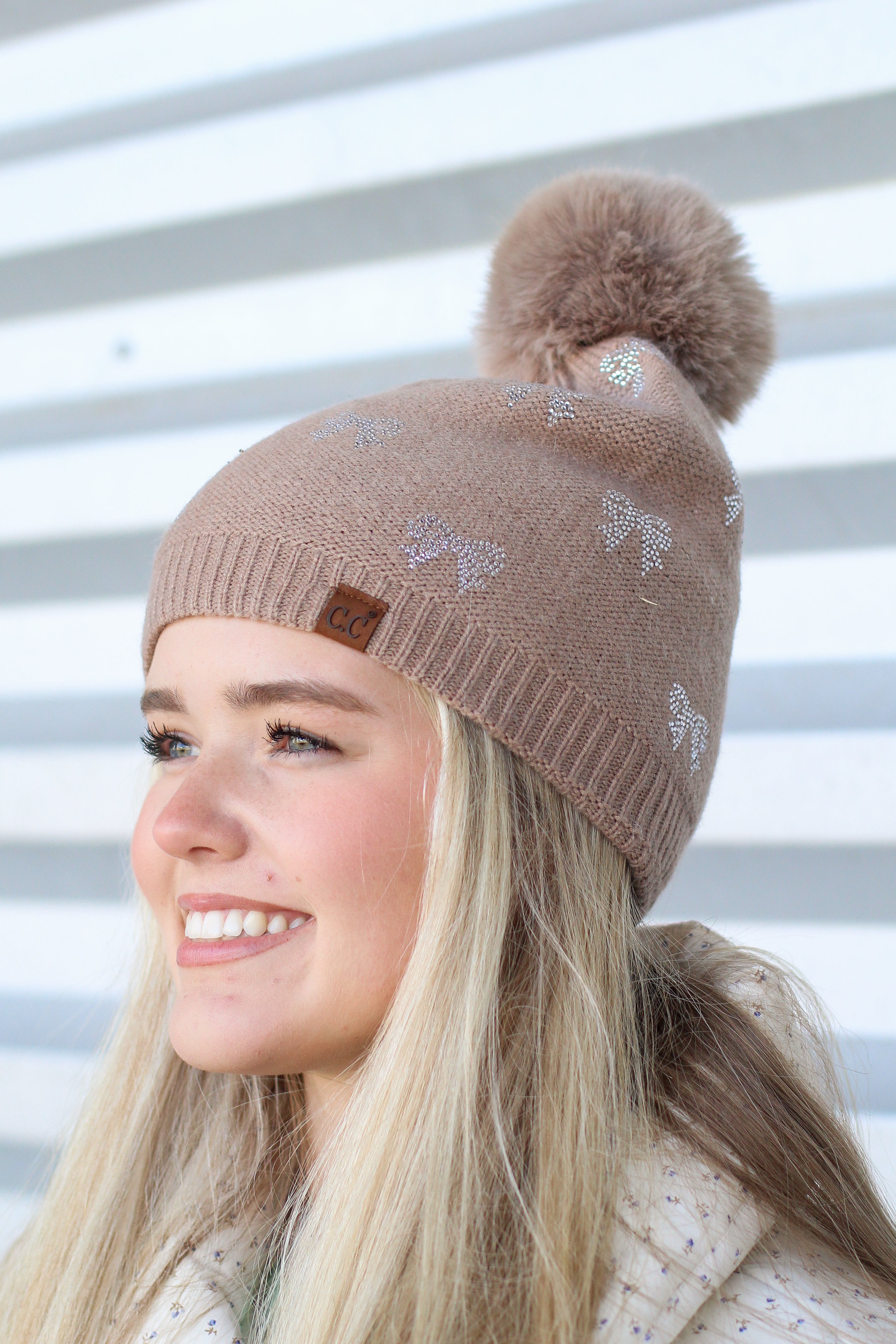 Cold-weather style just got a little extra sparkle. This cozy black knit beanie features an allover rhinestone bow design that adds the perfect touch of glam to your everyday winter looks. Finished with a soft pom pom on top and a classic cuffed fit, this beanie keeps you warm while still feeling cute and trendy. Easy to dress up or down, it’s the perfect accessory for chilly days.