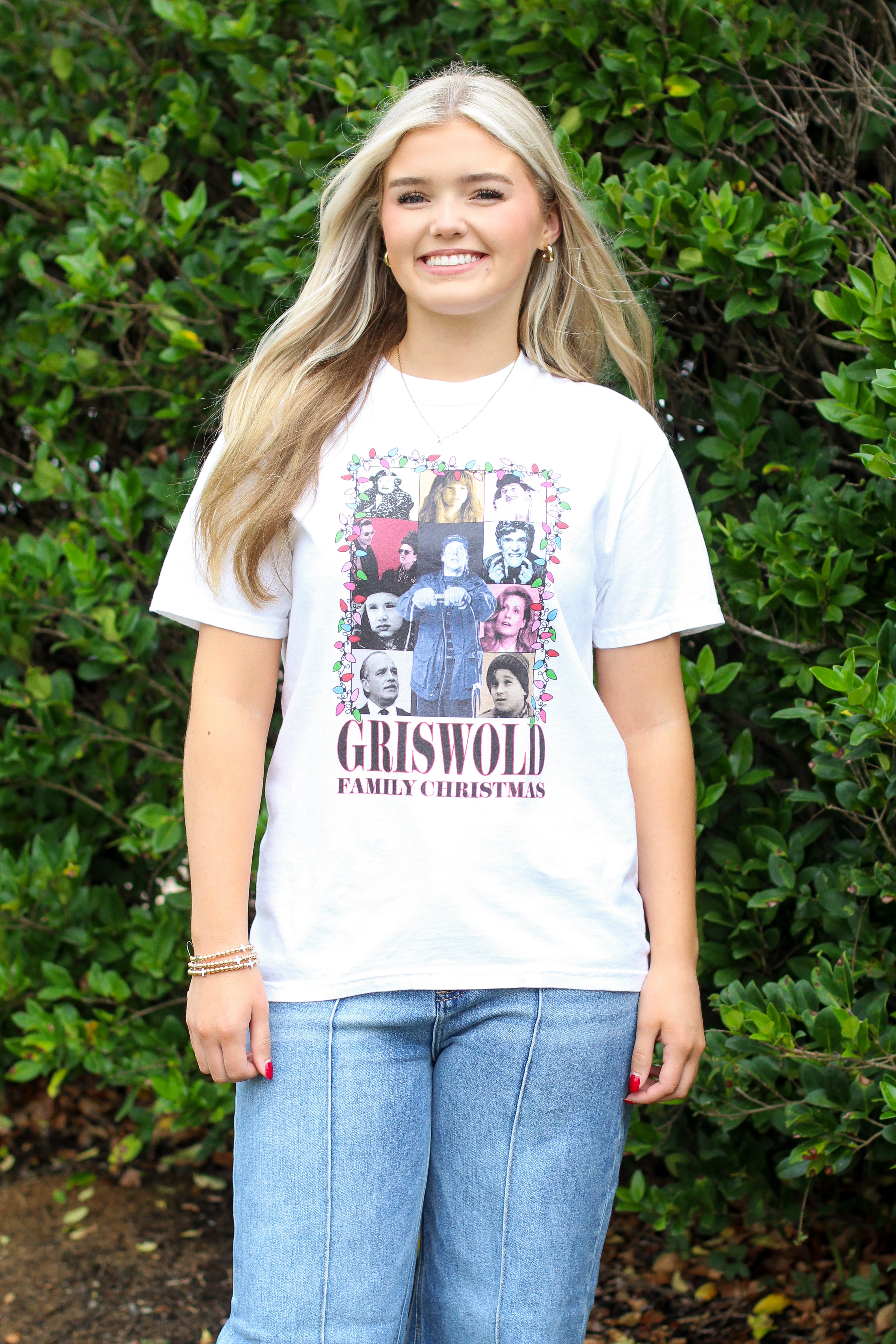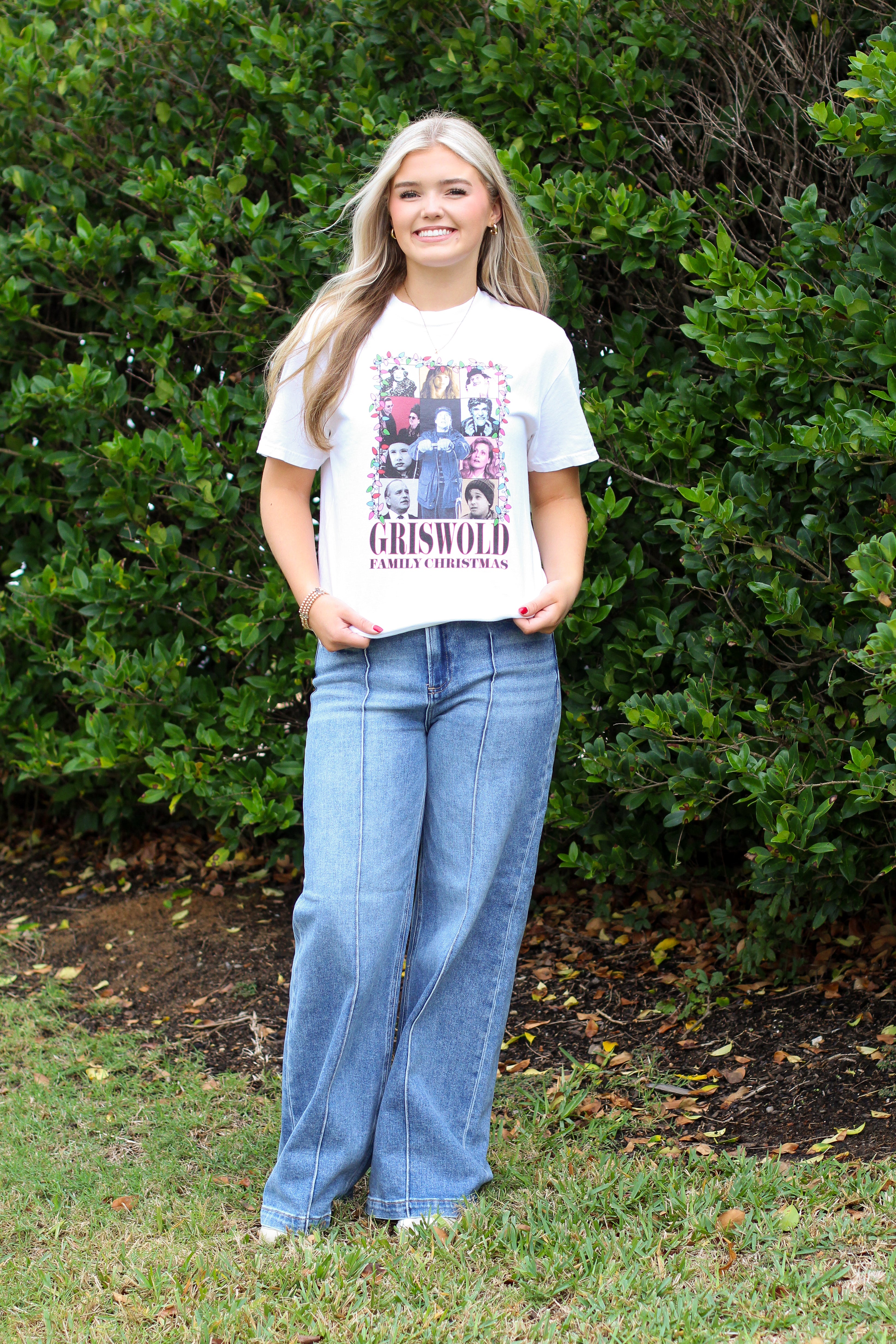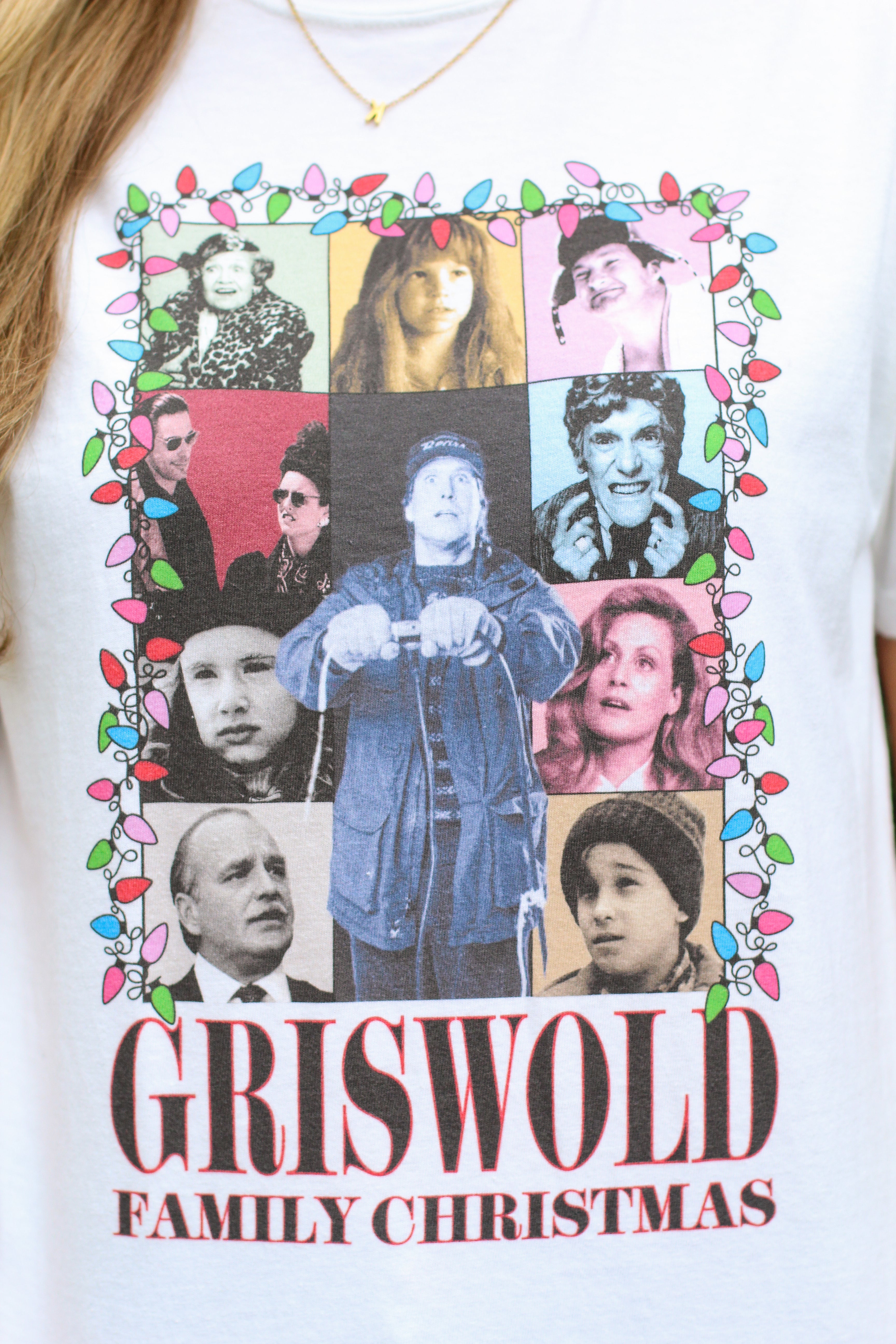 Celebrate the season with a little classic Christmas nostalgia! This graphic tee features iconic Griswold characters framed in festive holiday lights, bringing all the cozy, chaotic charm of the beloved movie. It’s soft, breathable, and the perfect throw-on piece for holiday parties, movie marathons, or gifting. Cute, comfy, and guaranteed to spread Christmas cheer!