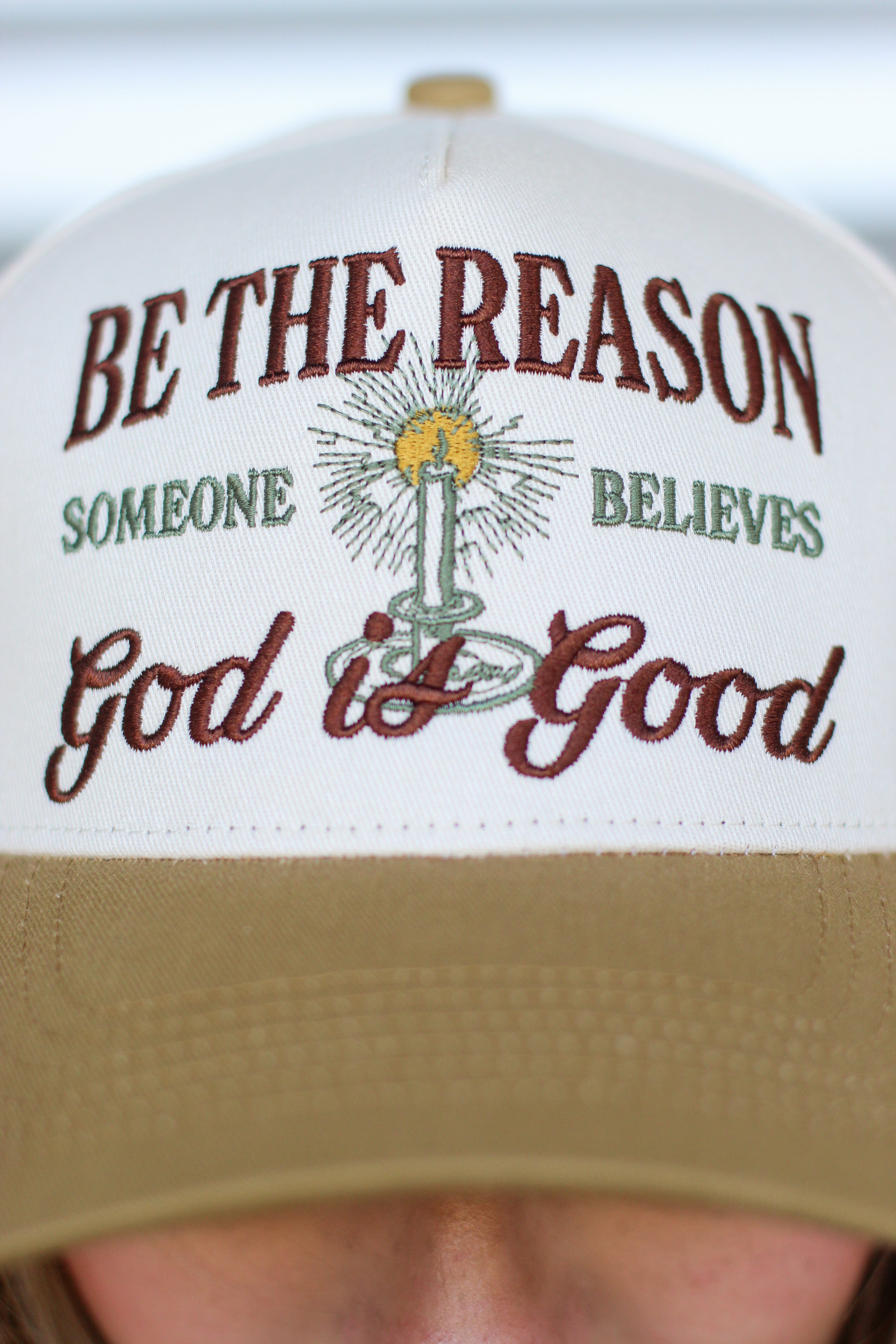 Share your faith boldly with our Be The Reason Someone Believes God is Good Trucker Hat. Designed with cream and tan tones and embroidered lettering that spreads light and encouragement, this hat serves as a gentle reminder to live with purpose and love. Perfect for everyday wear or gifting, it’s a stylish way to share a powerful message of hope and faith.Details
