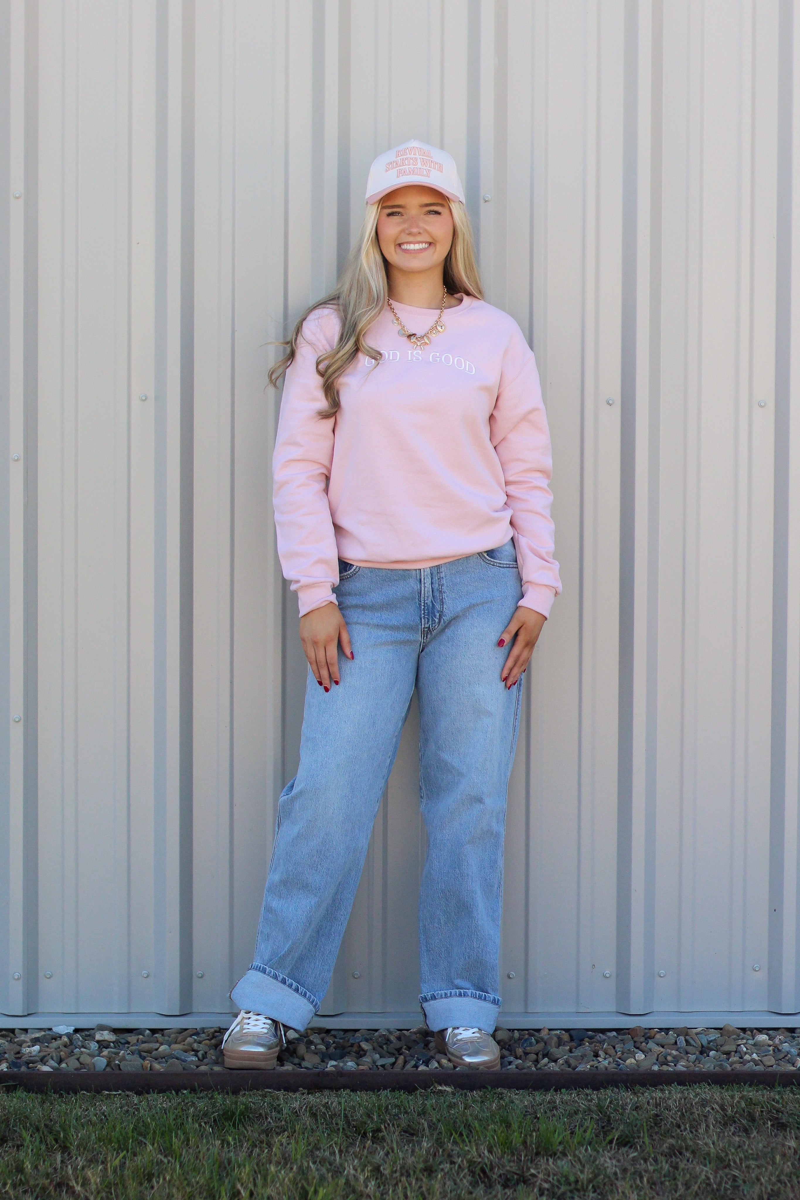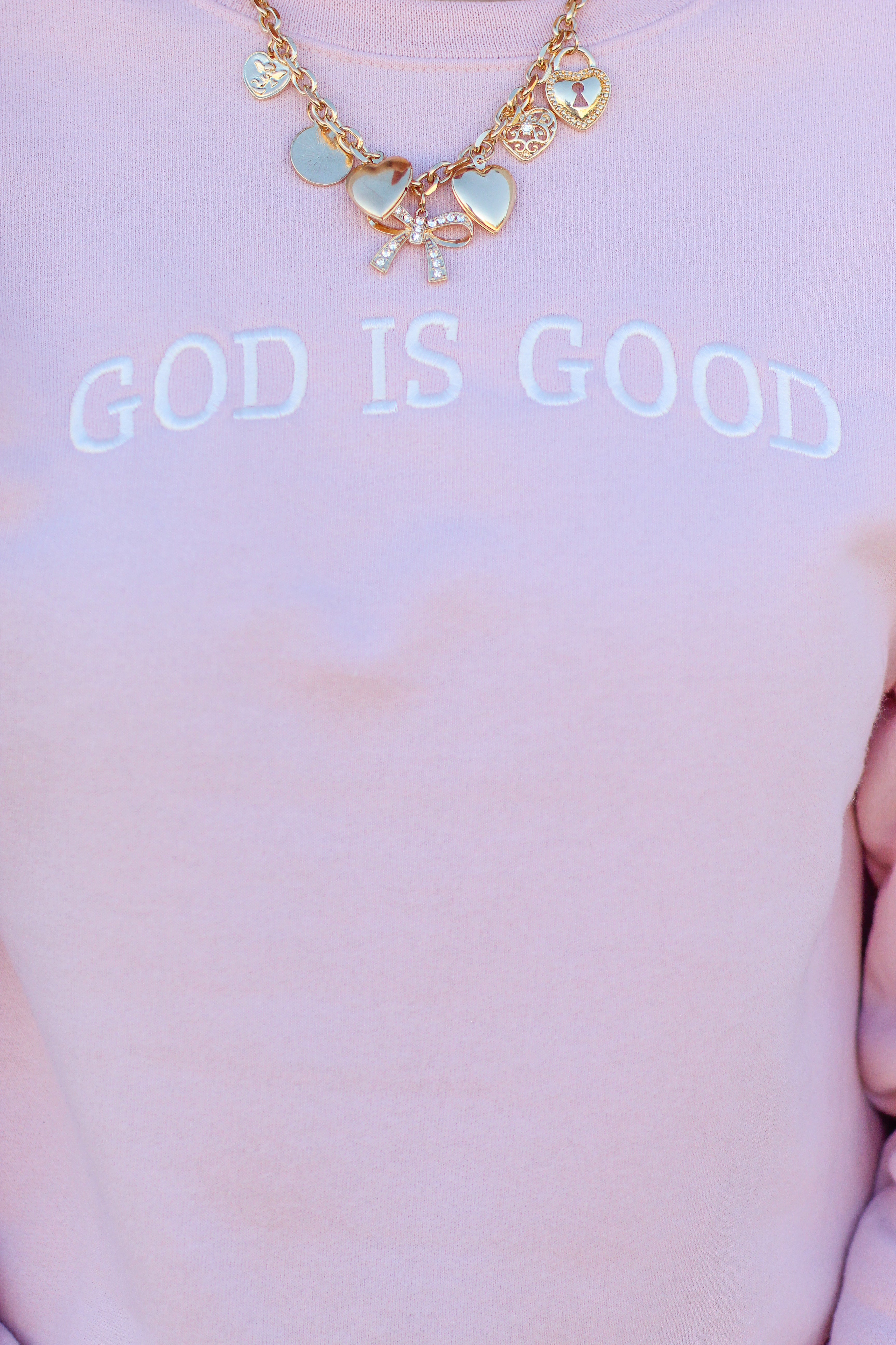 Soft, sweet, and full of meaning — this cozy sweatshirt features a subtle embroidered "GOD IS GOOD" message that speaks loud through simplicity. The perfect neutral pink tone makes it easy to layer and style year-round, whether you're running errands, grabbing coffee, or heading to church on a cool morning. It’s your new feel-good favorite — literally!
