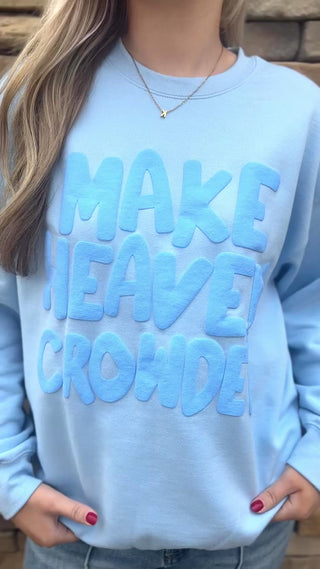 Cozy, uplifting, and perfectly on-trend—our Make Heaven Crowded Sweatshirt is the everyday statement piece your winter wardrobe needs. This soft sky-blue pullover features a bold, raised chenille-style graphic that adds texture and personality while keeping the message front and center.