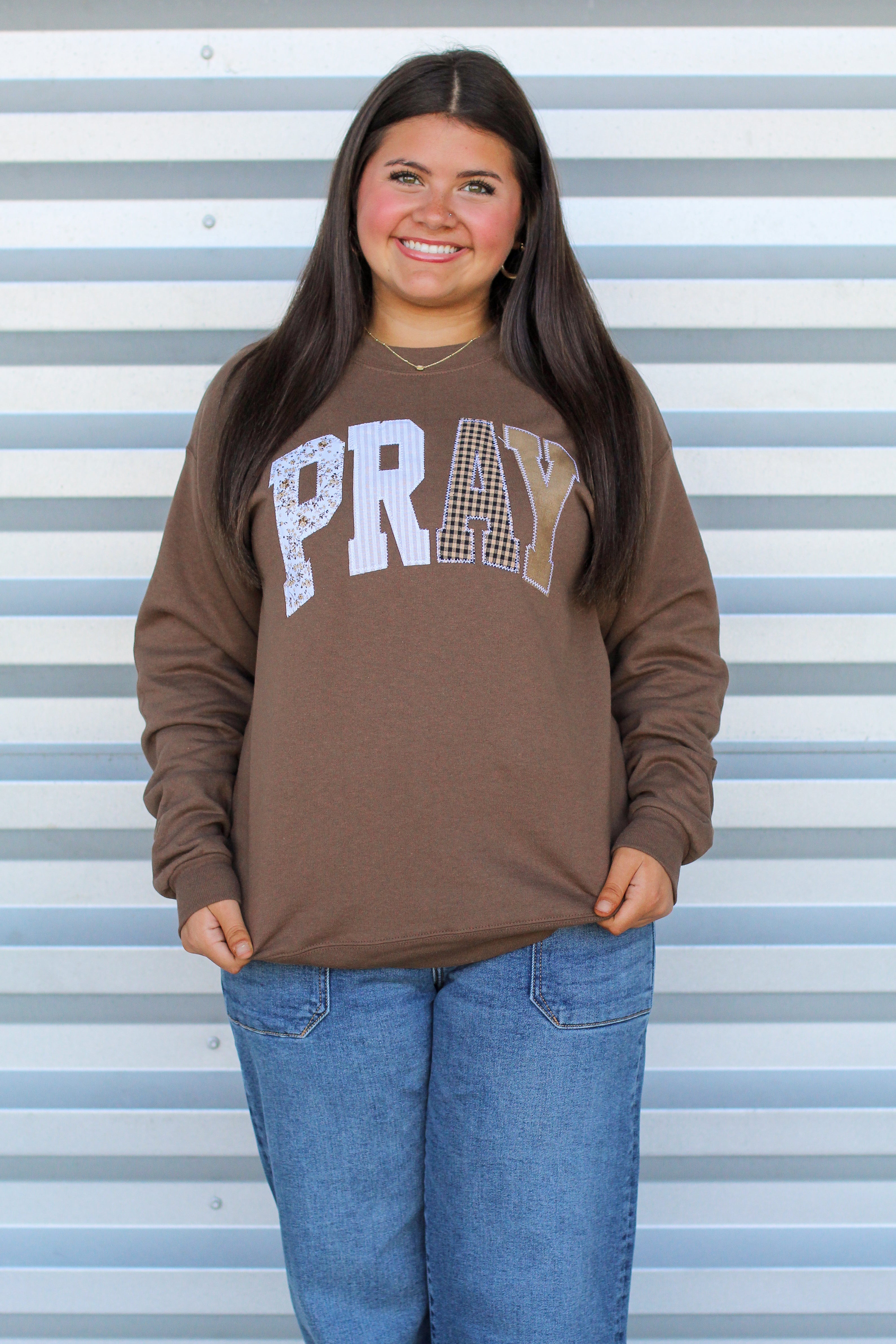 Faith meets cozy comfort in our Pray Patch Sweatshirt! This soft crewneck features bold appliqué letters spelling “PRAY” — each made with unique mixed-pattern fabrics for a fun and meaningful touch. Whether you’re running errands, heading to church, or lounging at home, this sweatshirt is a daily reminder to keep faith at the center. Available in two beautiful colorways: light blue and mocha brown.