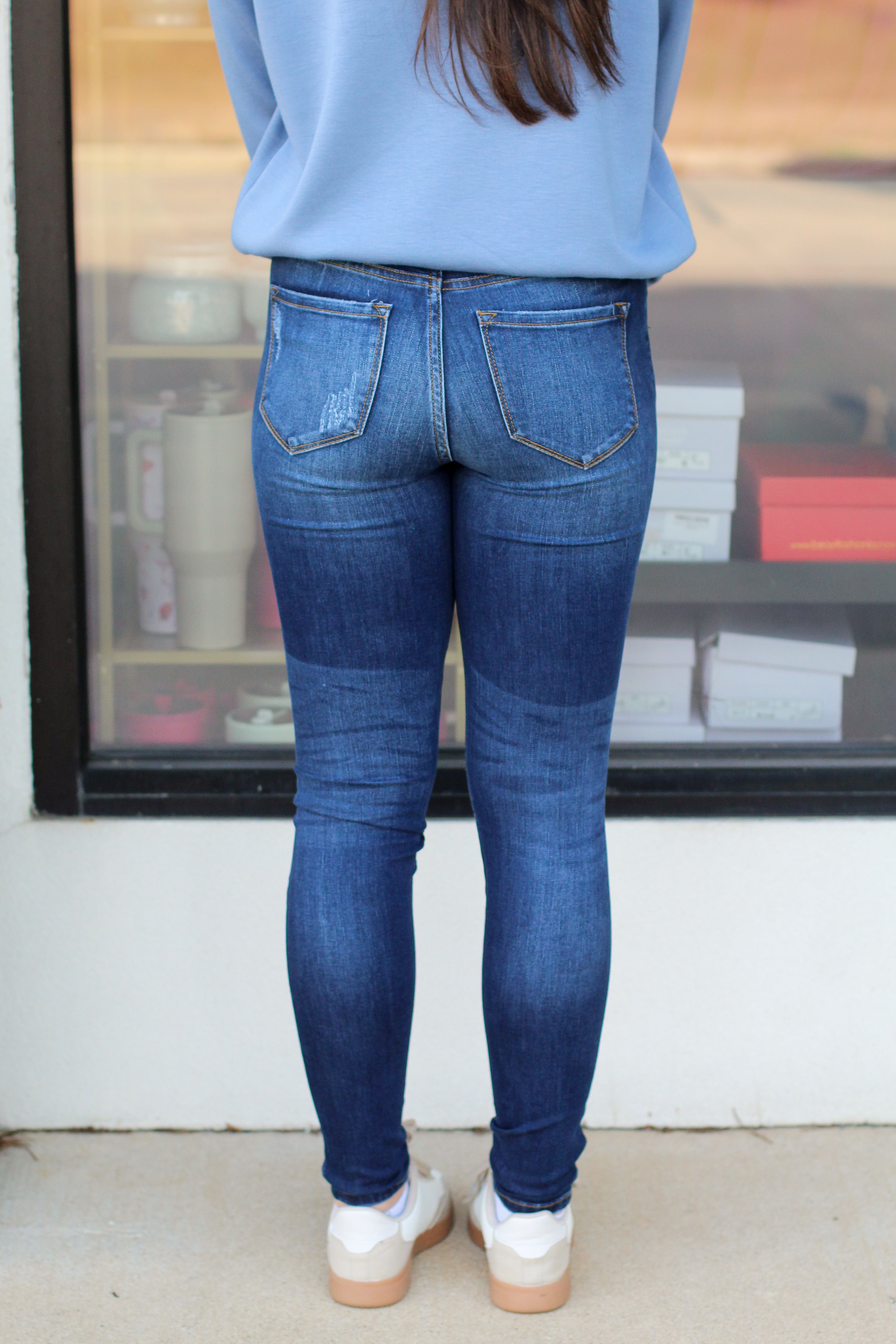 Looking for high rise skinny jeans that hold you in but still feel comfortable all day? These dark wash button fly skinny jeans are designed to smooth, shape, and move with you — without that stiff, uncomfortable denim feeling.