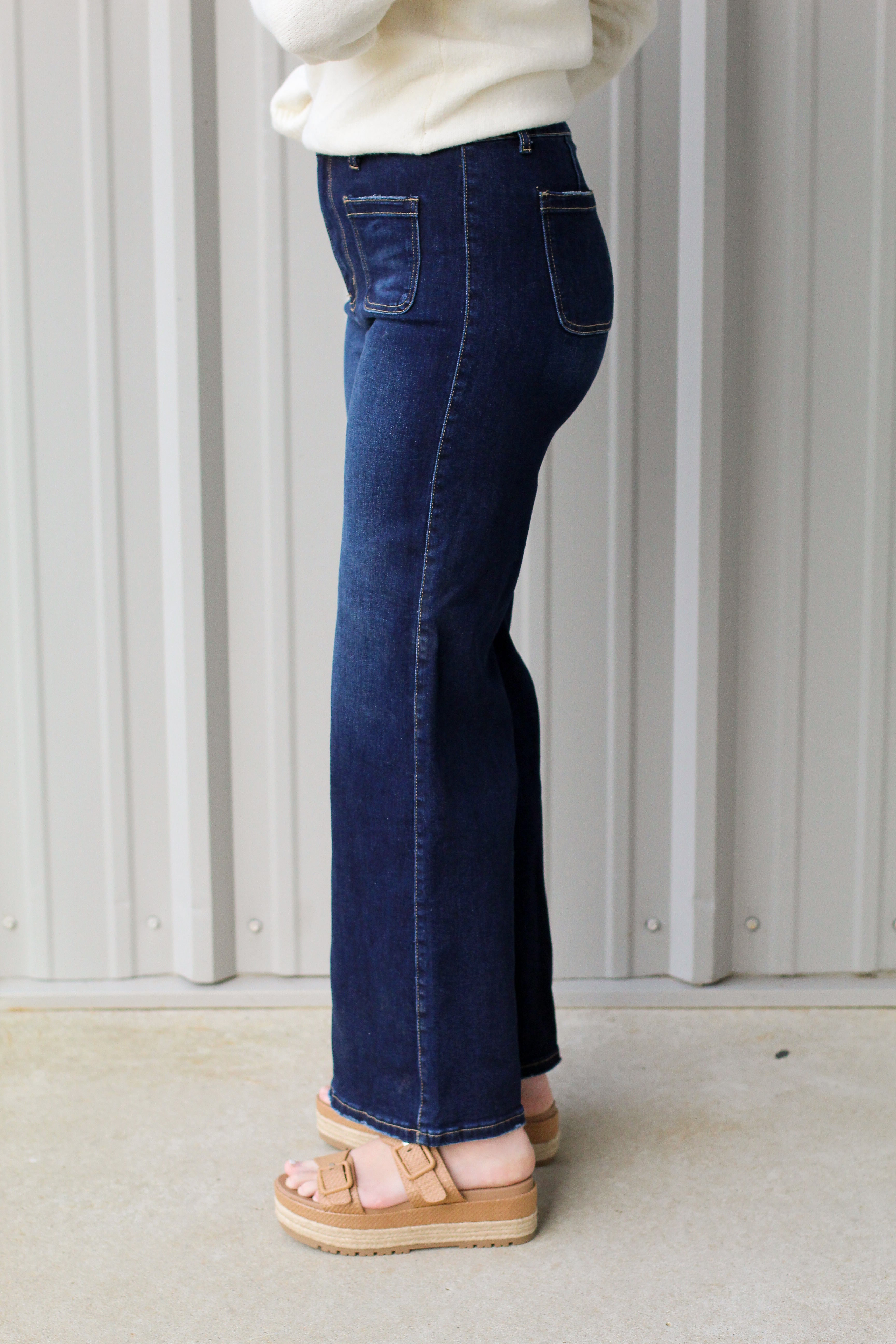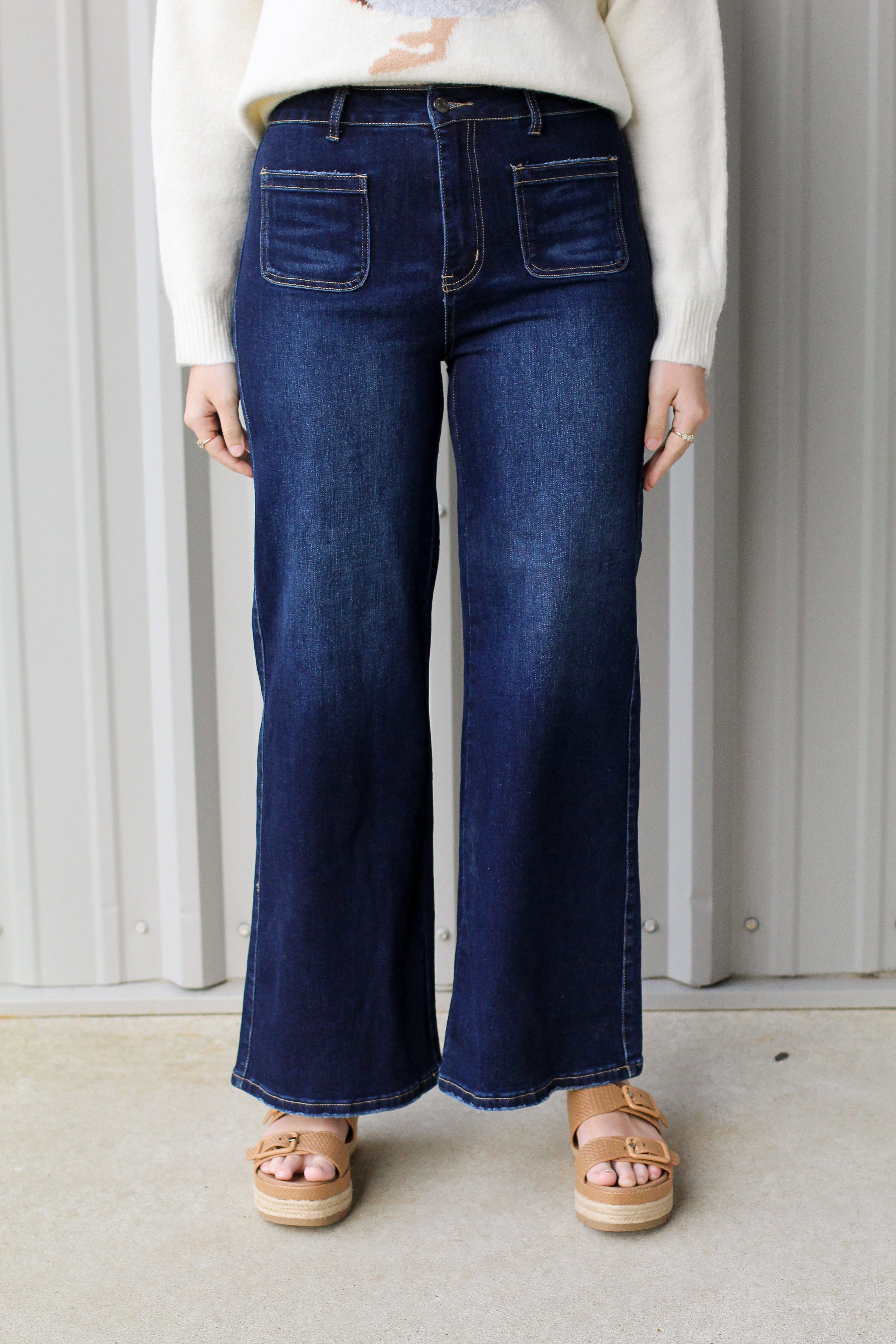 A flattering fit with a vintage-inspired twist — these dark wash wide leg jeans are the perfect mix of classic and trendy. Featuring statement front patch pockets and a rich dark wash, these jeans elongate the legs while giving you that effortlessly cool silhouette. The high-rise fit hugs in all the right places, while the wide leg keeps the look polished and easy to style.
