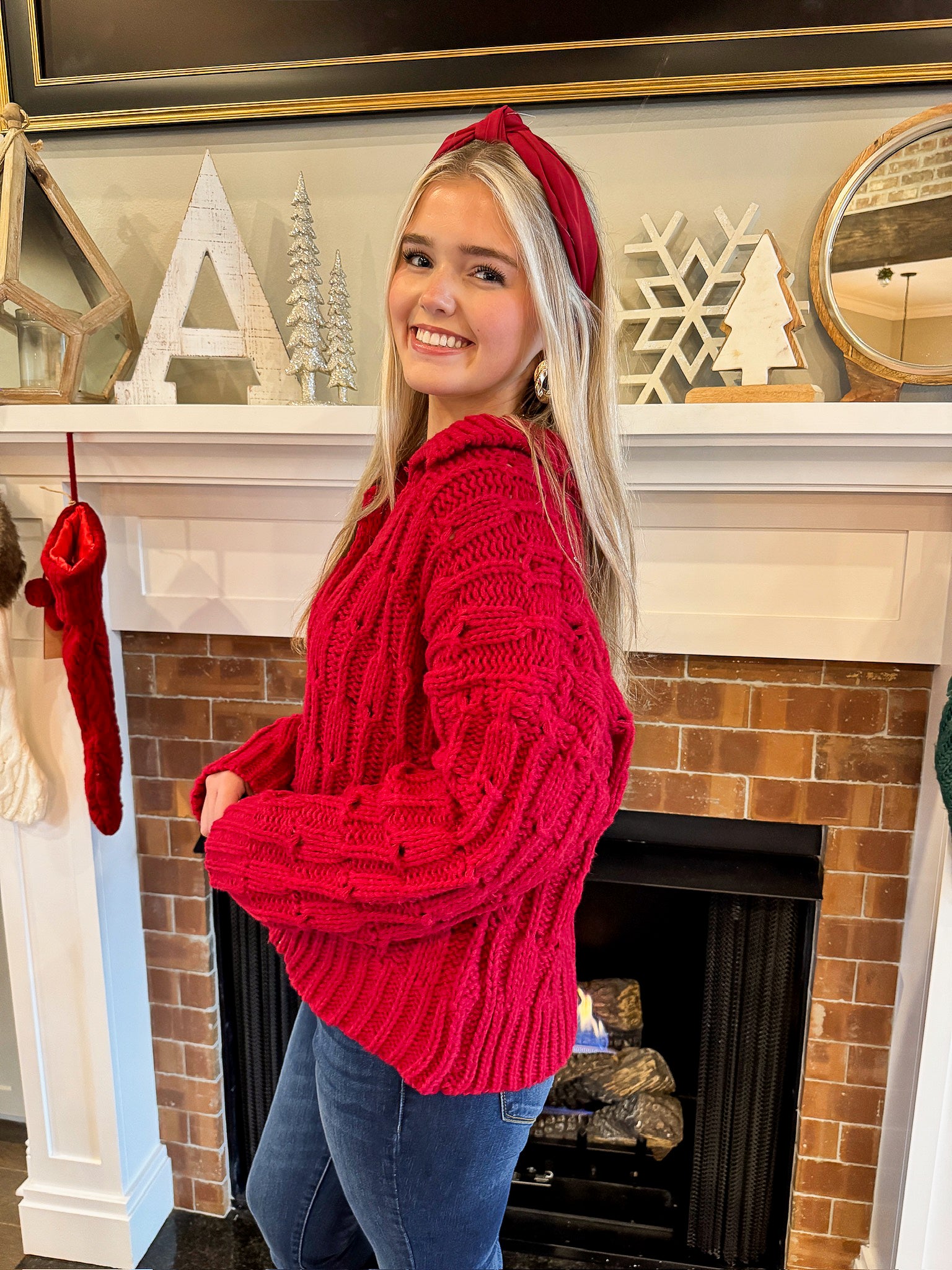 Get holiday-ready in the coziest pop of red! This soft, chunky knit sweater features a textured cable design, a relaxed fit, and a flattering collared V-neckline that adds the perfect touch of chic. Whether you're dressing it up with denim and boots or keeping it casual for a festive night in, this sweater is made to stand out all season long.