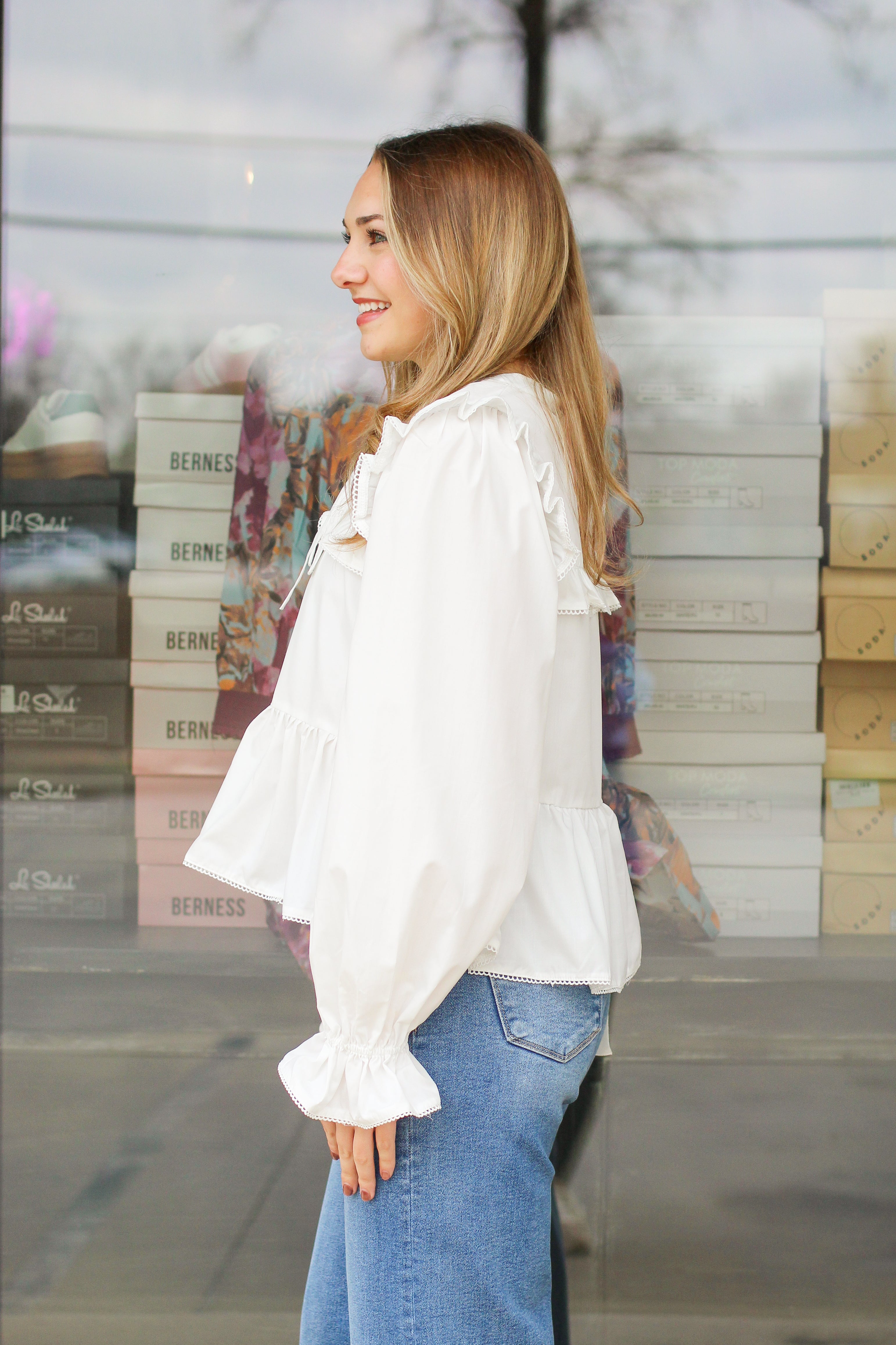 This classic white blouse is the perfect mix of timeless and feminine. Featuring delicate ruffle detailing, a soft tie-front neckline, and a flowy babydoll silhouette, this top is effortlessly flattering and easy to style. Dress it up with tailored denim or keep it casual with your everyday favorites — it’s a closet staple you’ll reach for again and again.