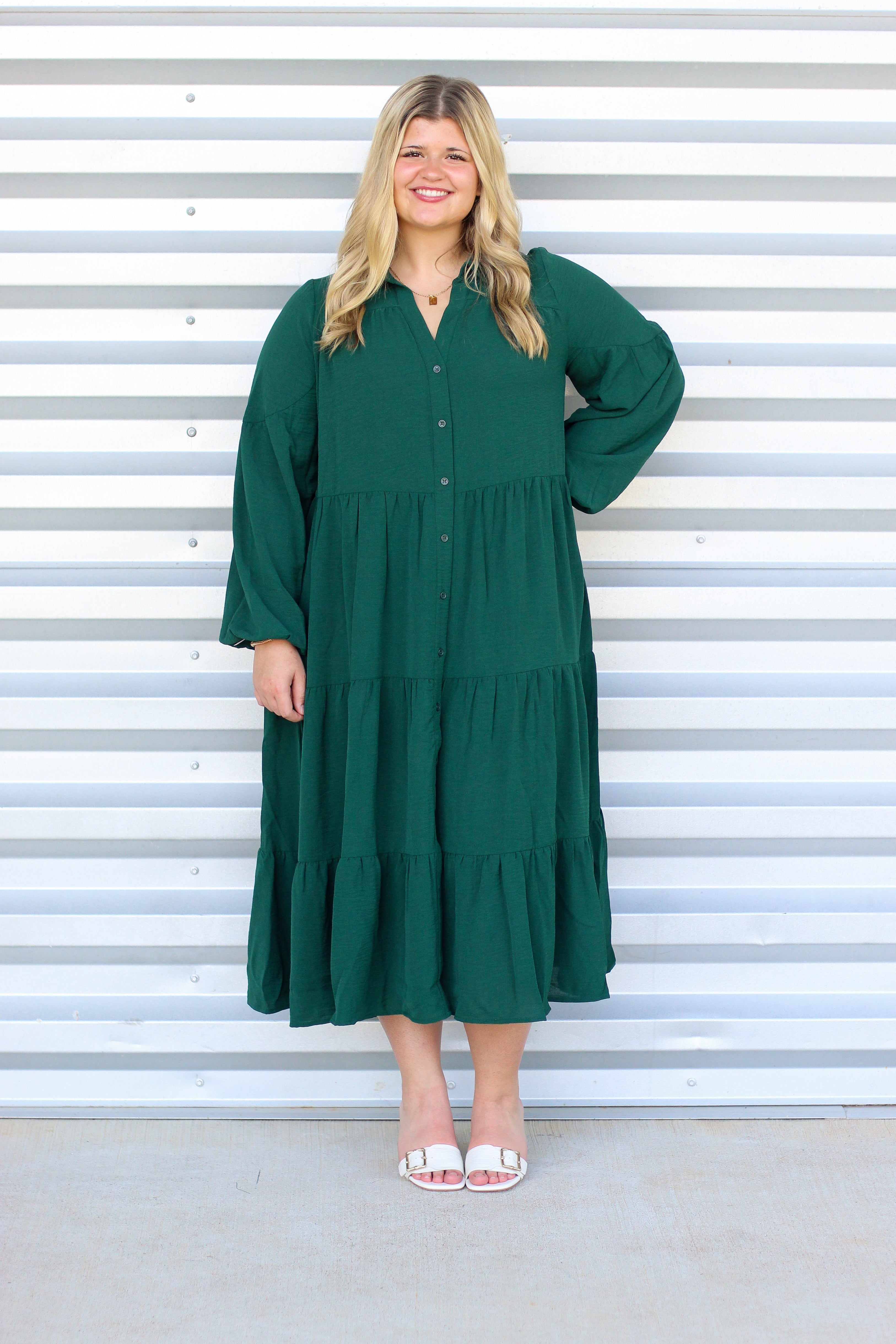 Effortlessly elegant and endlessly versatile, this tiered midi dress is the perfect blend of comfort and style. The flowy silhouette and button-front detail make it easy to wear for everyday outings or dressed-up occasions, while the rich forest green color feels timeless and chic.Fit & Sizing