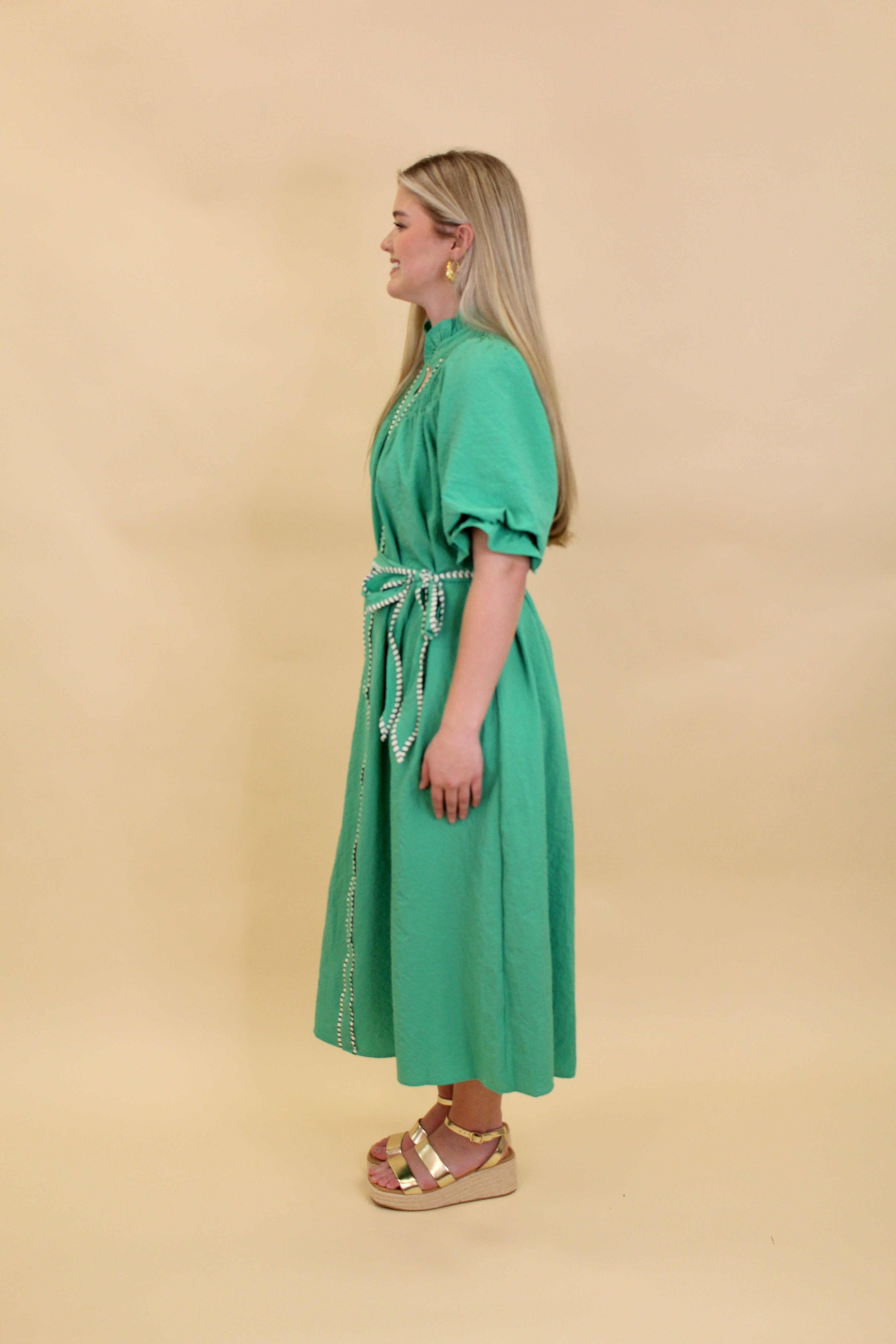 This dress is a polished yet easygoing piece that’s perfect for any occasion. Featuring a flattering V-neckline with delicate trim detailing, short puff sleeves, and a removable waist tie, it creates a beautiful, feminine silhouette while staying comfortable. The lightweight fabric and midi length make it an effortless choice for everything from brunch to special events.