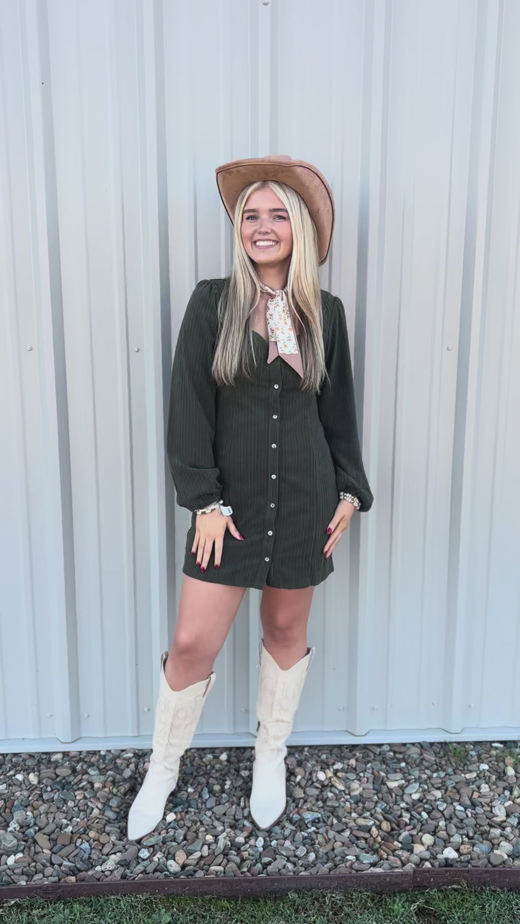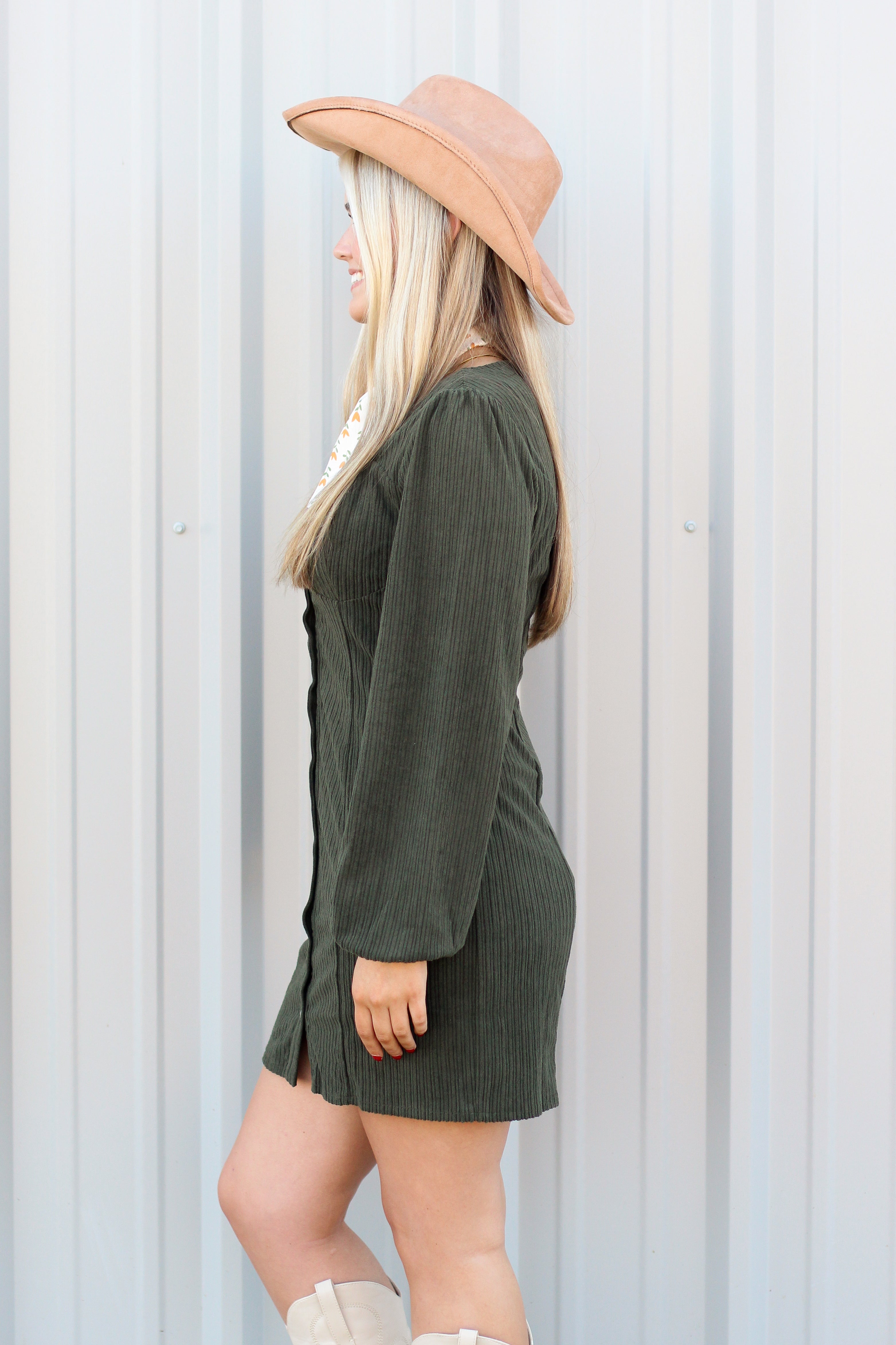 Meet your new fall favorite. This sage corduroy dress features a soft, ribbed texture and a flattering button-down silhouette that gives just the right amount of shape. With long sleeves and a subtle sweetheart neckline, it’s equal parts feminine and effortless. Dress it up with boots and accessories, or keep it casual for everyday wear — either way, she’s a standout.