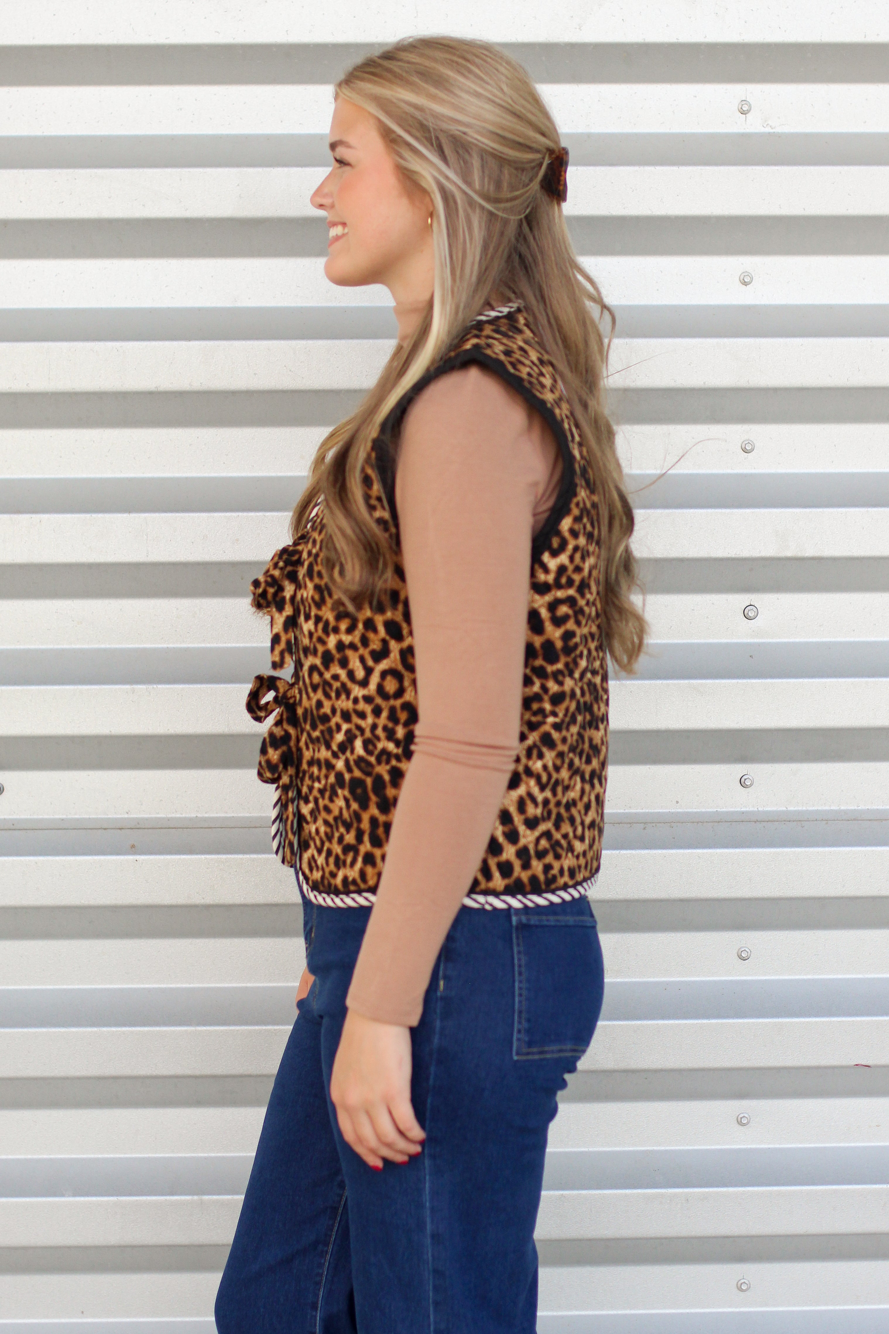 Add a little wild flair to your layering game with this chic leopard tie-front vest. Featuring a bold animal print with contrast trim, it’s the perfect statement piece that instantly elevates your outfit without sacrificing comfort.Fit & Sizing: