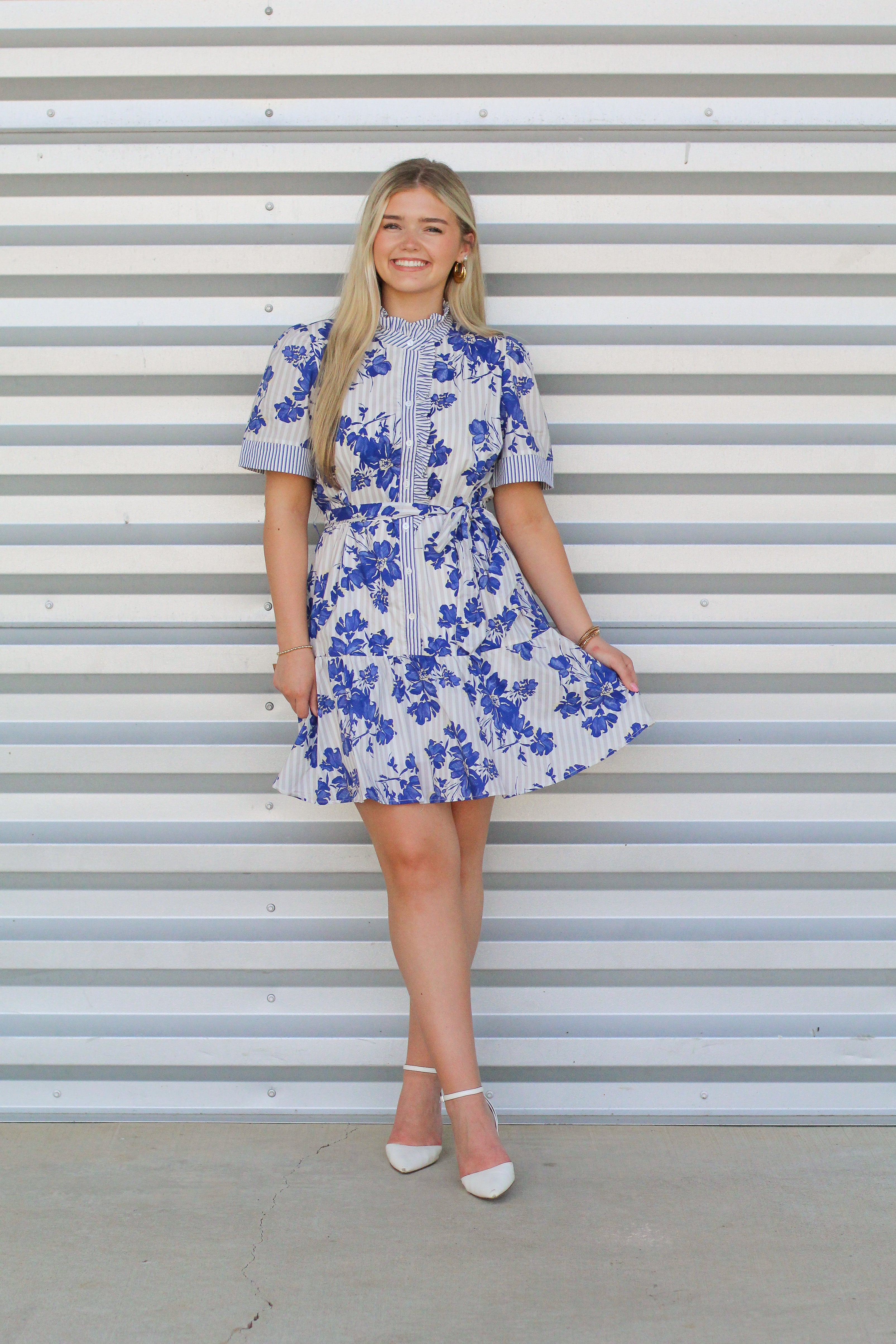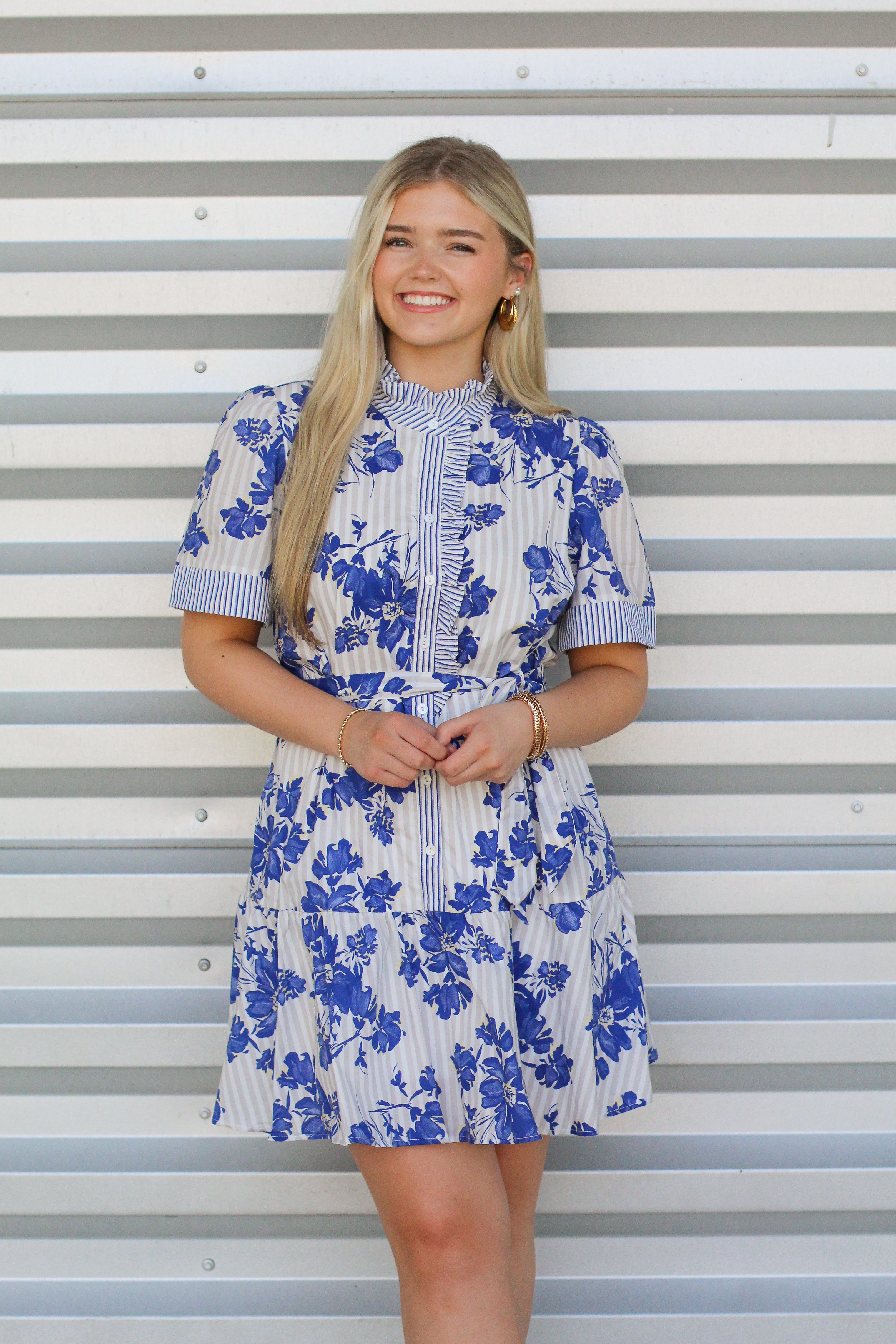 This floral dress is the perfect mix of classic and feminine. Featuring a striped contrast detail at the collar, cuffs, and placket, plus soft ruffle trim down the front, it’s full of thoughtful touches. The adjustable tie waist creates a flattering shape, while the tiered skirt adds easy movement.