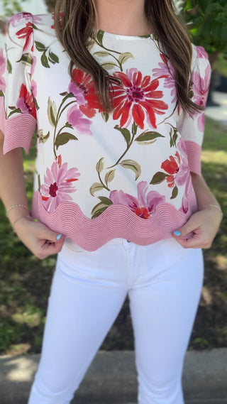• This floral blouse with playful wave hem details is the perfect mix of sweet and stylish. With its breezy cotton fabric and eye-catching green trim, it’s a top that makes you feel put together without even trying.