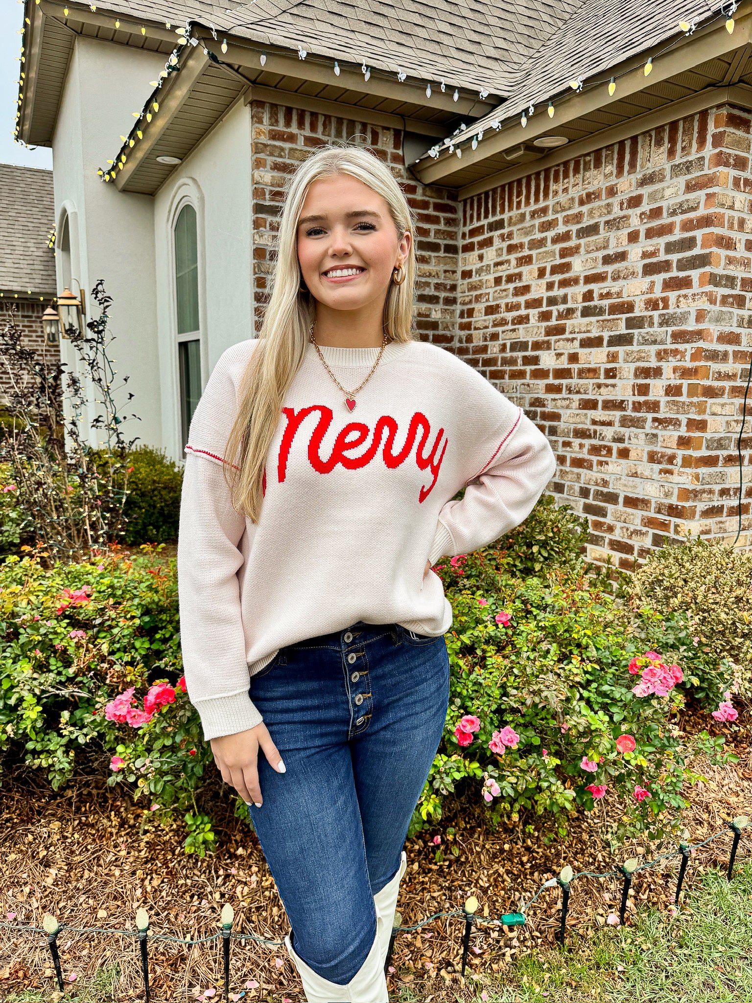 Bring the cheer wherever you go with our bold and cozy Merry Sweater! This bright red knit is the perfect festive staple for the holiday season. With its soft feel, relaxed fit, and playful script detail, it’s an instant mood-booster and the easiest way to stay cute and comfy all December long.