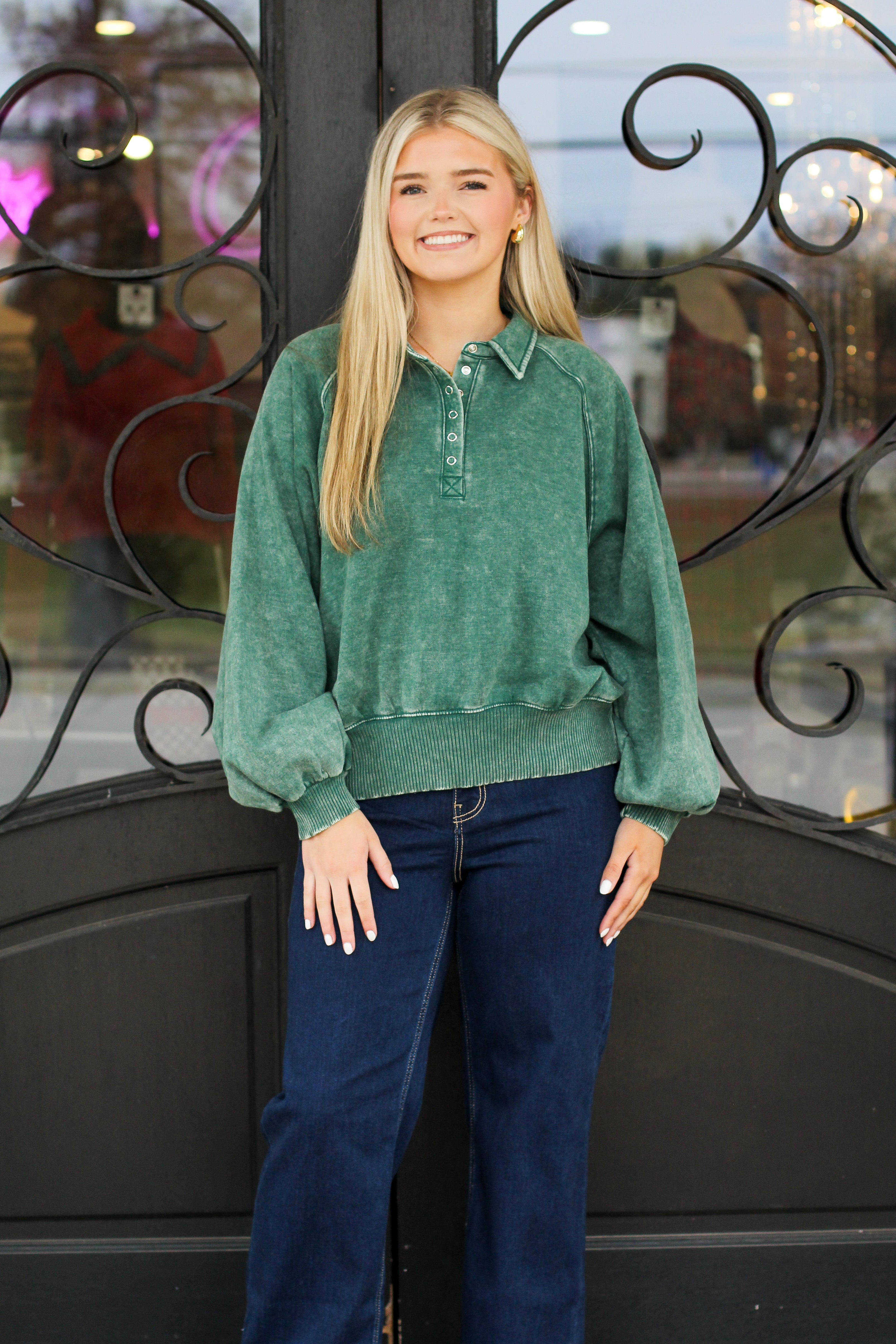 Meet your new everyday favorite! This washed henley-style sweatshirt brings all the cozy vibes with a relaxed fit, soft lived-in fabric, and the cutest button-up neckline. The ribbed cuffs and waistband add the perfect shape, while the subtle mineral wash gives it that effortless vintage look. Easy to throw on with jeans, leggings, or joggers—this one is a must-have staple for cooler days.