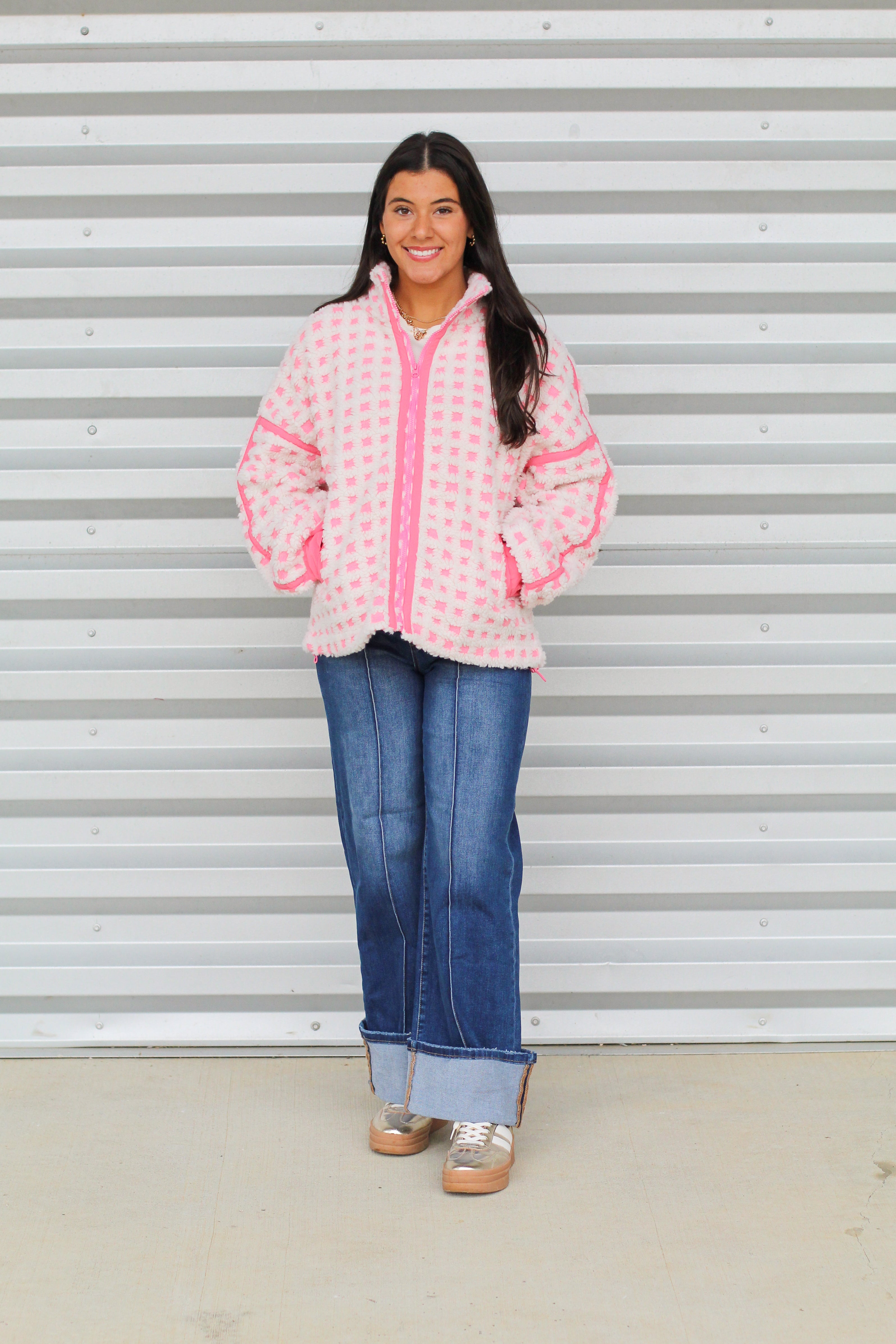 Get wrapped in warmth and cuteness with this ultra-soft checkered sherpa jacket! Designed in a textured cream and pink pattern, this piece is the perfect blend of cozy comfort and playful style. The relaxed, slouchy fit makes it great for layering, while the full front zipper and stand collar keep you snug on chilly days. Finished with contrast pink trim and roomy pockets, it's a winter essential you'll reach for again and again.