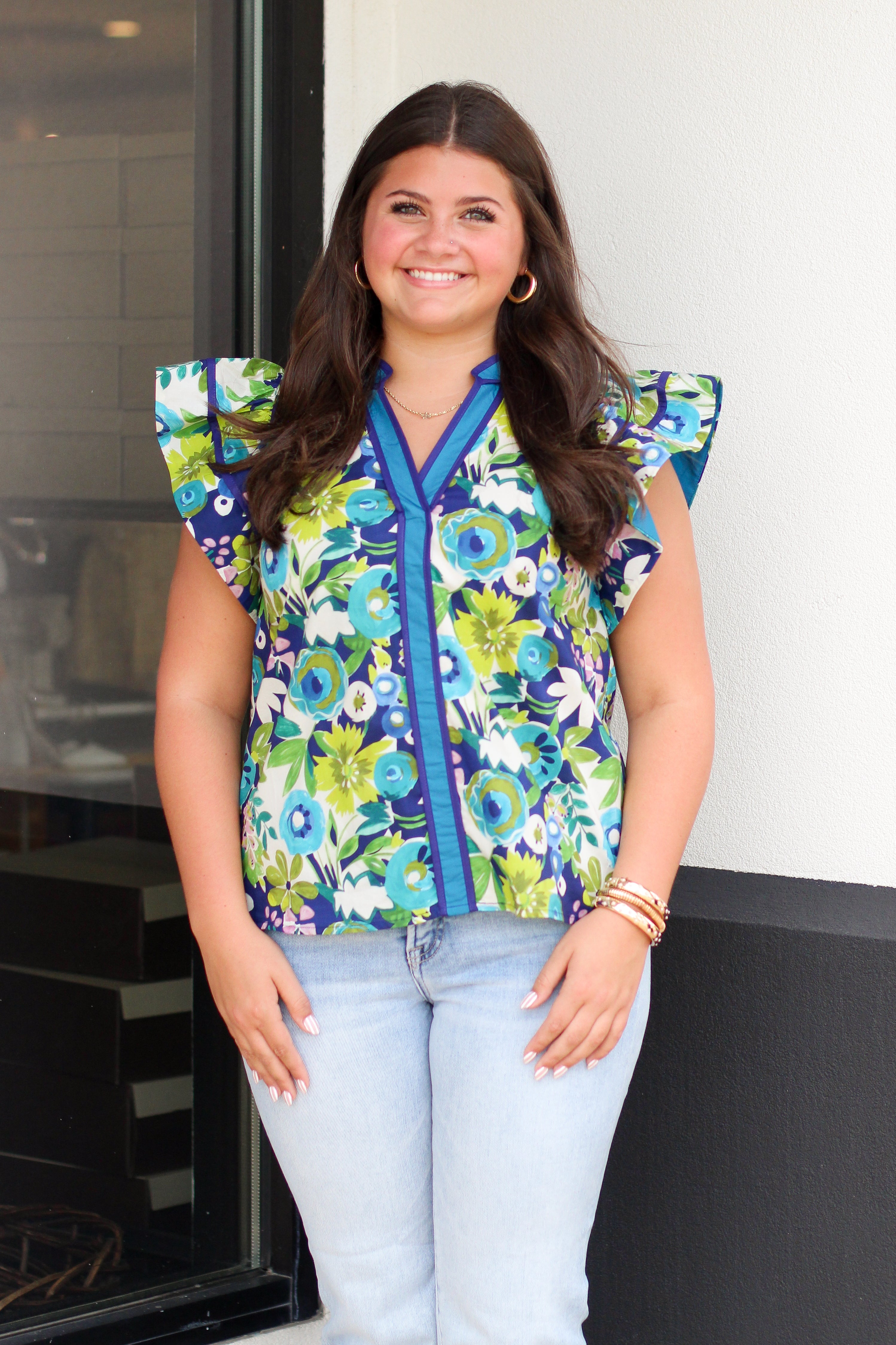 This floral statement top is made for days when you want to stand out without even trying. The bold, colorful print is balanced by a tailored neckline and flutter sleeves, giving it that perfect mix of playful and polished.Fit & Sizing