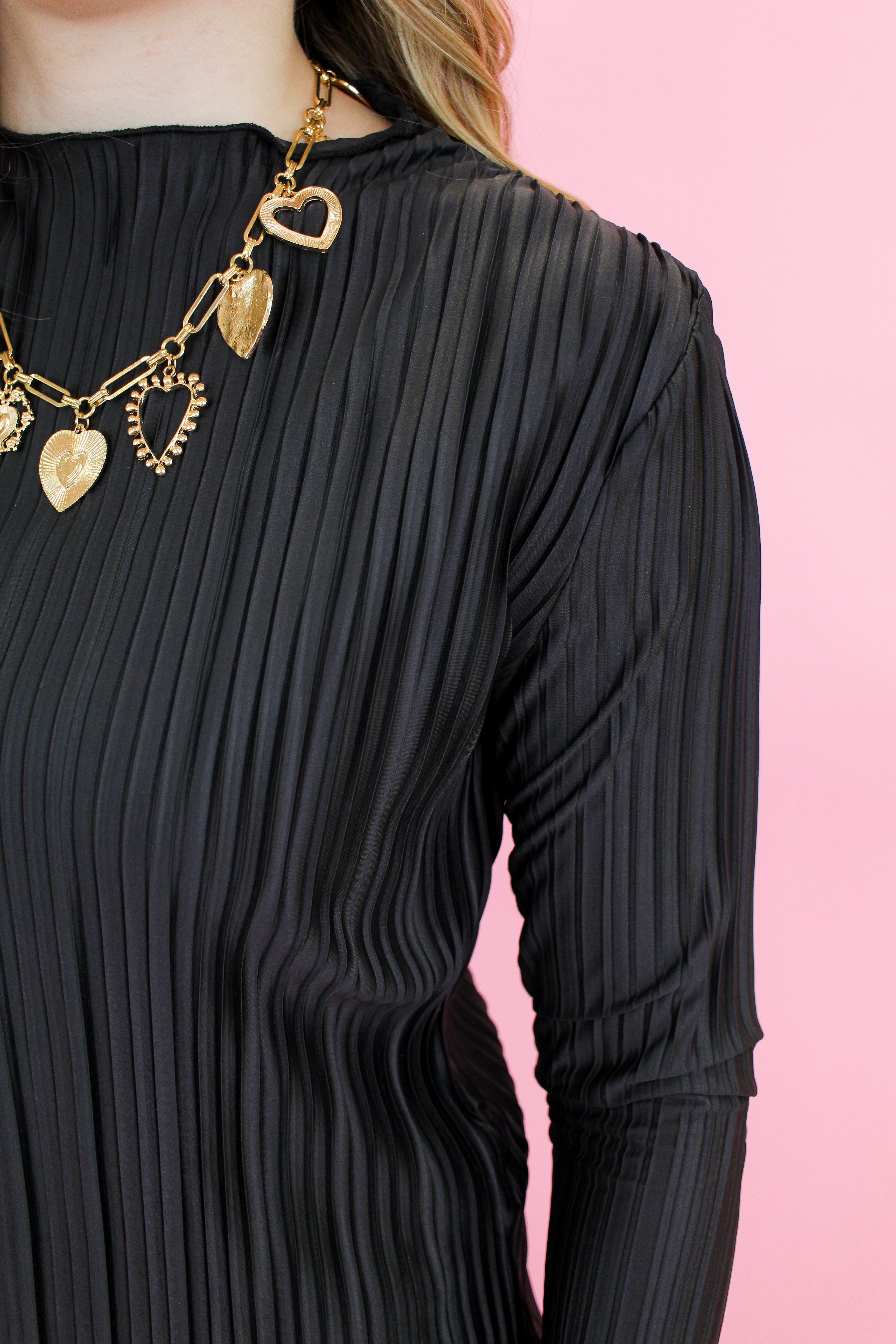 This sleek pleated long sleeve top is a closet staple you’ll reach for again and again. Featuring a flattering high neckline and allover vertical pleating, this top hugs just right while still offering comfortable stretch. Dress it up with faux leather pants or keep it casual with denim—either way, it’s a timeless must-have.