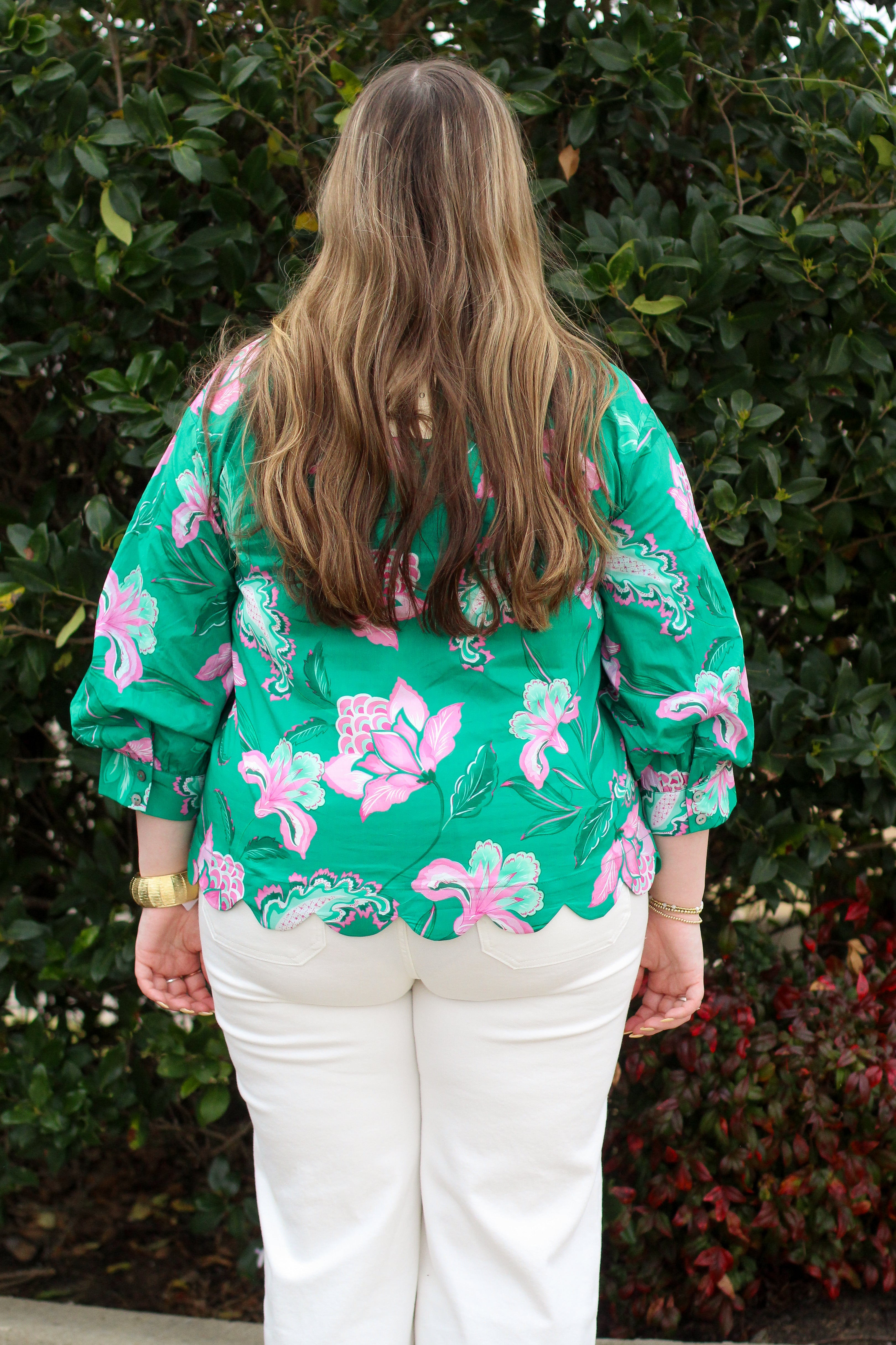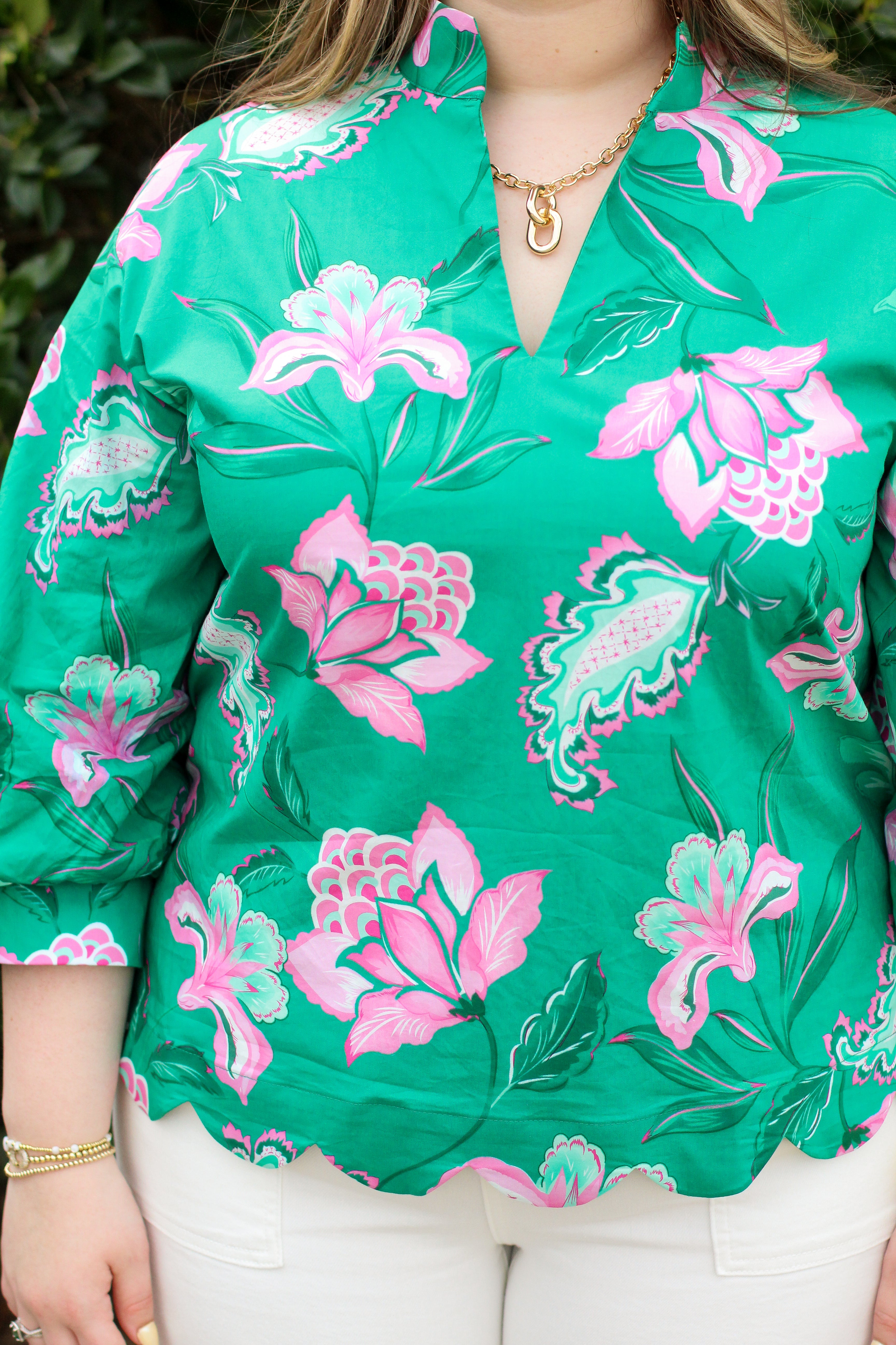 The scalloped hemline and bold floral print give this top that signature boutique feel. The structured collar and three-quarter length sleeves balance the playful print with a polished touch — perfect for pairing with white denim or dress pants for work-to-weekend wear.