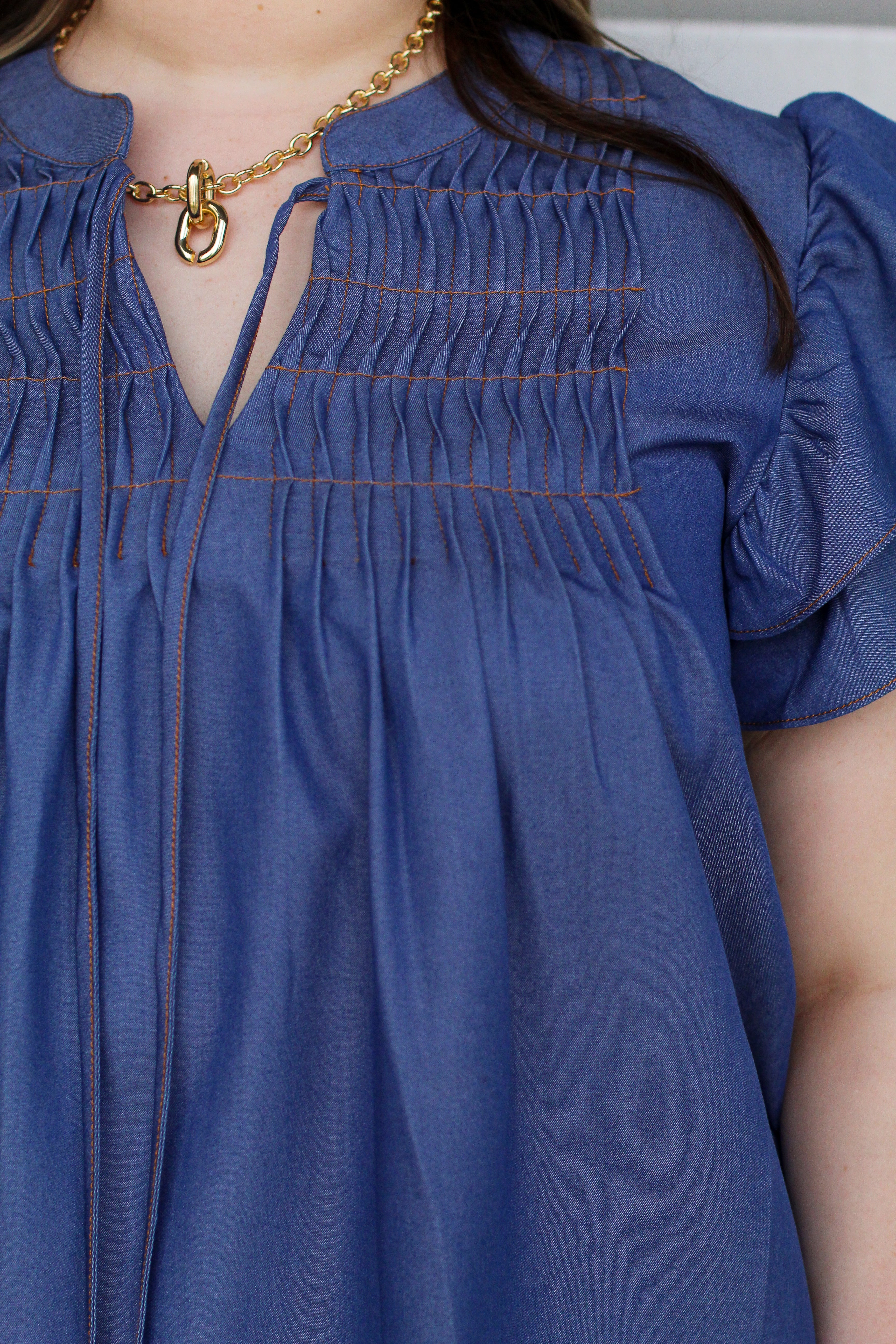 Soft, flowy, and effortlessly flattering — this flutter sleeve blouse is a must-have for everyday wear. The delicate smocked detailing across the chest adds texture and interest, while the relaxed silhouette keeps it comfortable and easy to style. The subtle contrast stitching and tie neckline give it just the right amount of boutique charm.