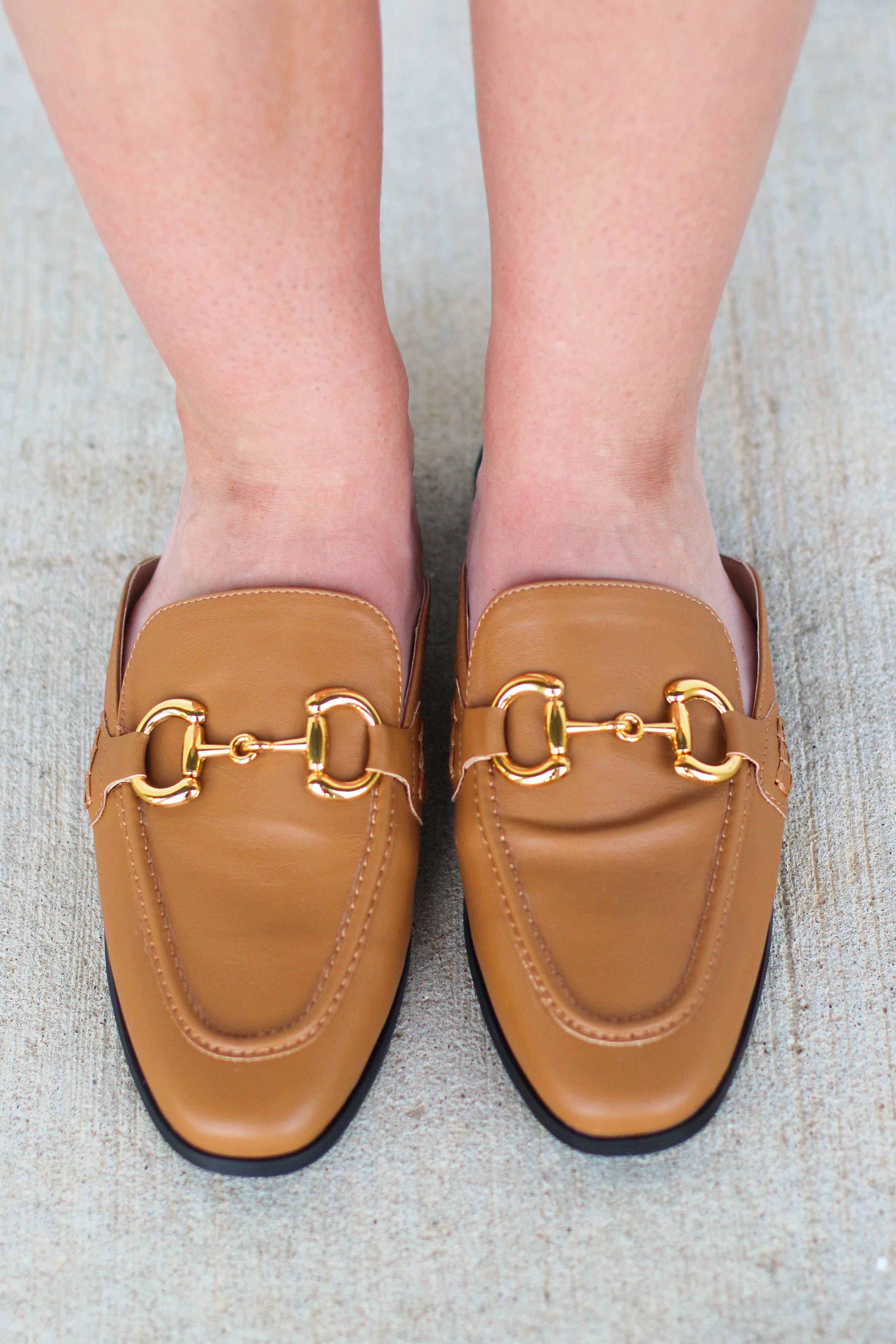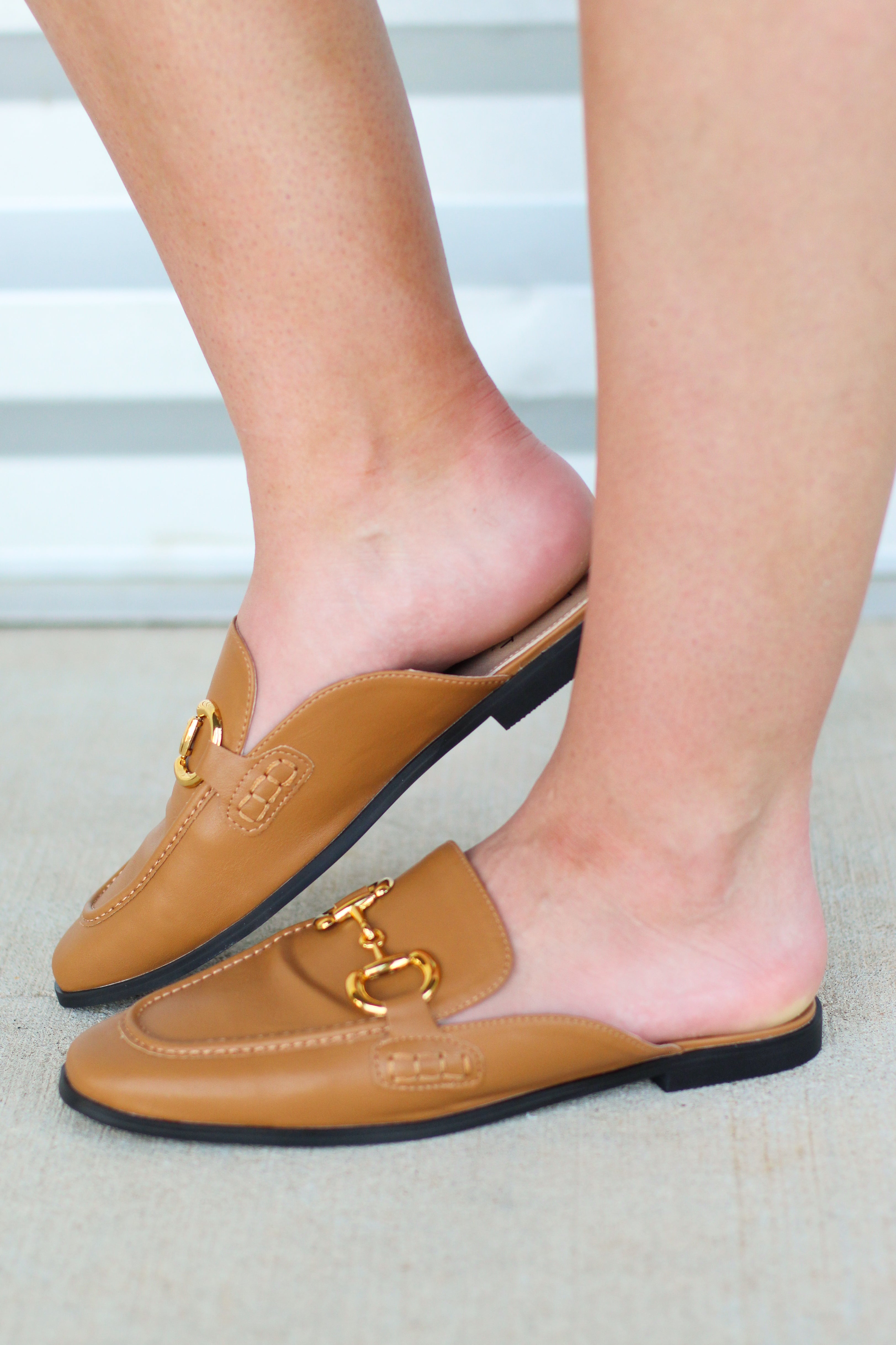 Step into effortless elegance with these chic slip-on mules. The timeless design and rich camel hue make them an easy go-to for work, brunch, or a casual night out. Gold horse-bit detailing gives them a polished, designer-inspired finish, while the easy slide-on style keeps them practical and comfy for everyday wear.Fit & Sizing: