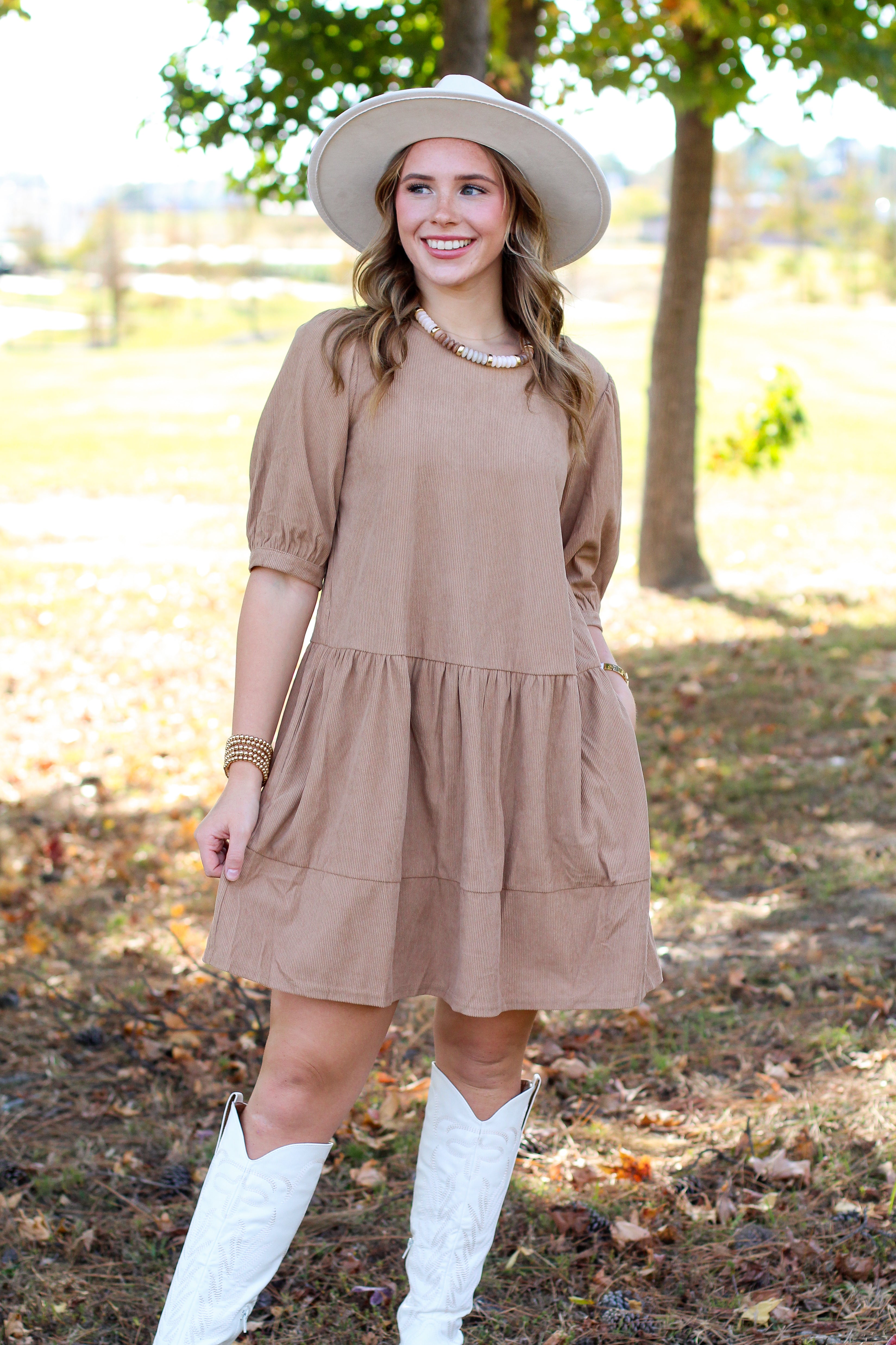 Effortlessly chic and cozy for fall, this tiered corduroy dress is a timeless favorite! With its soft texture and easy silhouette, it’s perfect for everything from Sunday brunch to fall photoshoots. Pair it with boots and a hat for the ultimate autumn look.