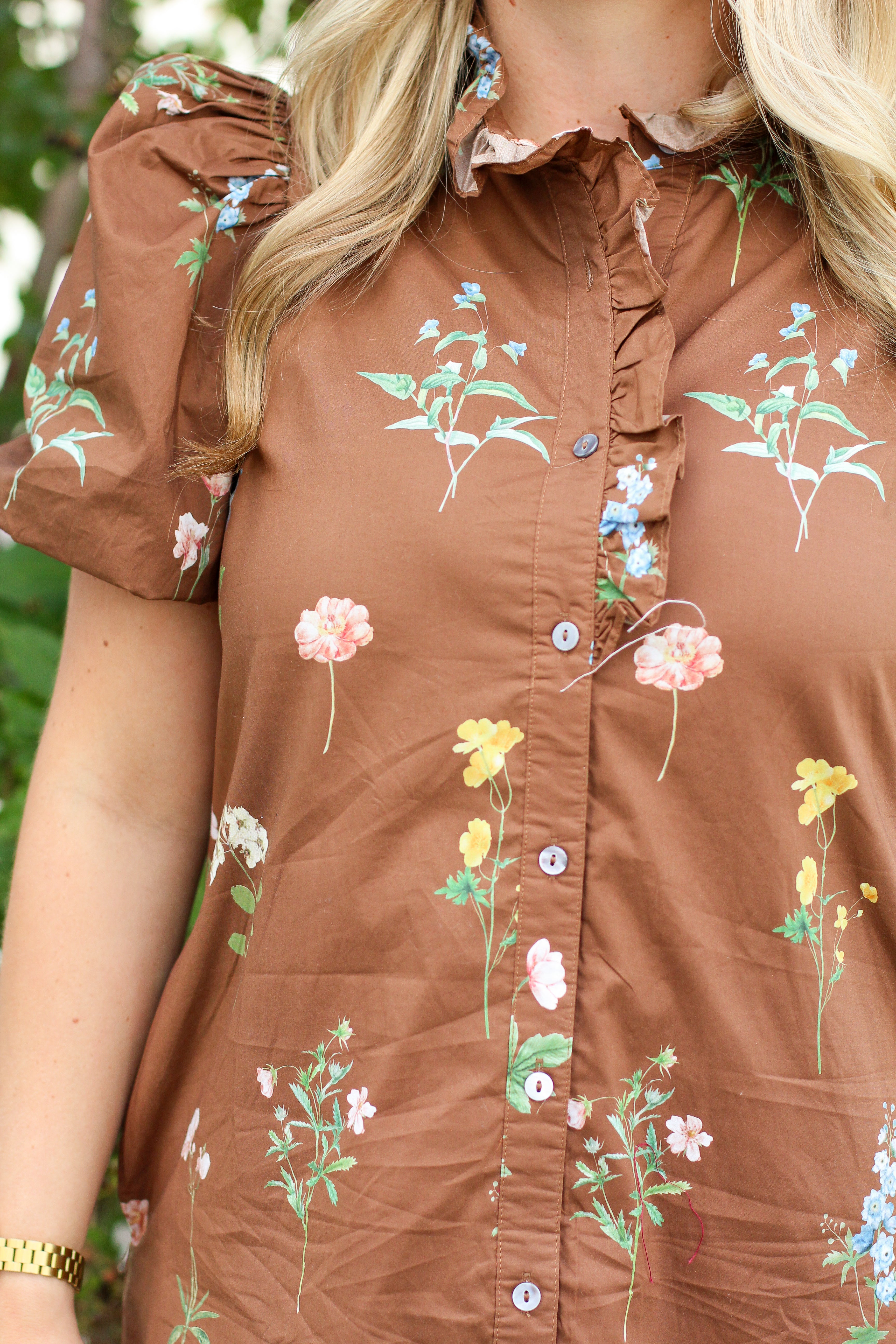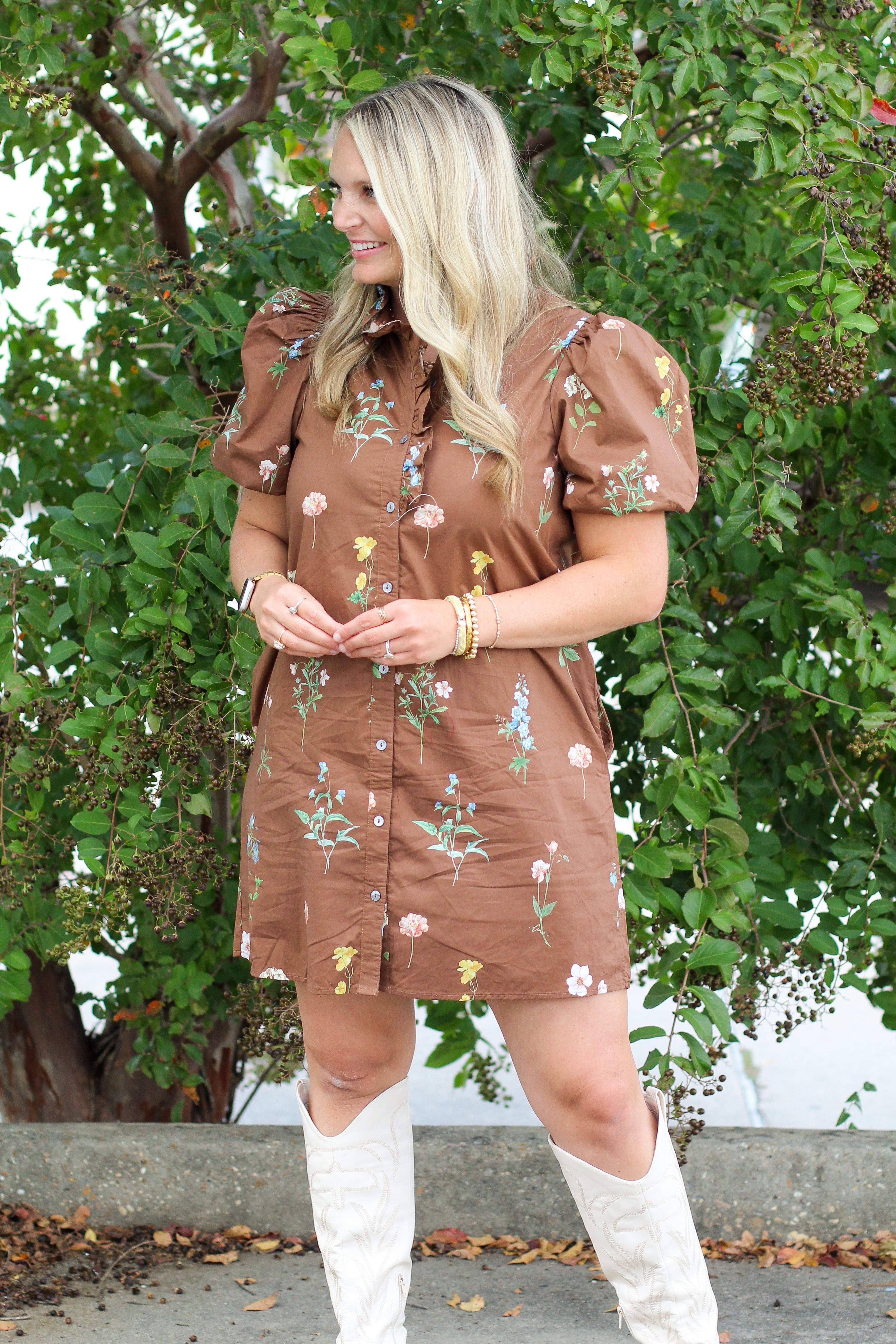 This dress combines timeless charm with everyday ease. The earthy brown backdrop with delicate floral prints makes it both versatile and eye-catching. Ruffle trim details at the neckline and puff sleeves add a feminine, playful touch that transitions seamlessly from daytime outings to special events.