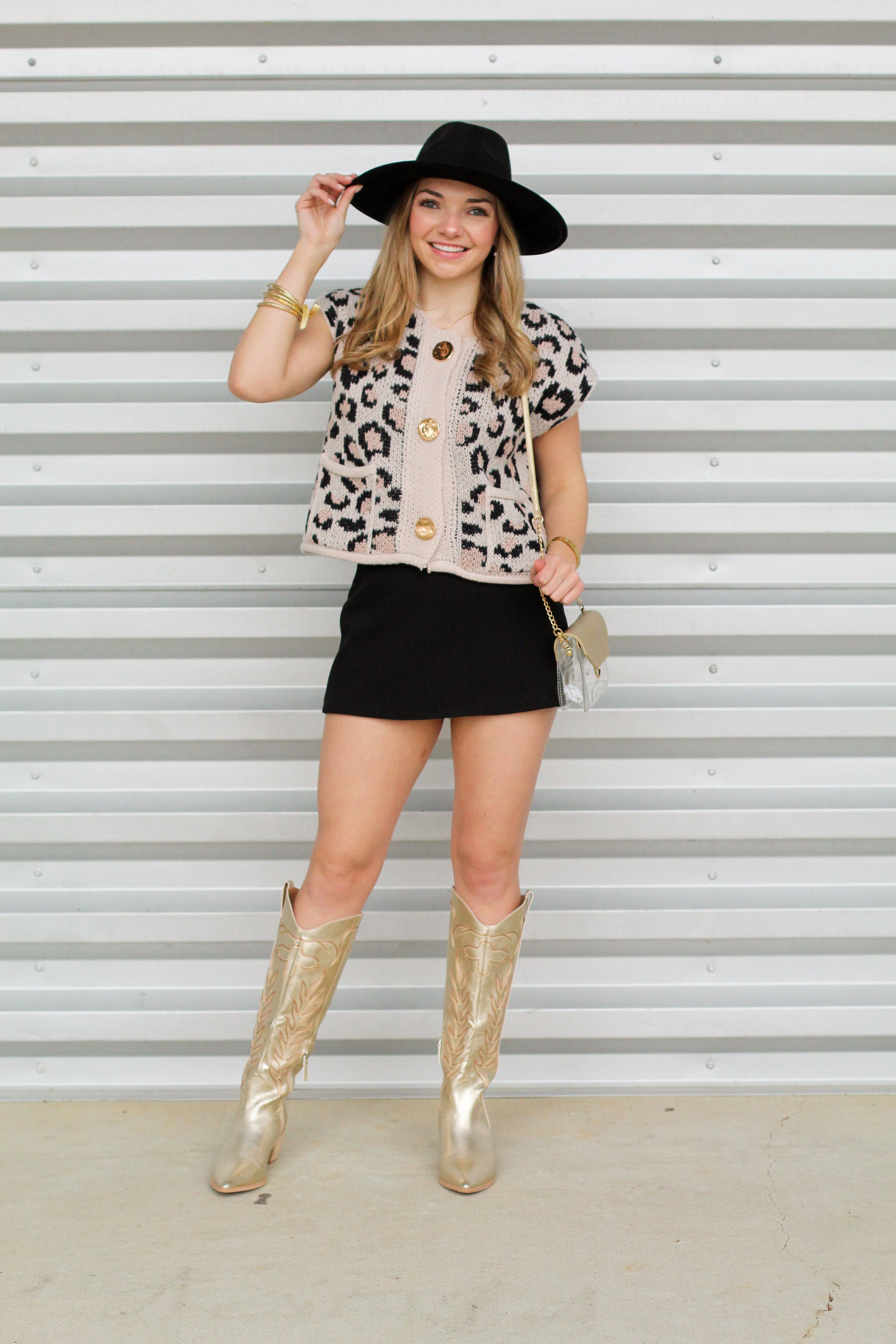 This statement knit vest brings bold style with an easy, flattering fit. Designed with a neutral base and eye-catching leopard print, this sleeveless piece features oversized gold buttons, functional front pockets, and a slightly cropped silhouette that pairs perfectly with skirts, denim, or layered over a fitted top. It’s the ultimate throw-on-and-go piece with a chic edge.