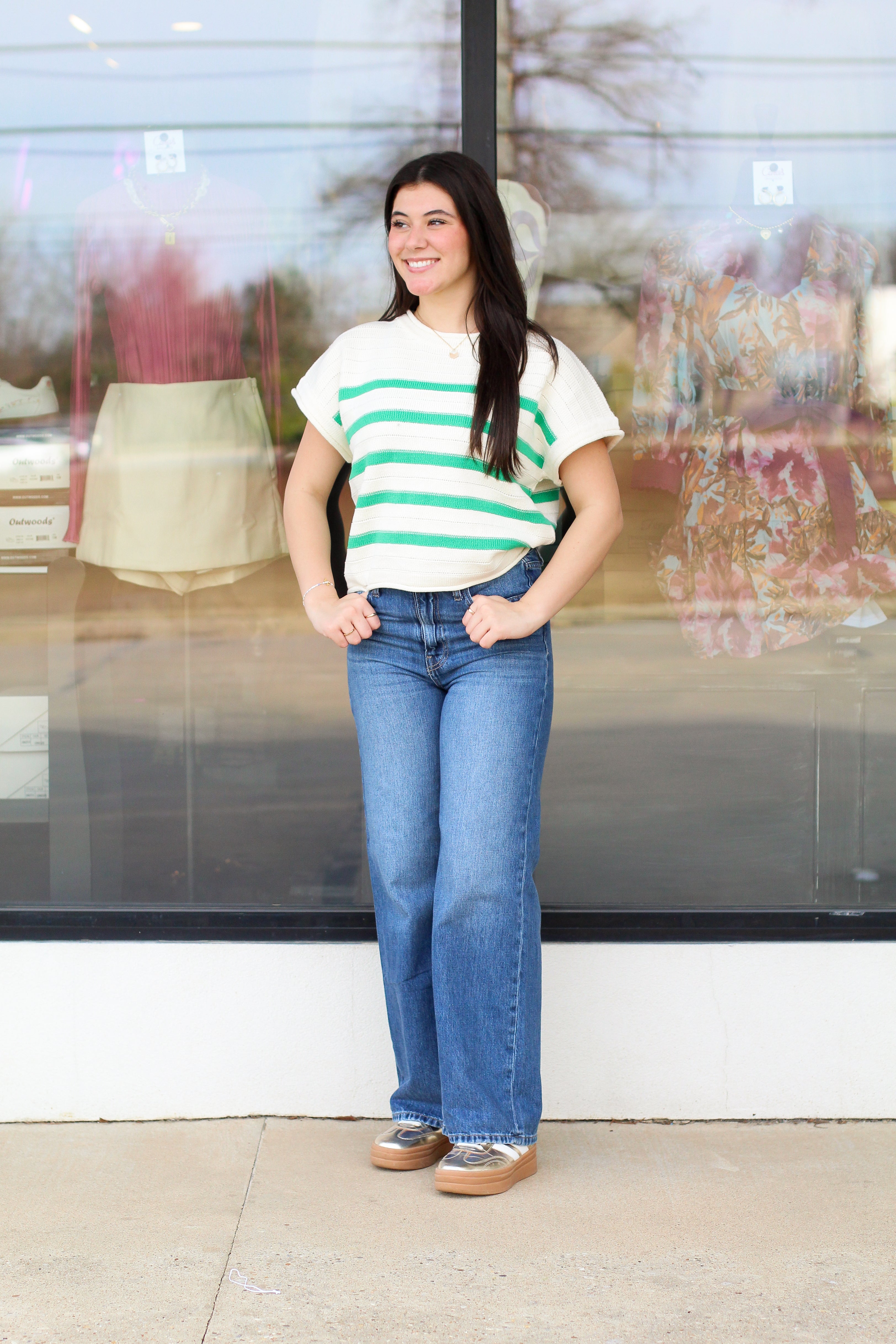 This short sleeve striped knit top is lightweight, comfortable, and effortless to style. It’s the kind of piece you can throw on and instantly feel polished without overthinking your outfit.