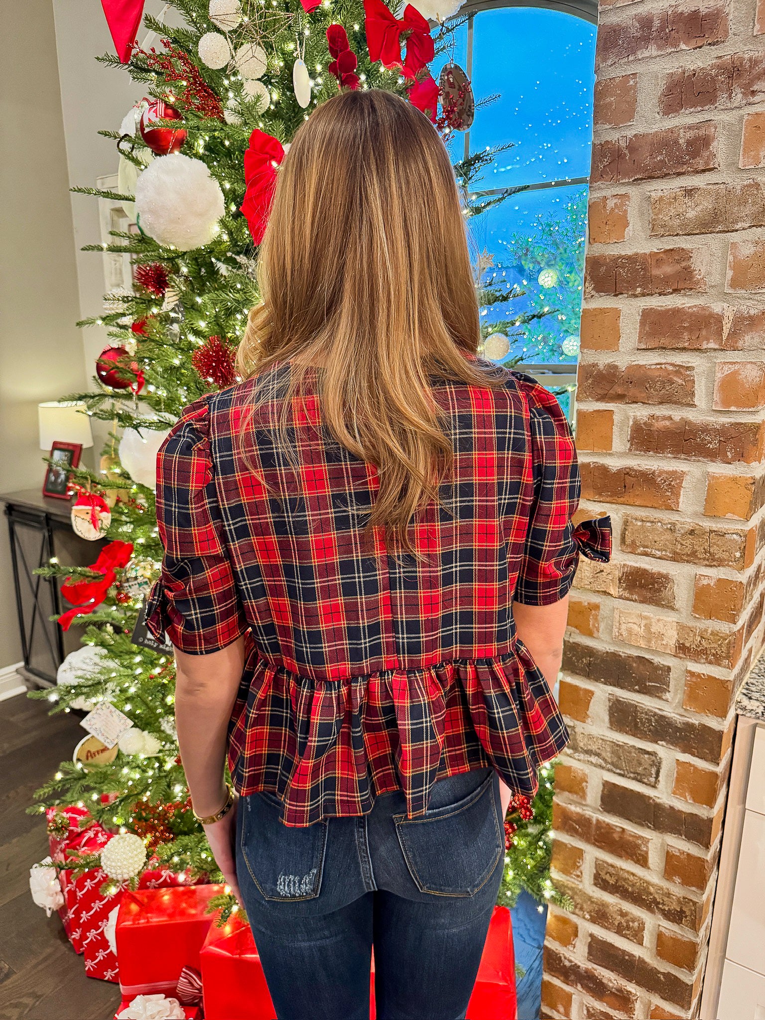 Festive, feminine, and ready for every holiday moment—this plaid peplum top is an absolute Christmas classic. Featuring a rich red and navy tartan print, this darling blouse is designed with puff sleeves, ruched details, and a flattering peplum waist that gives you the perfect amount of shape. Whether you're wrapping gifts, hosting family, or heading to a holiday party, this top brings cheer to every outfit.
