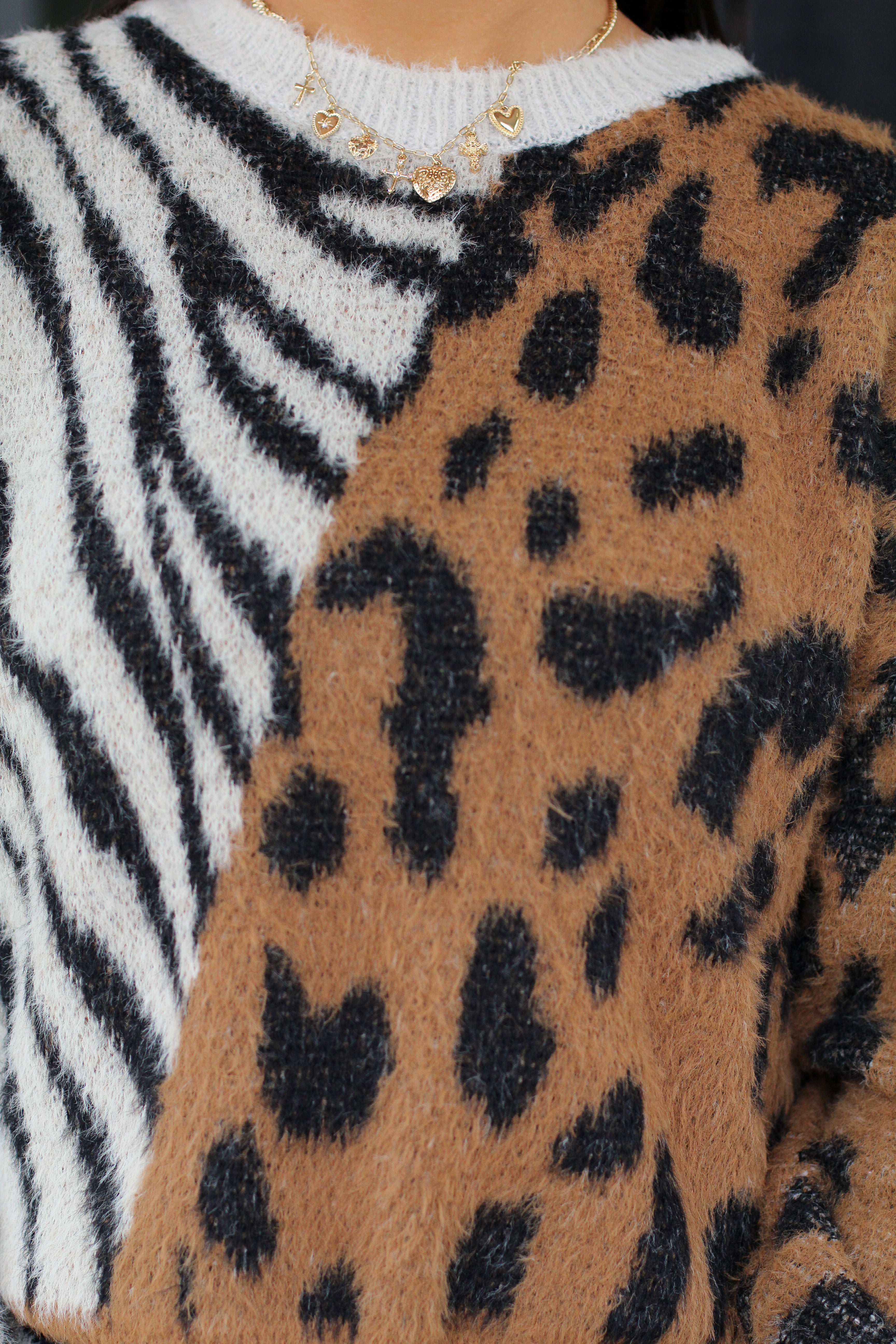 Make a bold statement this season with our Wild Mix Sweater, where cozy meets fierce. This playful pullover combines striking zebra and leopard patterns for a unique, eye-catching look that instantly elevates your everyday style. Soft, warm, and full of personality, it’s the perfect piece for staying cute and cozy on chilly days.
