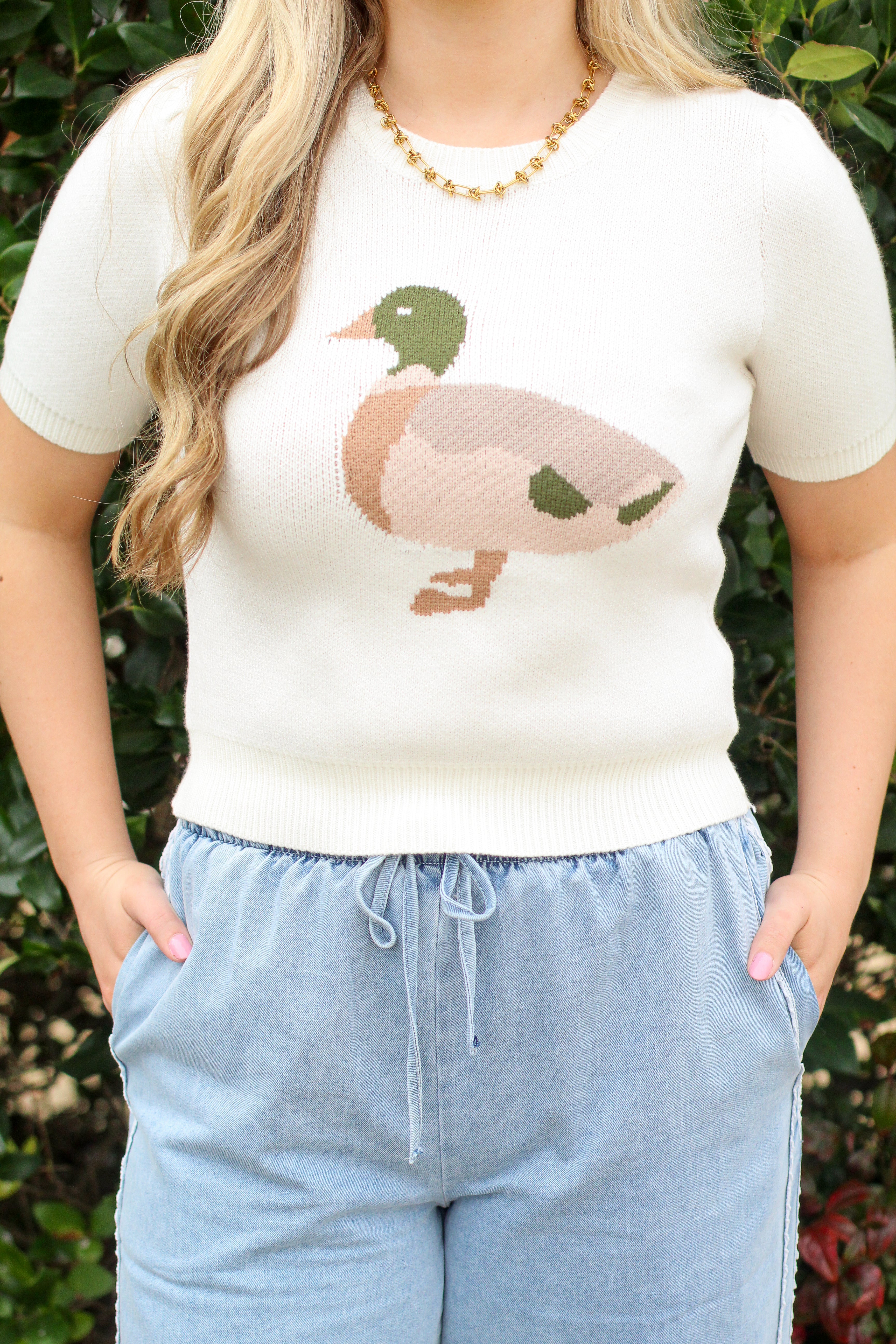 This playful knit top is the cutest mix of cozy and charming! Featuring a soft neutral base with an adorable duck graphic, this short-sleeve sweater tee is lightweight, comfy, and perfect for everyday wear. The relaxed fit makes it easy to dress up or down—pair it with denim, skirts, or your favorite casual bottoms for an effortlessly fun look.
